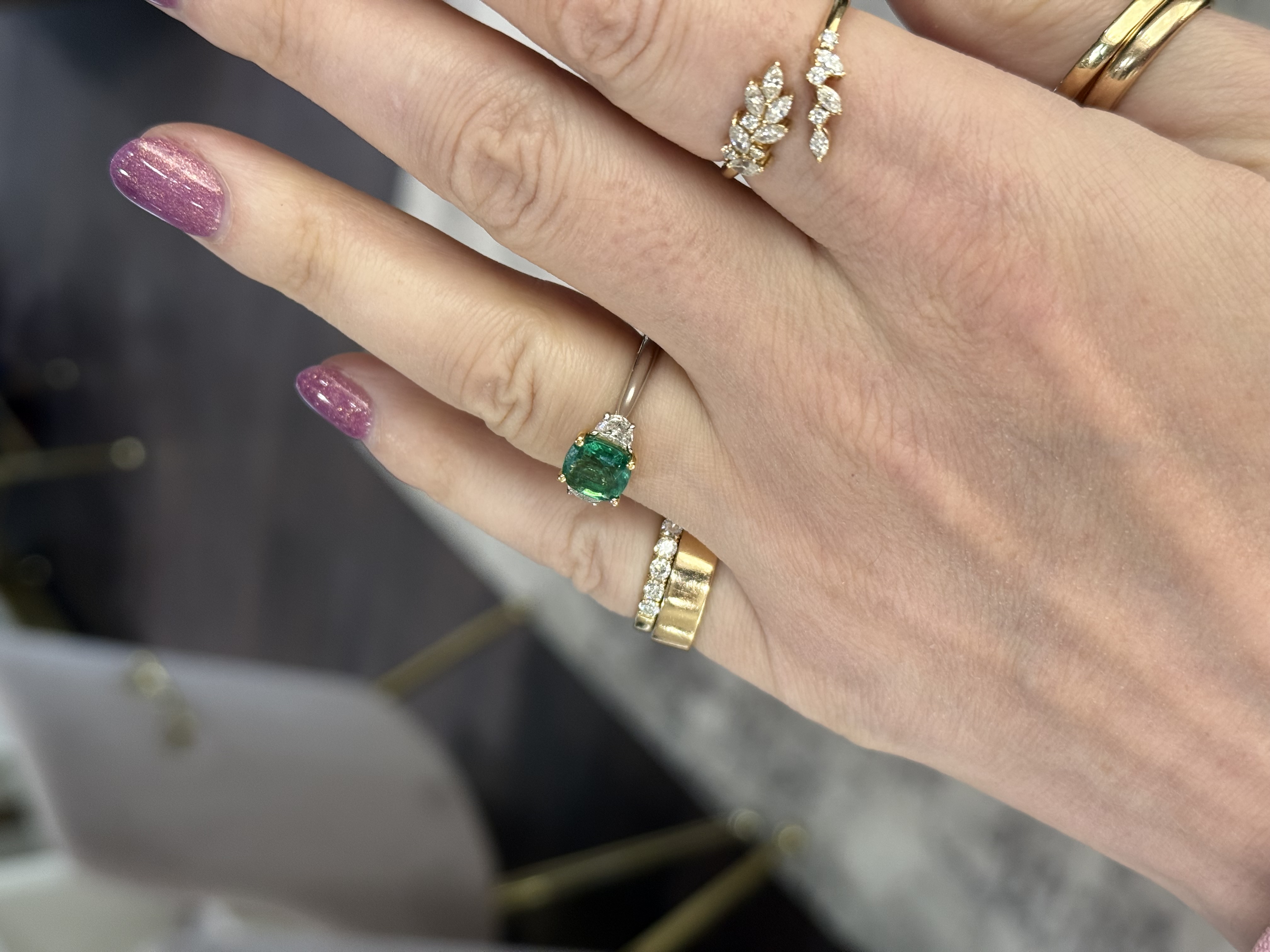 PLATINUM & 18KY GOLD THREE-STONE EMERALD & DIAMOND RING