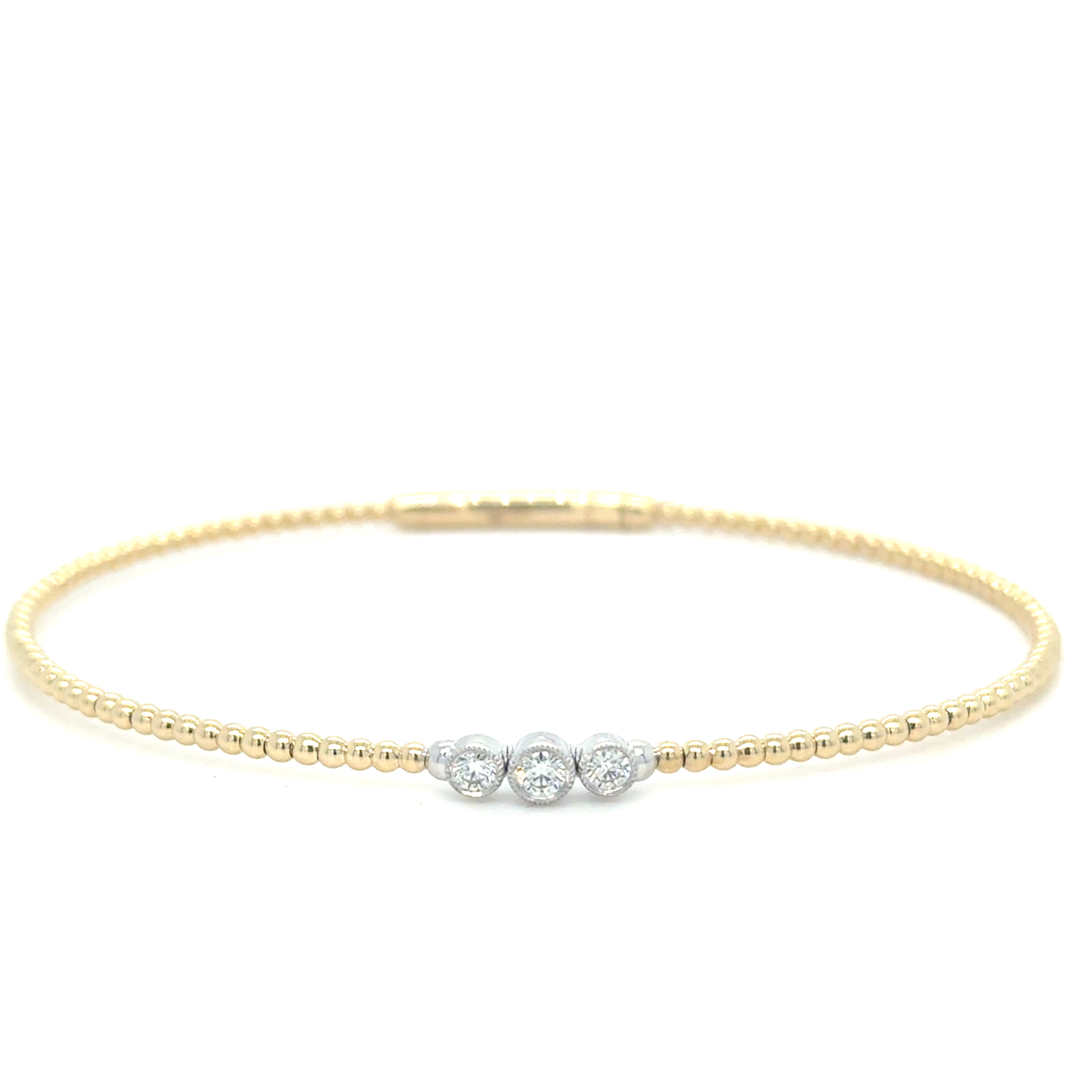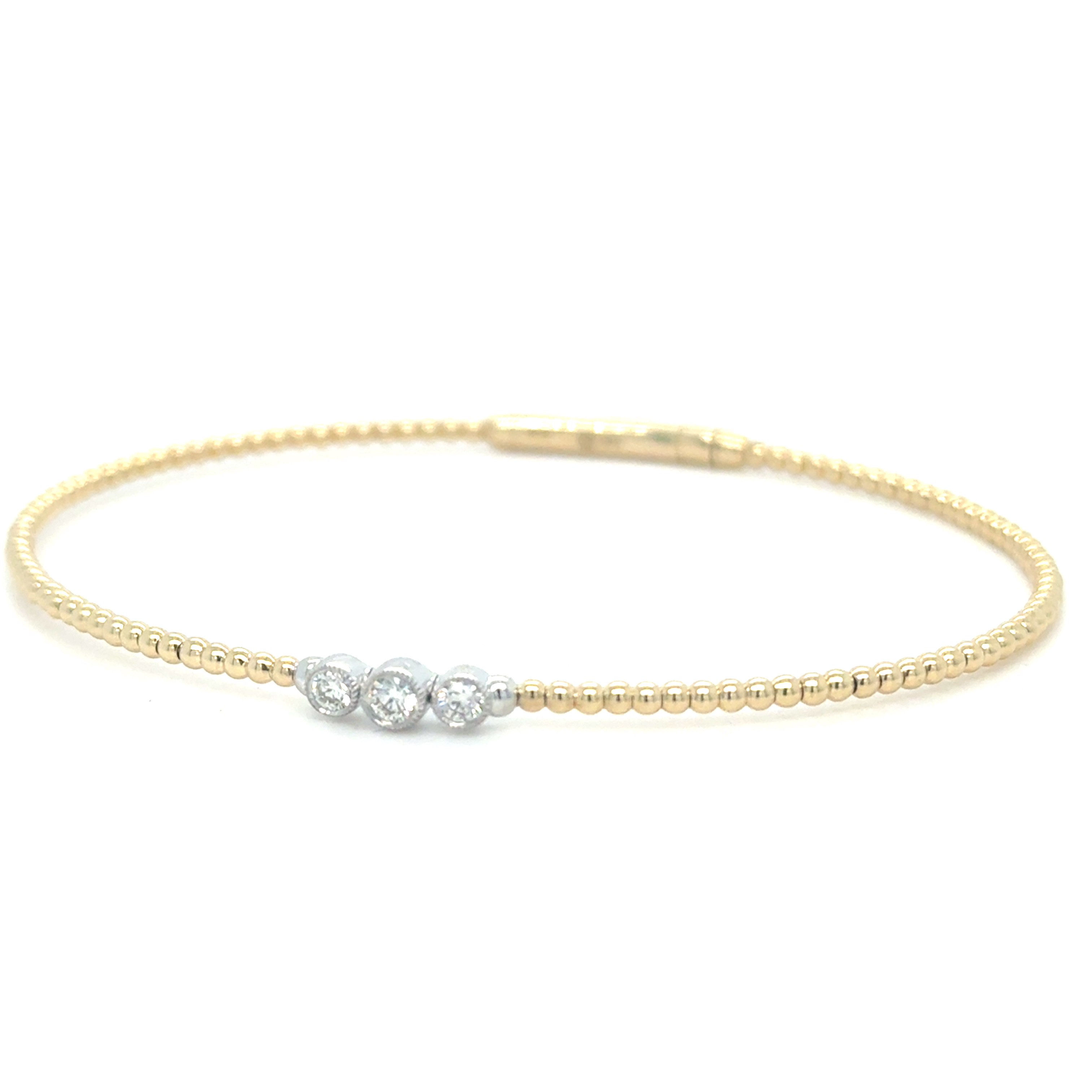 14KY&W GOLD FLEXIBLE BEADED BANGLE BRACELET WITH BEZEL-SET DIAMOND TRIO STATION