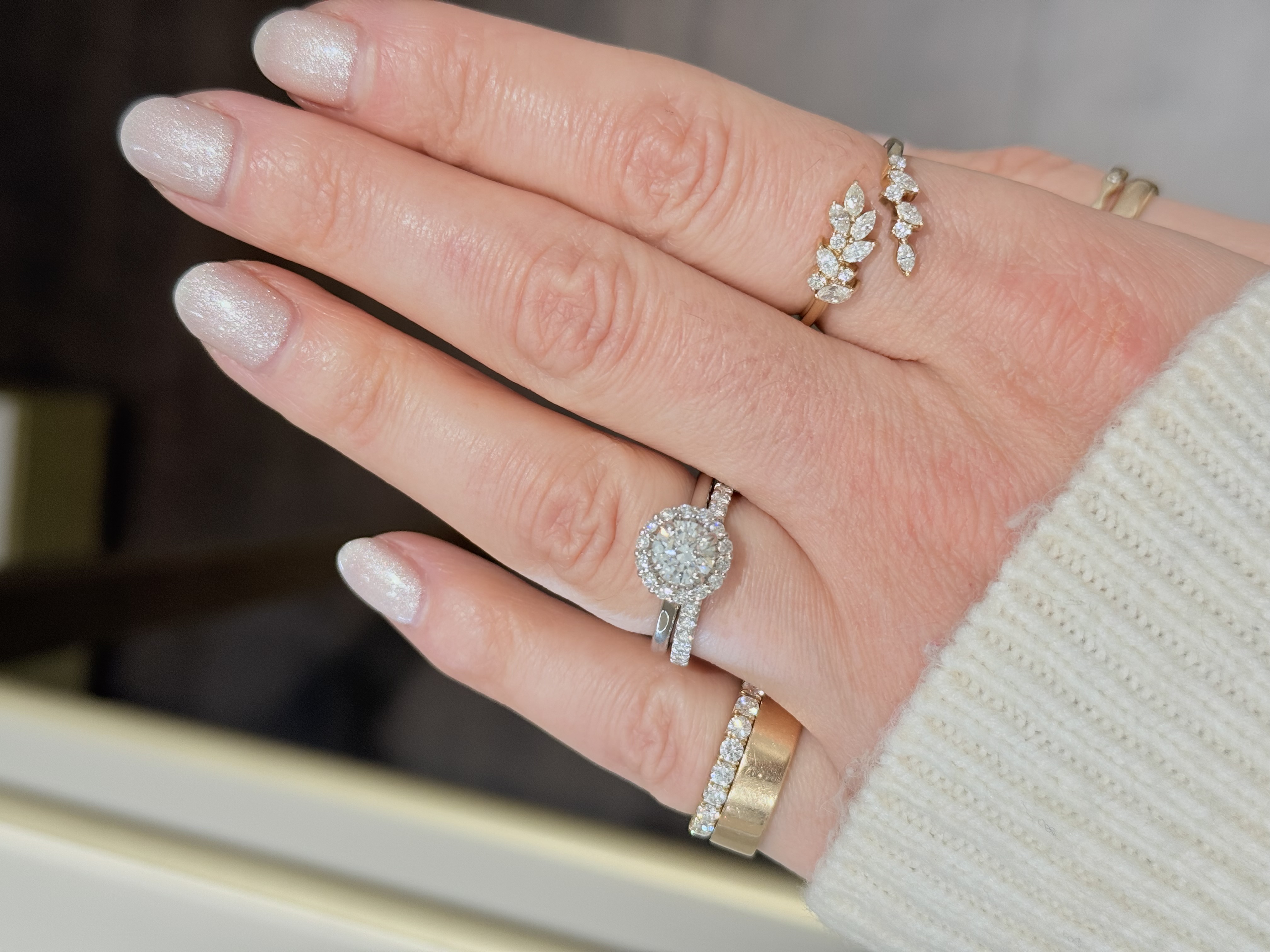 14KW GOLD "SUMMERWIND COLLECTION" 1.00CT ROUND BRILLIANT CUT DIAMOND ENGAGEMENT RING WITH DIAMOND HALO, FINGER SIZE 7