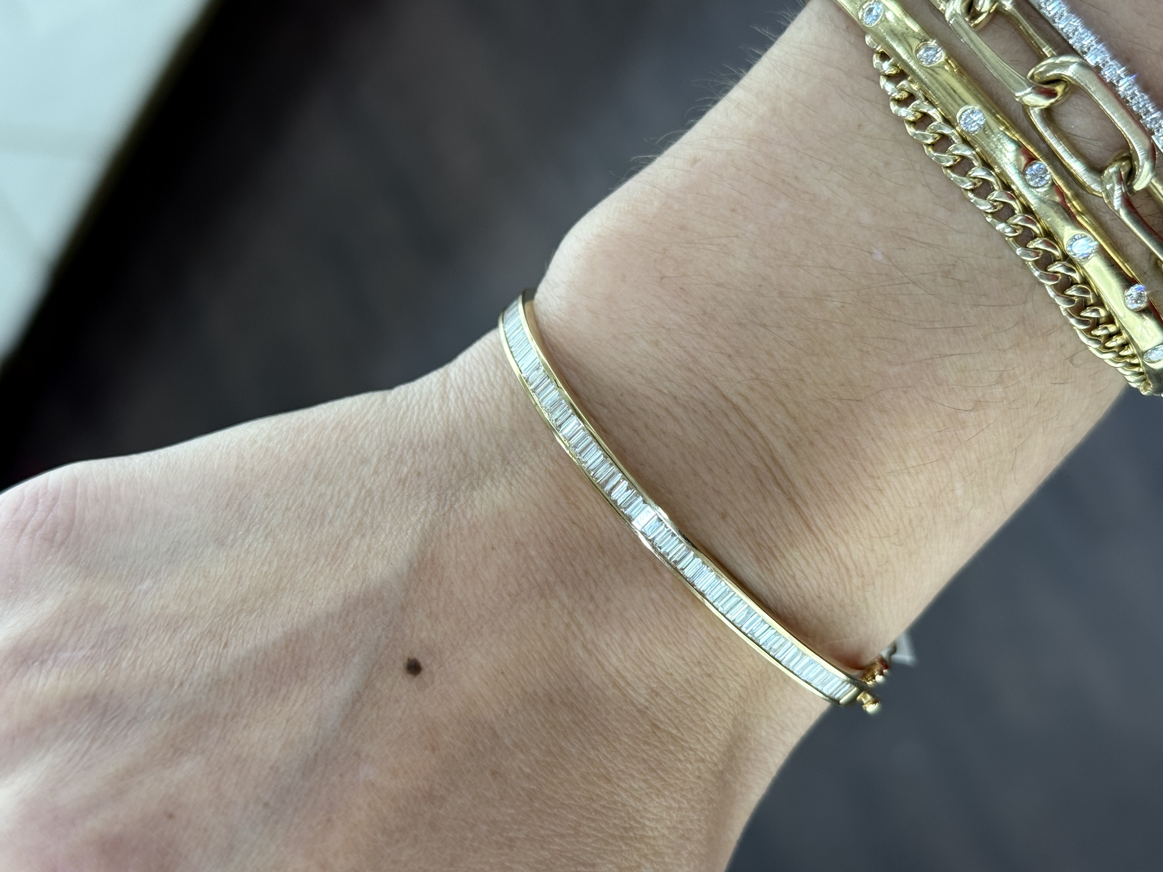 Description 14KY GOLD 1.00CTTW BAGUETTE DIAMOND BANGLE BRACELET 14KT YELLOW GOLD- 585, HIGH POLISH1.02CTTW BAGUETTE CUT DIAMONDS G COLOR, SI3 CLARITY, CHANNEL SET HIDDEN BOX AND SAFETY CLASP CLOSURE