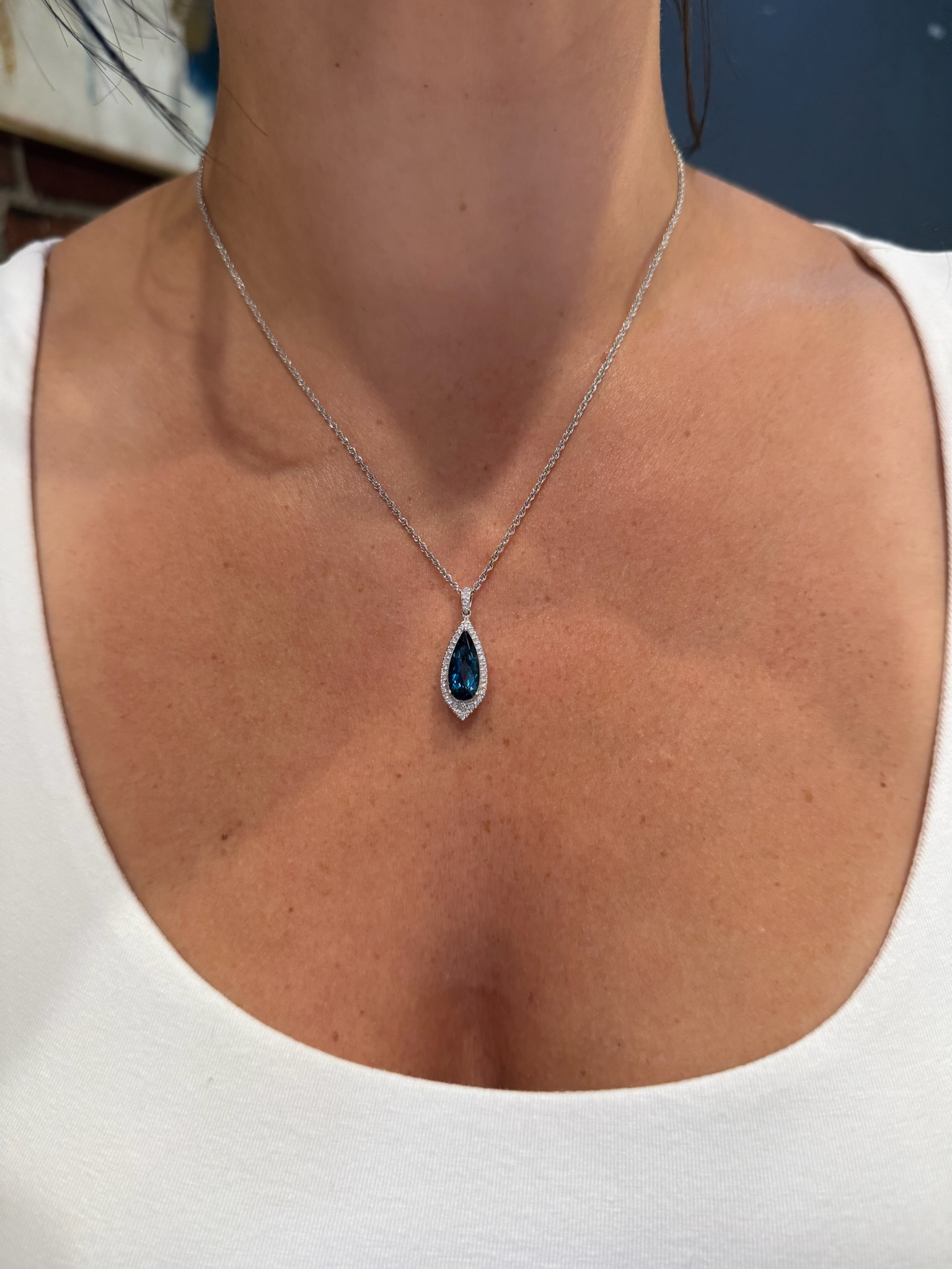 Elevate your elegance with this exquisite 14KT White Gold pendant, featuring a mesmerizing 2.40ct pear-shaped London Blue Topaz, cradled in a sophisticated setting that radiates luxury. The deep, captivating hue of the Topaz is a symbol of depth and stability, making this piece not just an accessory, but a treasure of timeless beauty. Surrounded by 41 round brilliant cut diamonds totaling .25CTTW, each diamond has been meticulously selected for its G color and SI1-2 clarity, ensuring your pendant sparkles with unparalleled brilliance from every angle.
