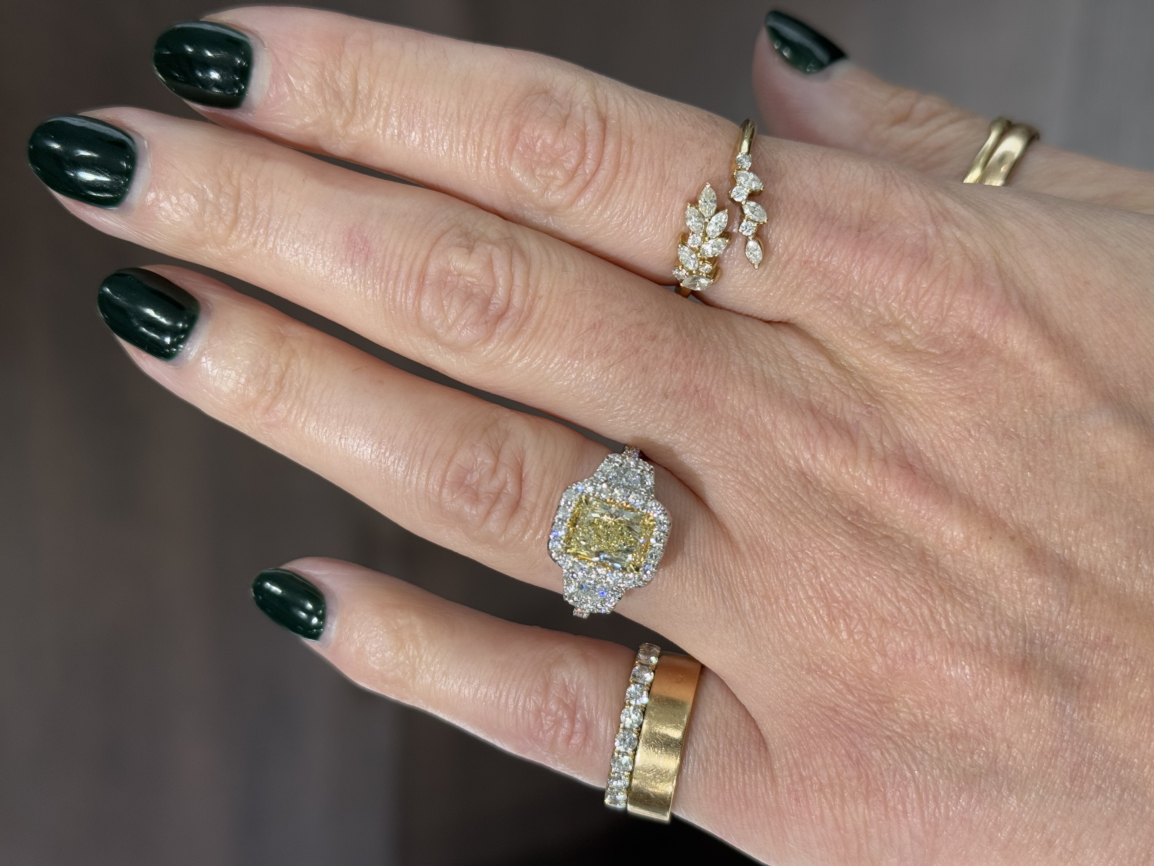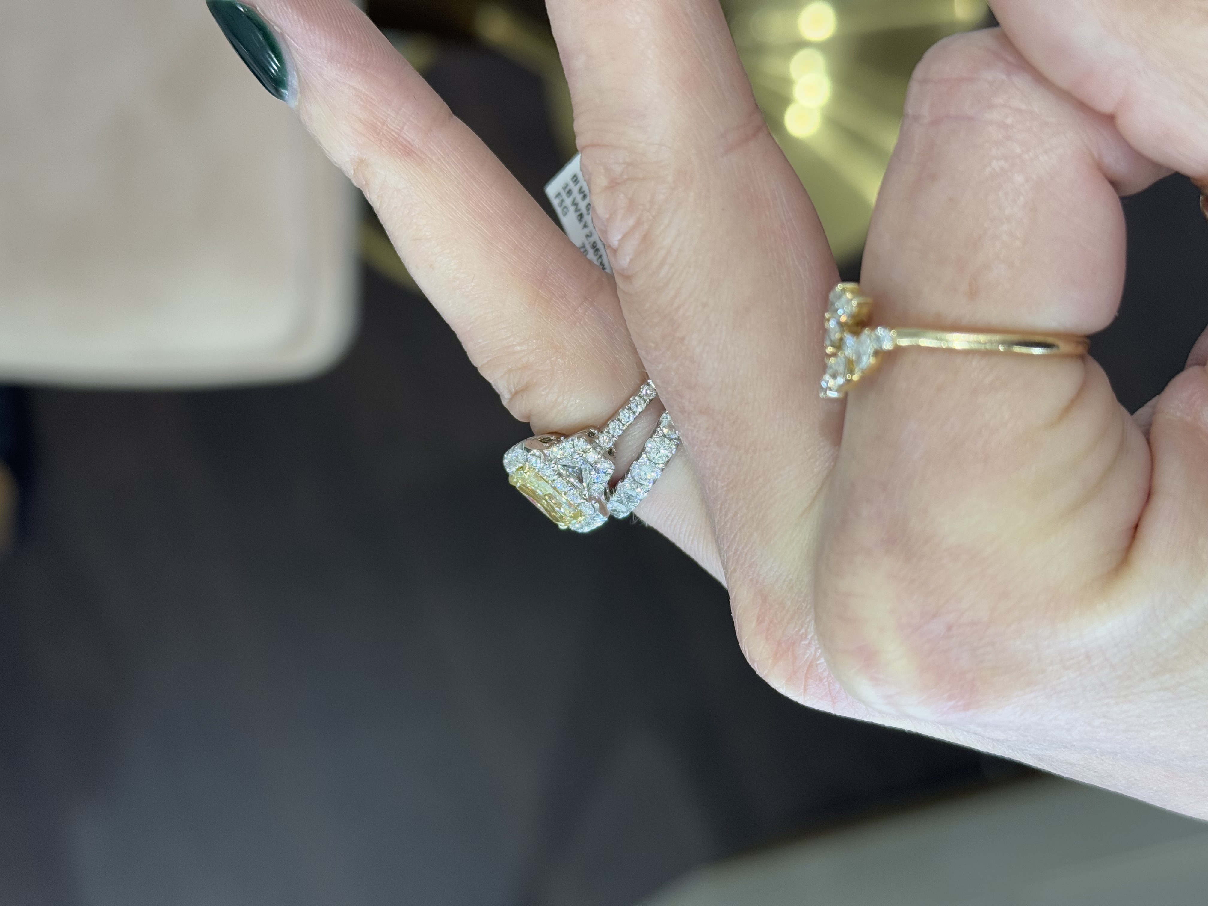 18KW&Y GOLD 2.02CT RADIANT CUT YELLOW DIAMOND & WHITE DIAMOND THREE-STONE RING ACCENTED BY DIAMOND HALOS AND SHANK