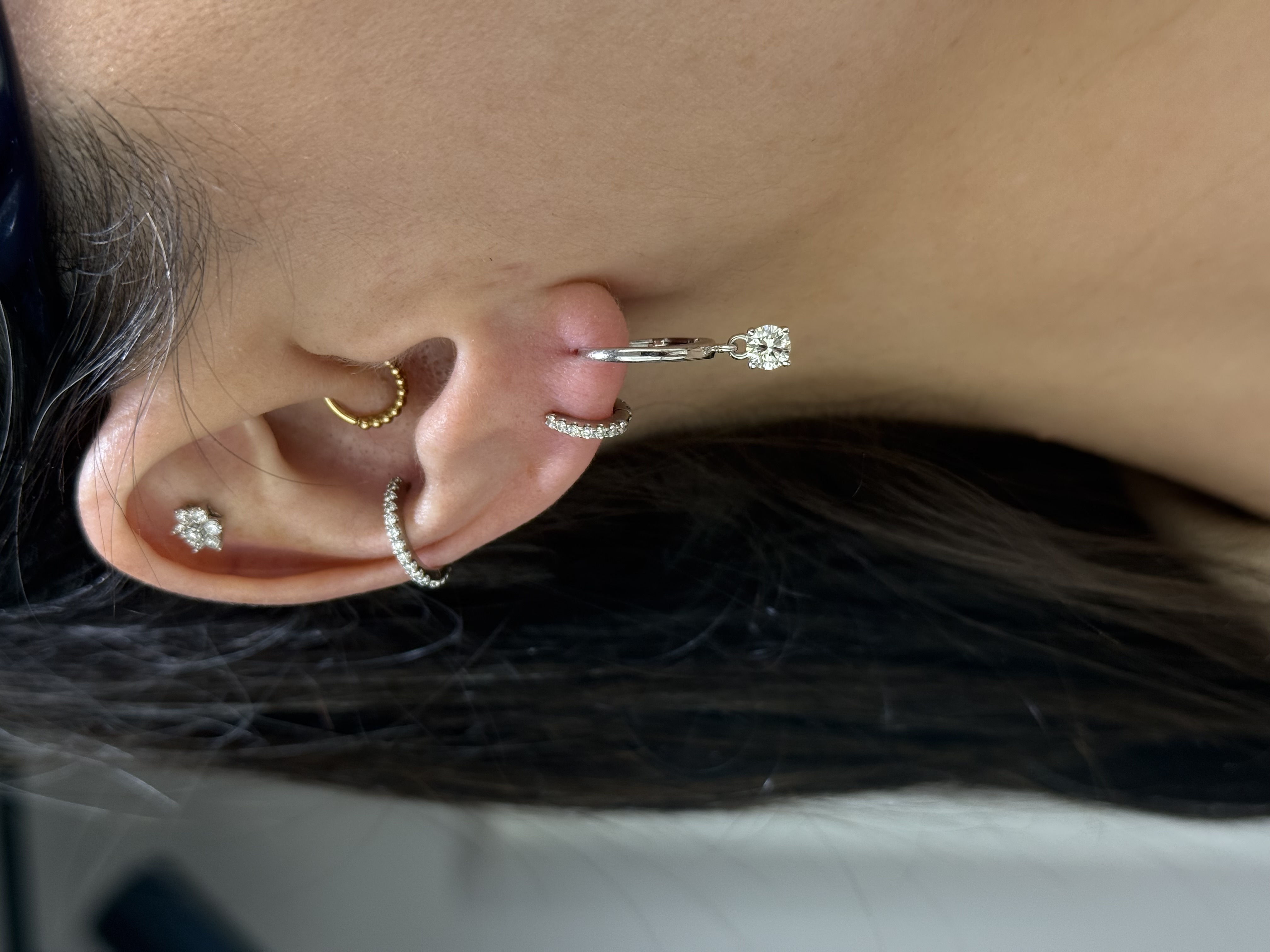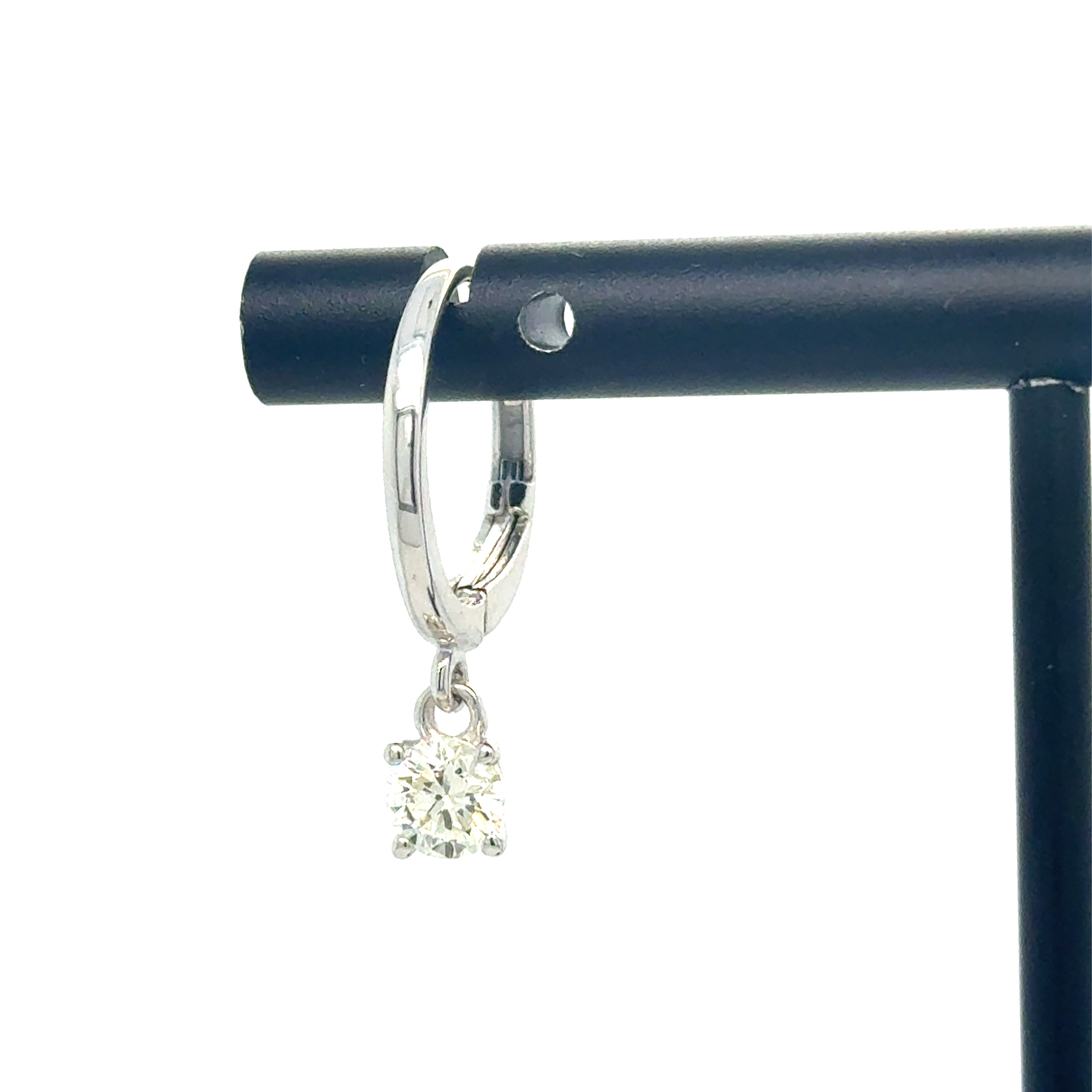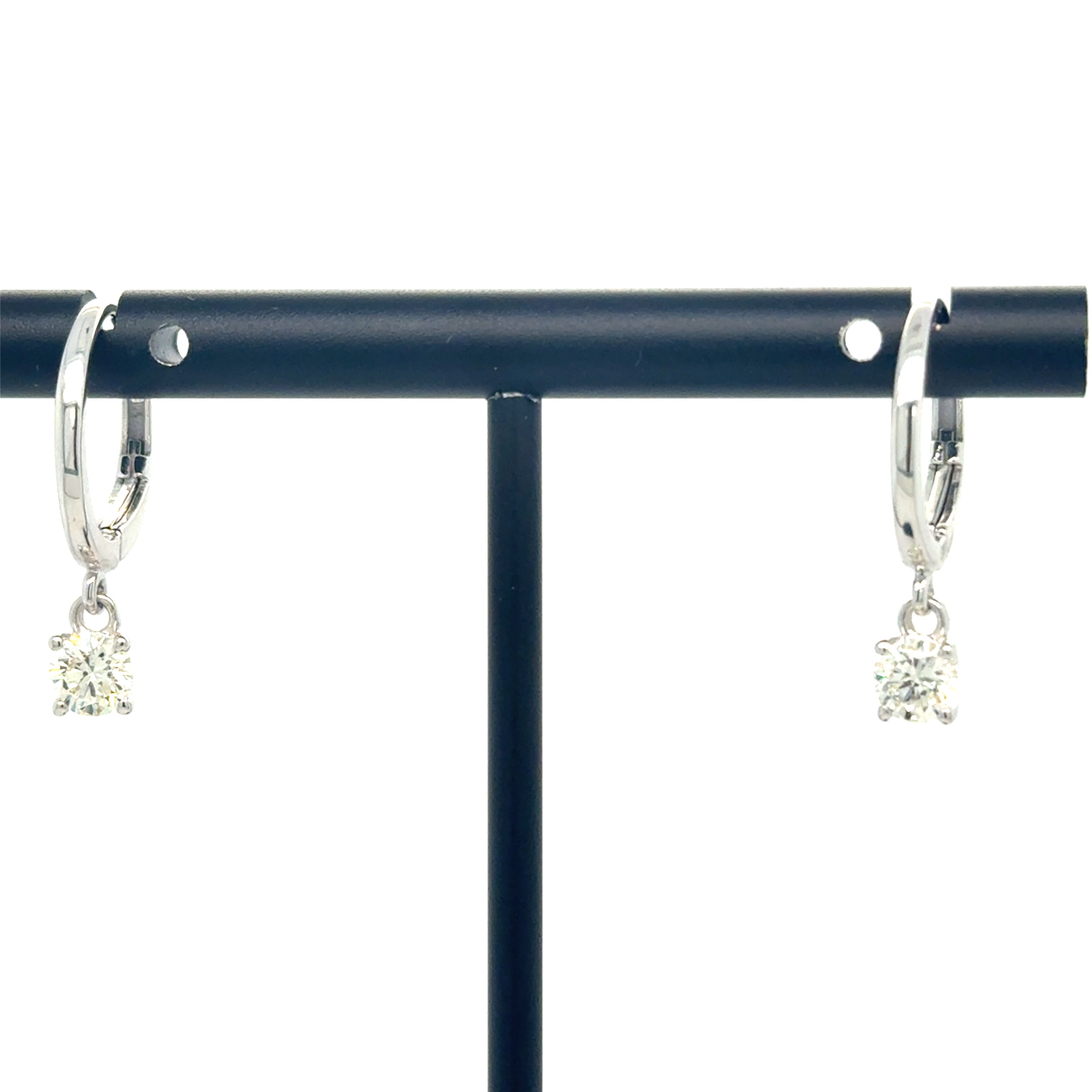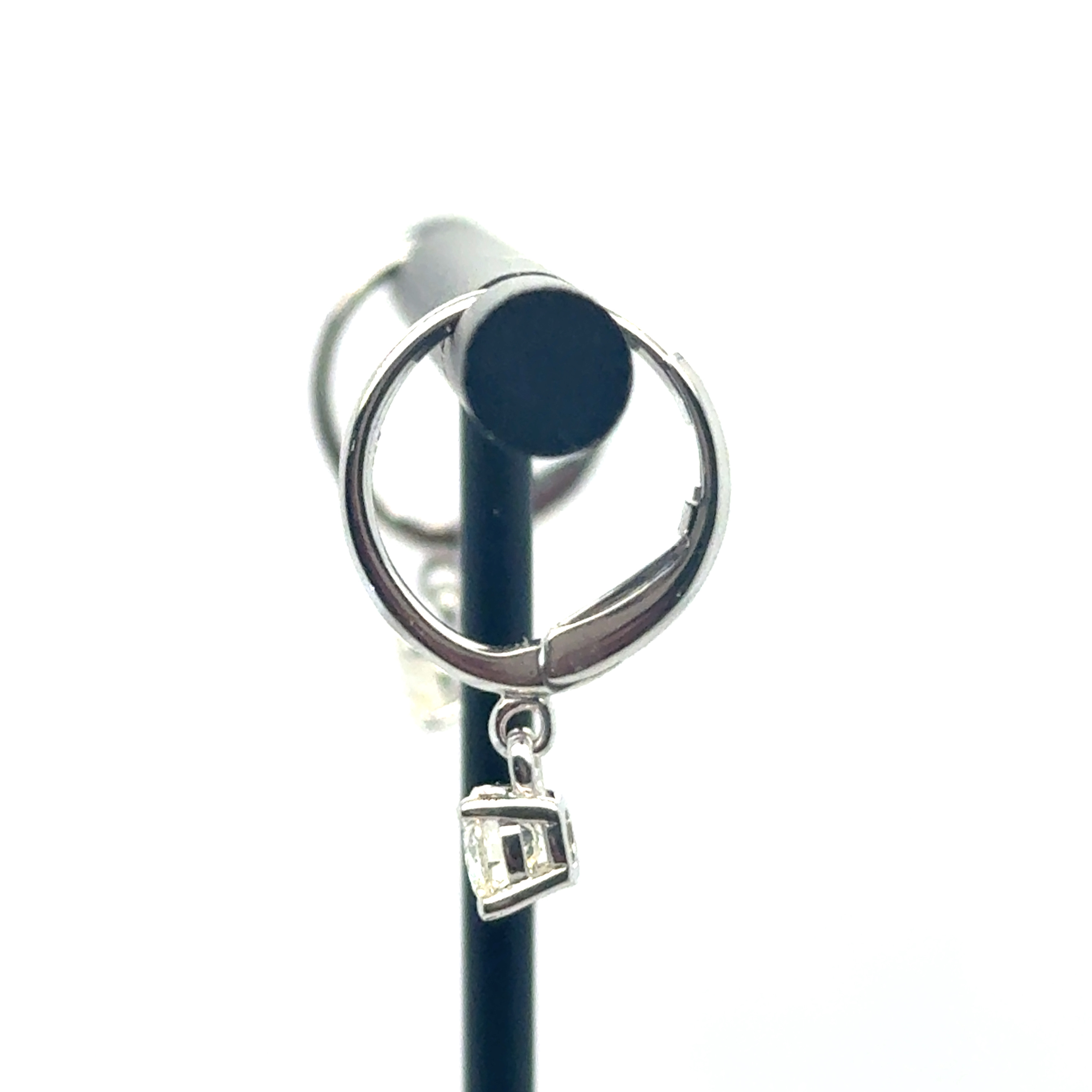 Description 14KW GOLD LEVER-BACK HUGGIE HOOP EARRINGS FEATURING DIAMOND DANGLES 14KT WHITE GOLD- 585, HIGH POLISH/RHODIUM PLATING2=.74CTTW ROUND BRILLIANT CUT DIAMONDS I COLOR, SI CLARITY, PRONG SETLEVER-BACK EARRING CLOSURE