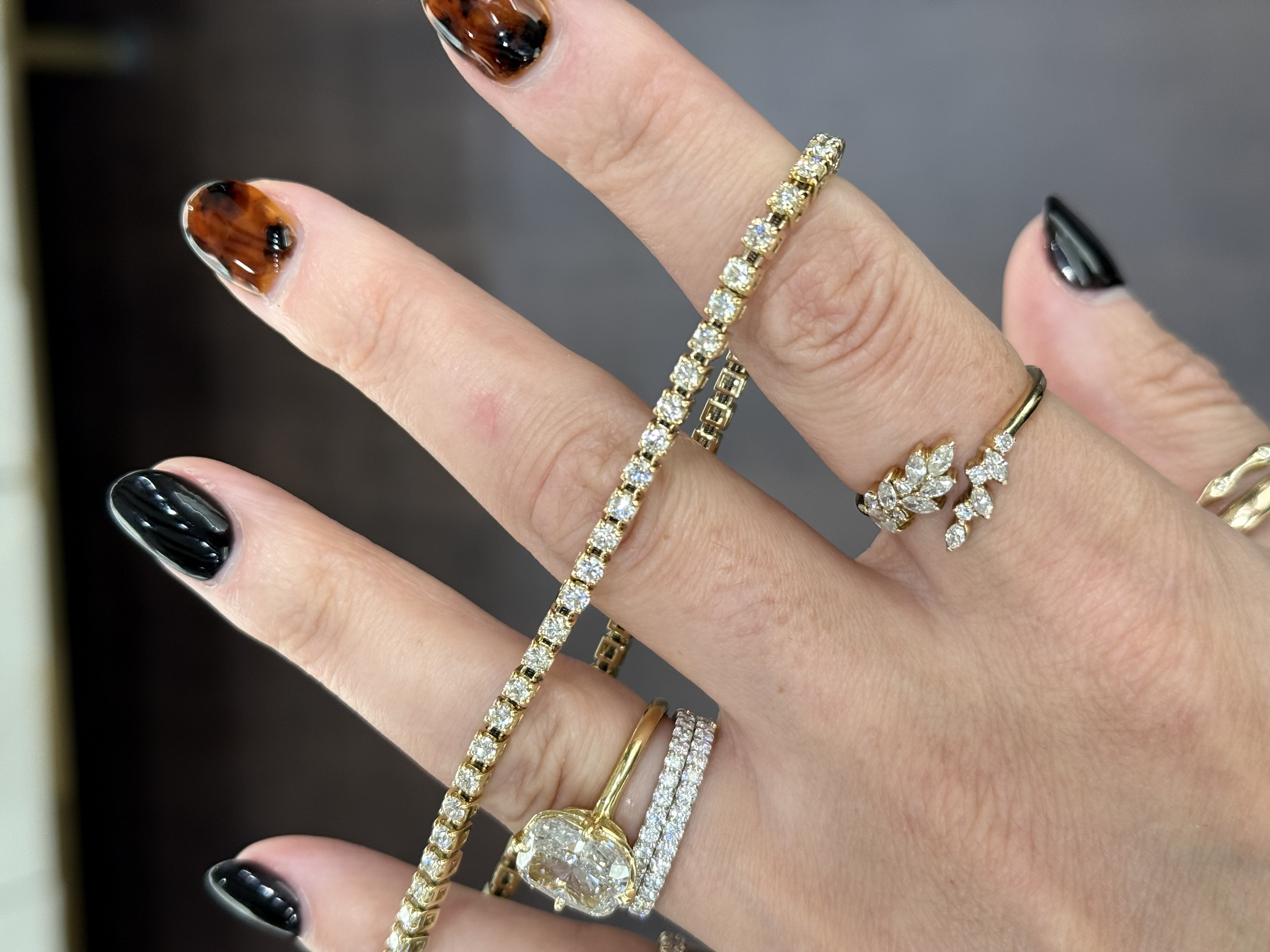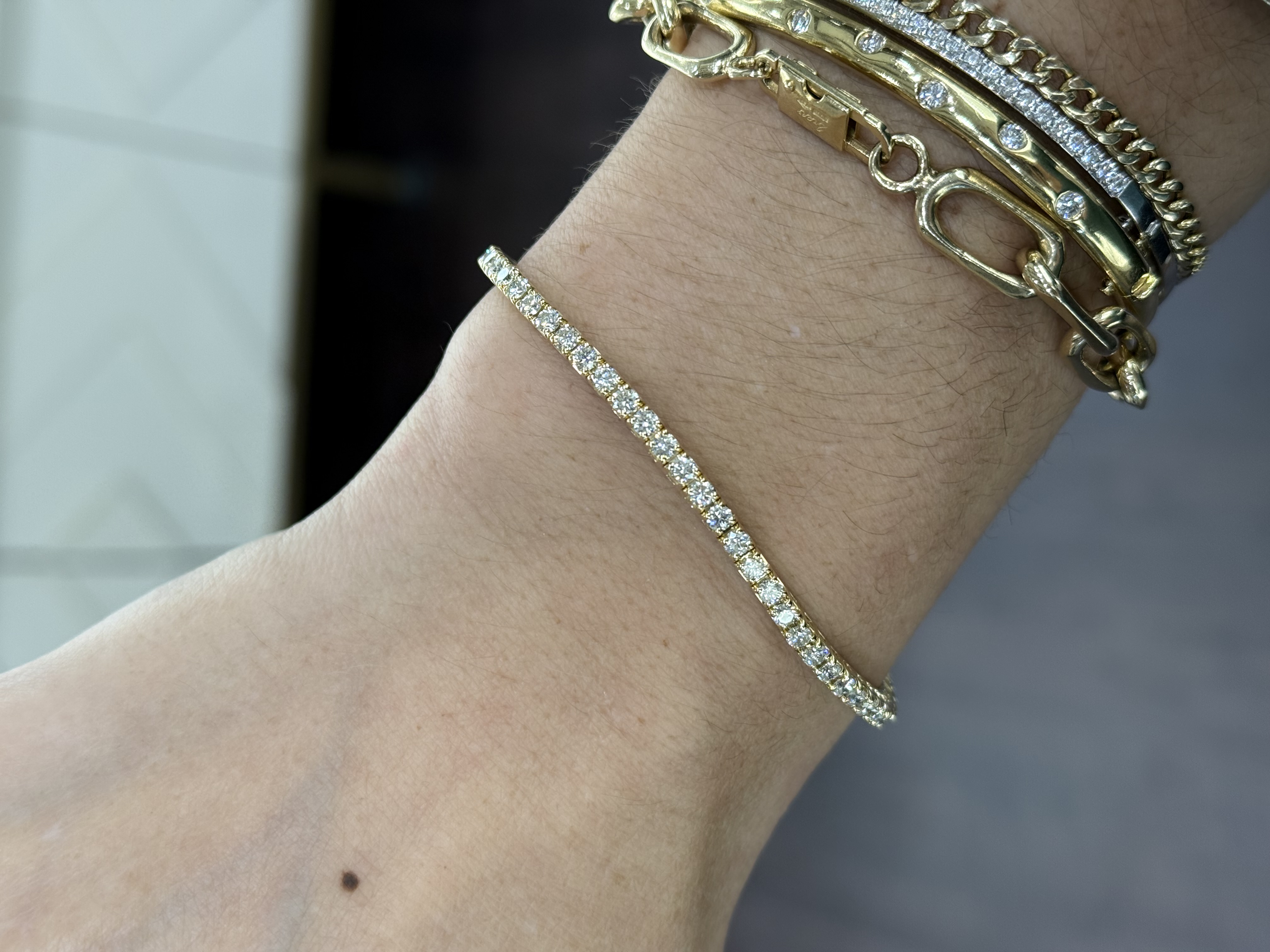 Description 7" 14KY GOLD 4.20CTTW STETCH DIAMOND TENNIS BRACELET 14KT YELLOW GOLD- 585, HIGH POLISH4.20CTTW ROUND BRILLIANT CUT DIAMONDS H COLOR, SI CLARITY, PRONG SETGOLD WEIGHT: 12.4 GRAMS