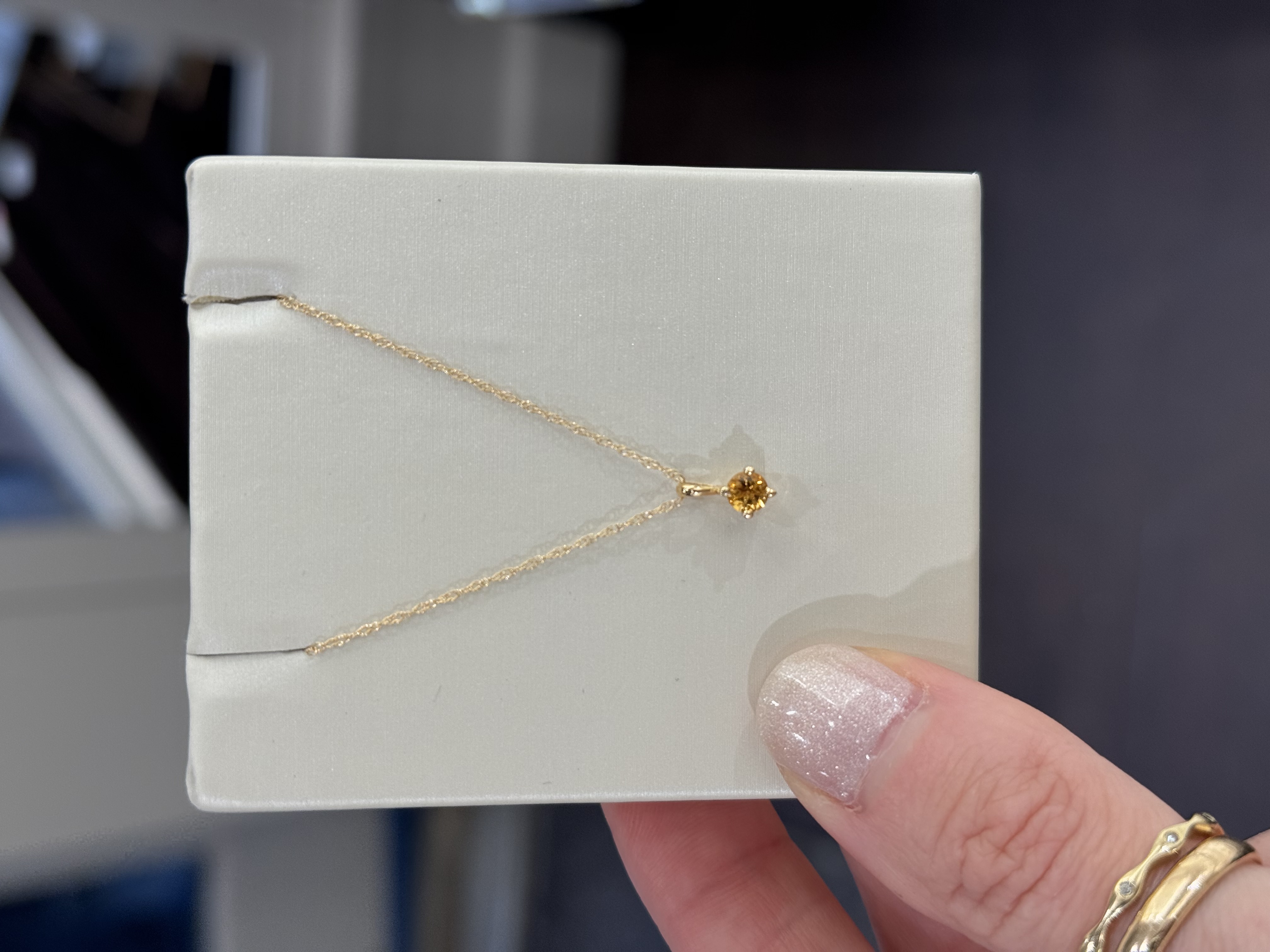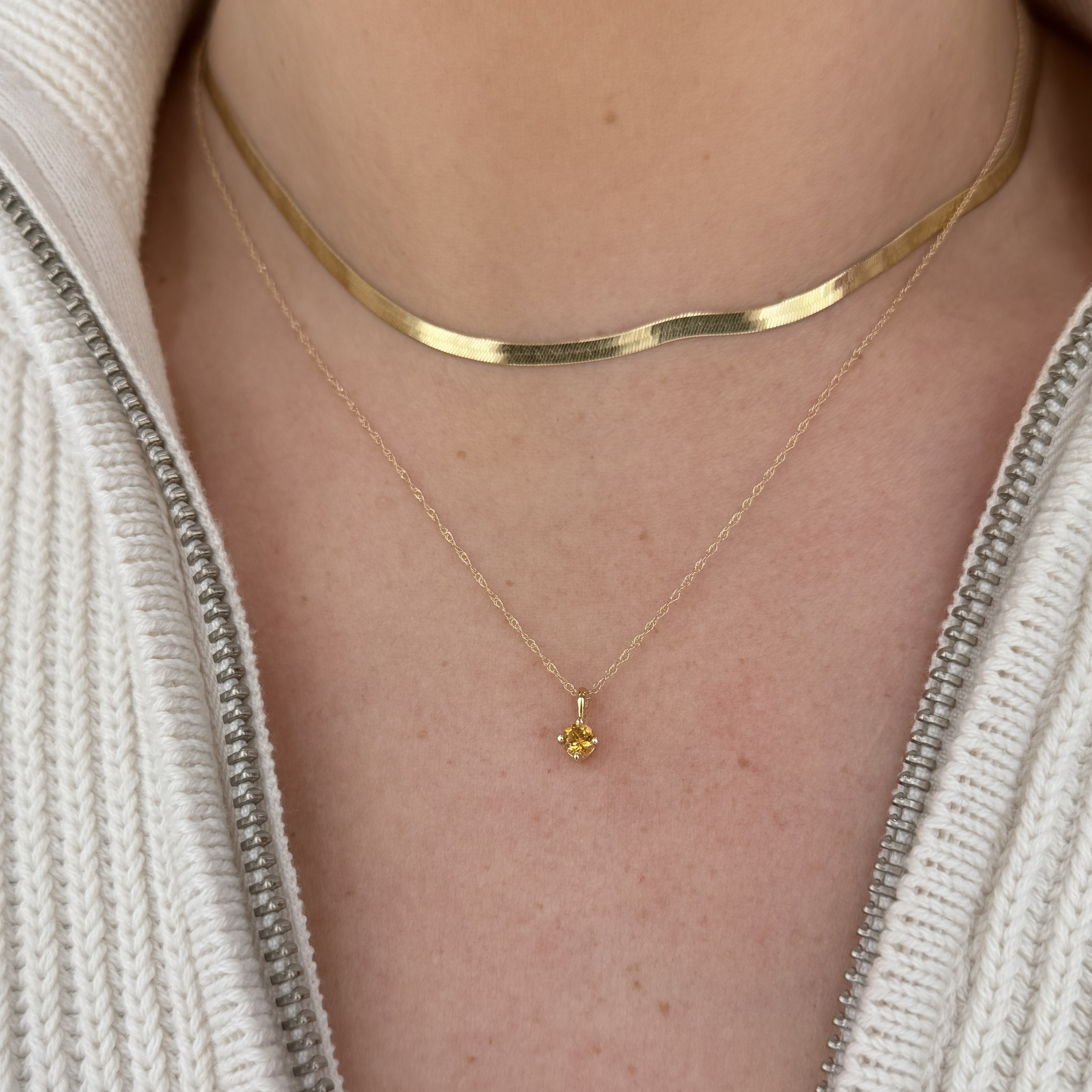 Description 14KY GOLD 4MM CITRINE PENDANT SET AT COMPASS ORIENTATION 14KT YELLOW GOLD- 585, HIGH POLISHQTY (1) 4MM ROUND CITRINE, SET IN FOUR-PRONG BASKET AT COMPASS ORIENTATION18" 14KY GOLD MINI ROPE CHAIN WITH SPRING RING CLASP