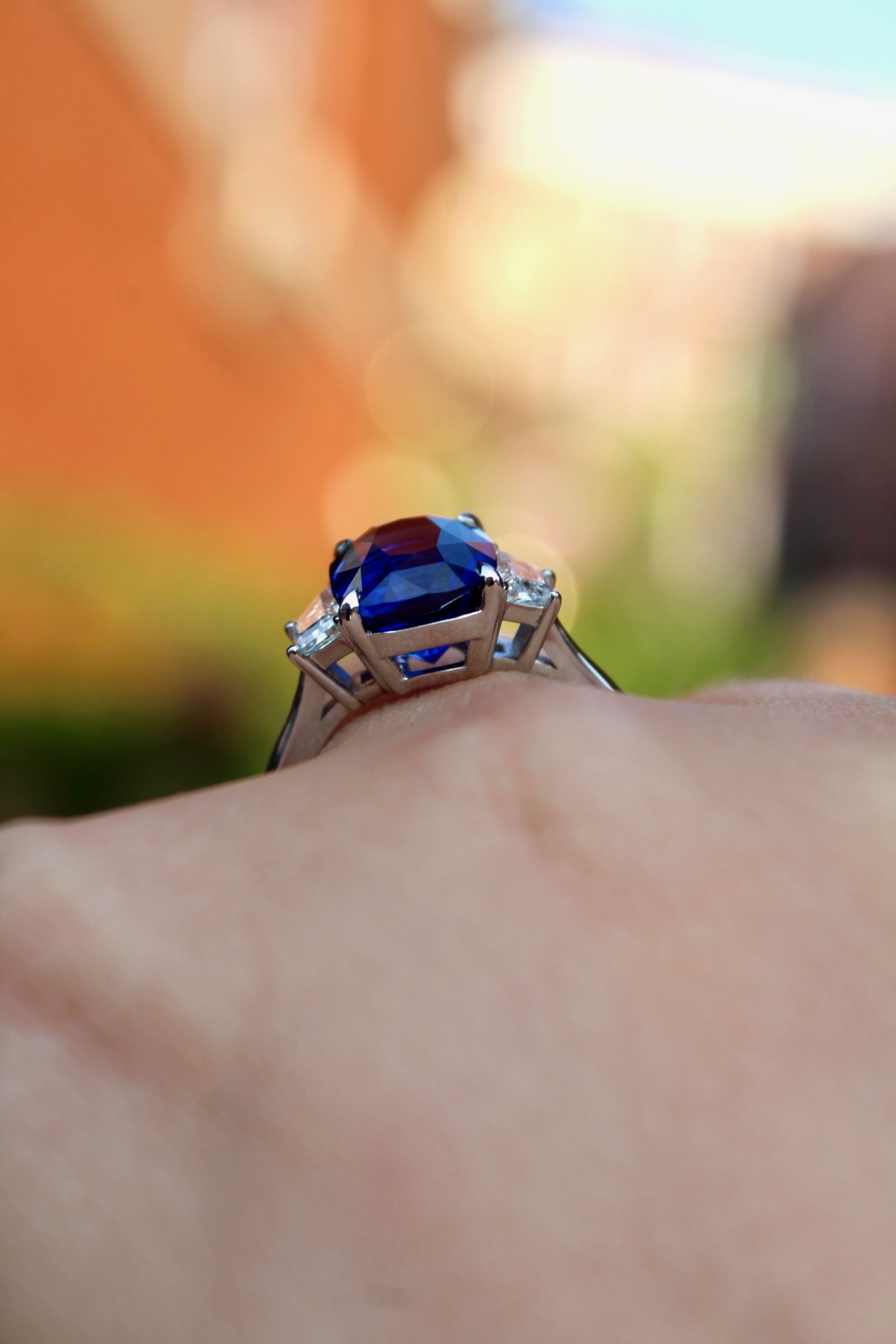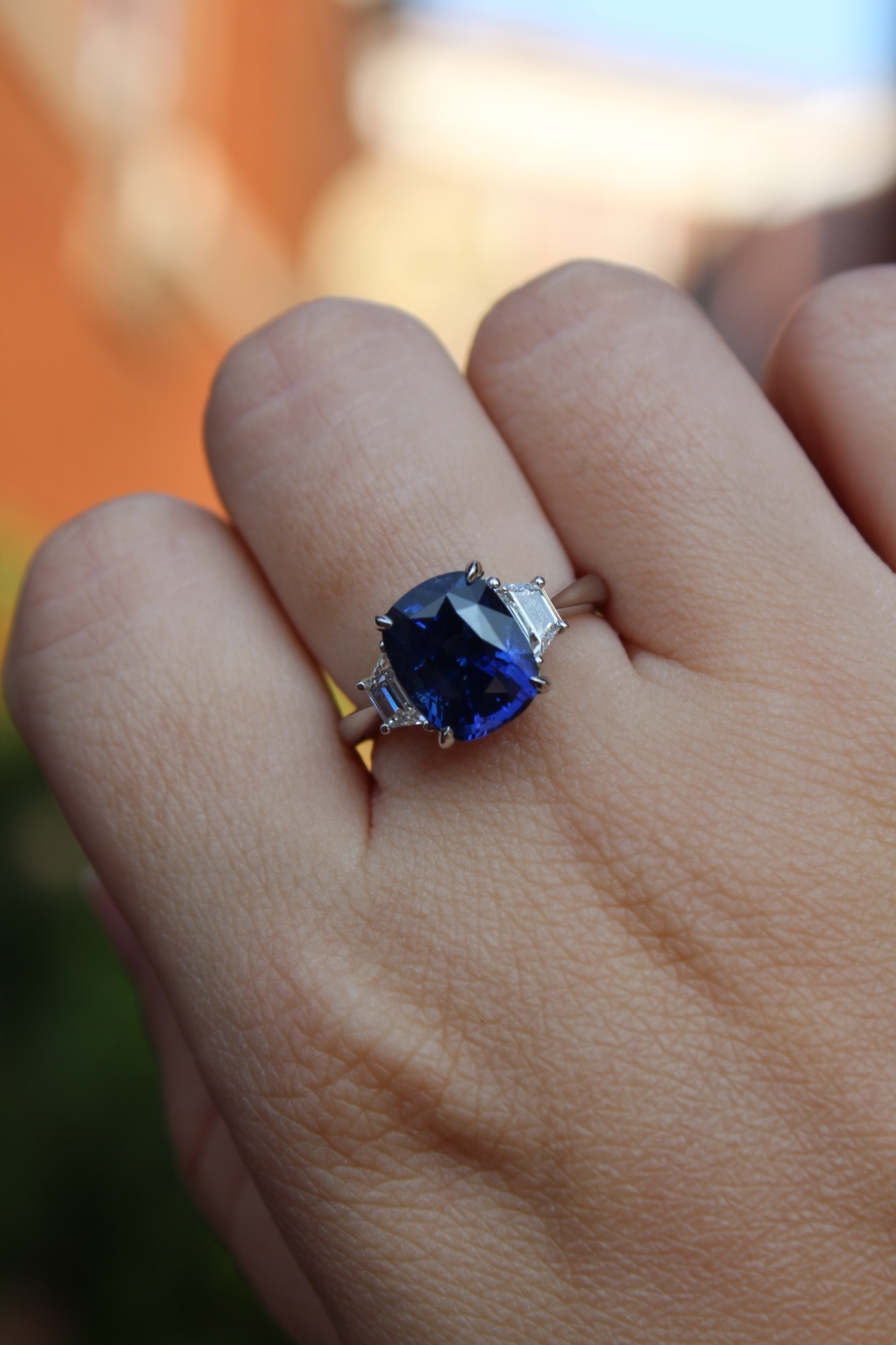 PLATINUM THREE-STONE RING FEATURING 5.13CT CUSHION CUT BLUE SAPPHIRE ACCENTED BY .49CTTW STEP CUT TRAPEZOID SIDE DIAMONDS