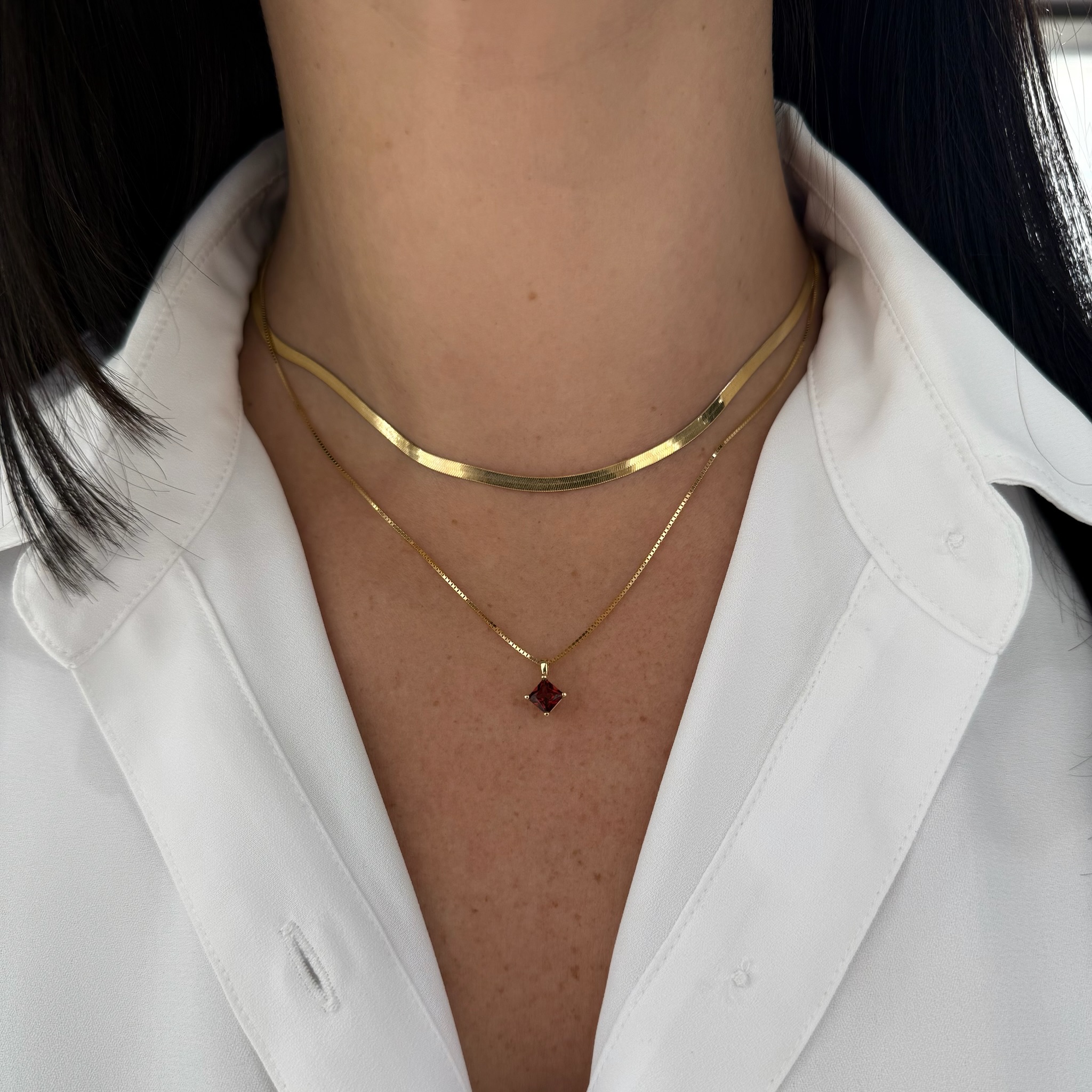 - .87CT Square Mozambique Garnet: The centerpiece of this pendant is a breathtaking .87 carat square-cut Mozambique garnet, measuring 5x5mm. Renowned for its rich, deep red hue, the garnet is prong-set in a unique 'compass orientation,' adding a modern twist to a classic design.