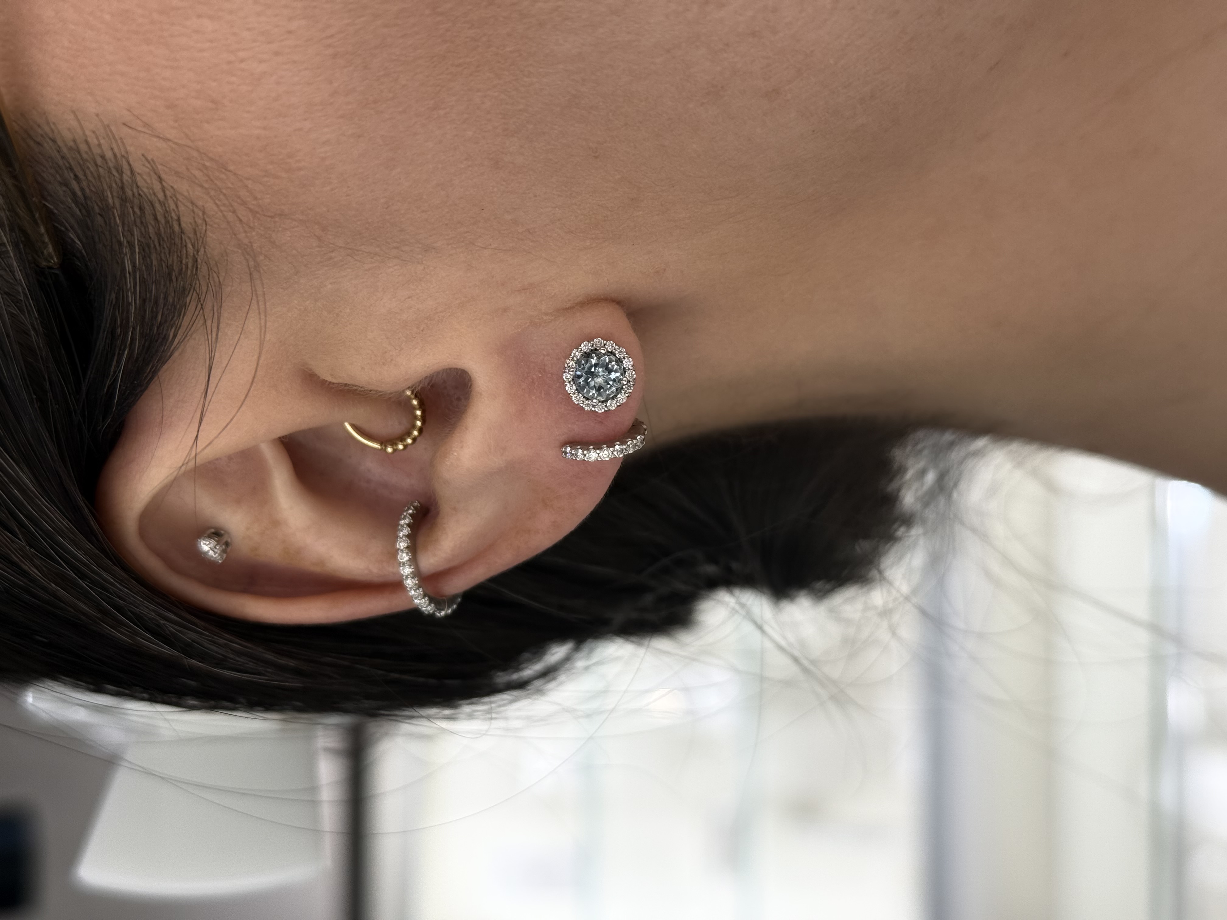 Description 14KW GOLD AQUAMARINE & DIAMOND HALO STUD EARRINGS WITH POST AND FRICTION BACKS 14KT WHITE GOLDQTY (2) 5MM ROUND AQUAMARINE, PRONG SET32=.12CTTW ROUND BRILLIANT CUT DIAMONDS G-H COLOR, I1 CLARITY, PRONG SET IN HALOPOST AND FRICTION BACKS