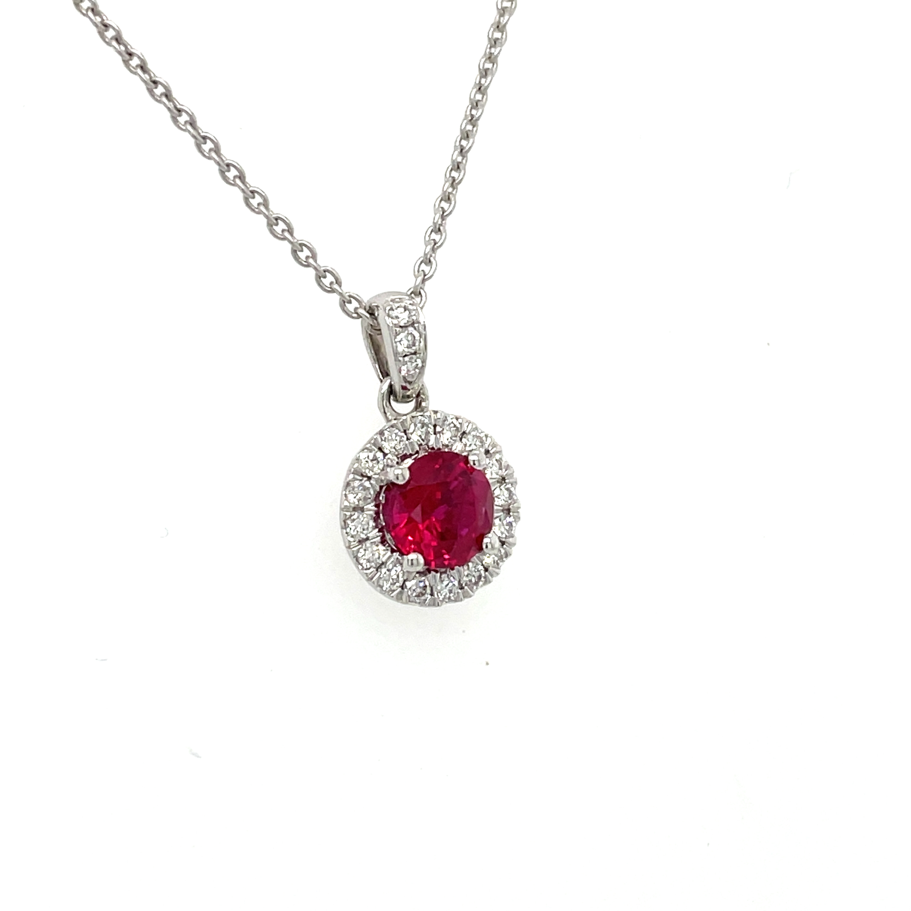 Surrounding the ruby, a halo of 19 round brilliant cut diamonds adds an extra layer of sparkle and luxury. These diamonds, with an H-I color grade and I1 clarity, collectively weigh .17cttw. Their strategic prong setting in the halo and along the bail not only enhances the ruby's radiance but also adds a touch of glamour to the entire piece. This combination of the fiery ruby and the sparkling diamonds creates a harmonious balance, making the pendant a versatile piece that can elevate any outfit, be it casual or formal.