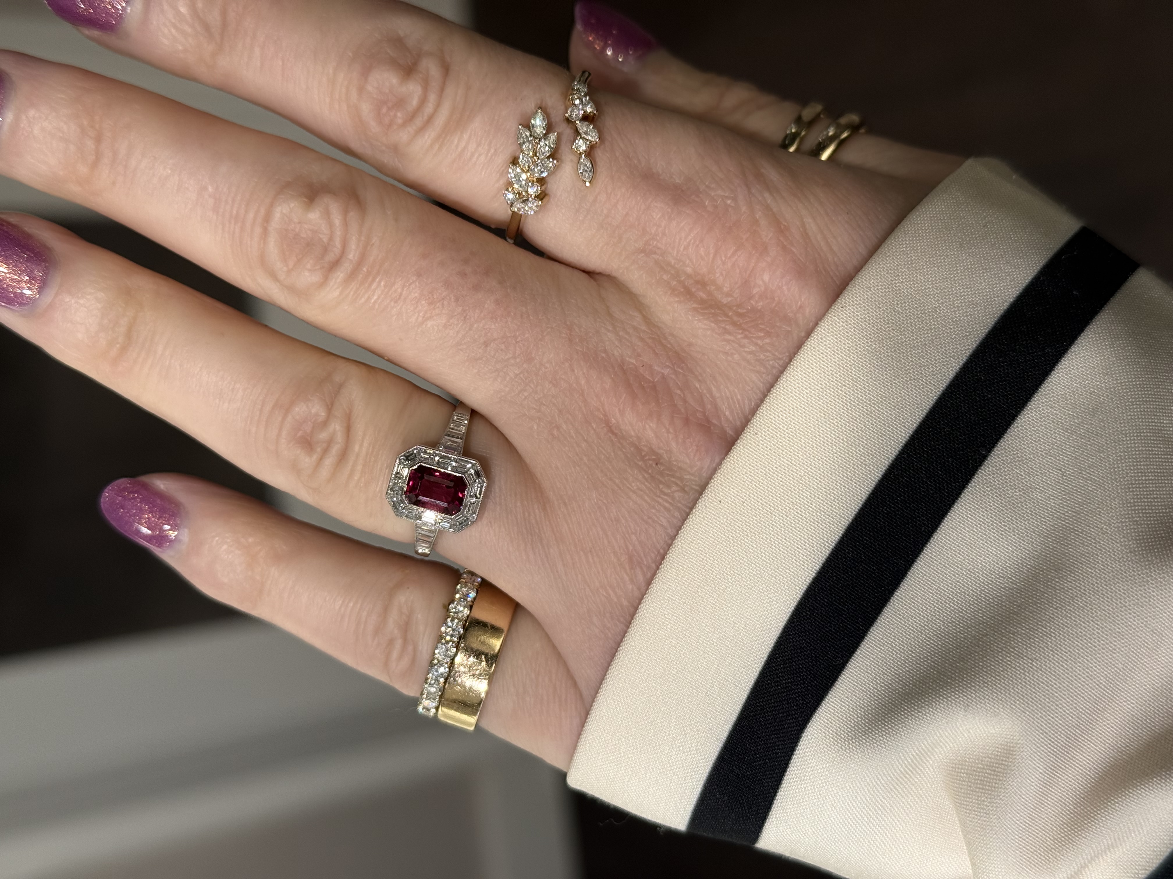 PLATINUM "ART DECO" EMERALD CUT RUBY & DIAMOND HALO RING