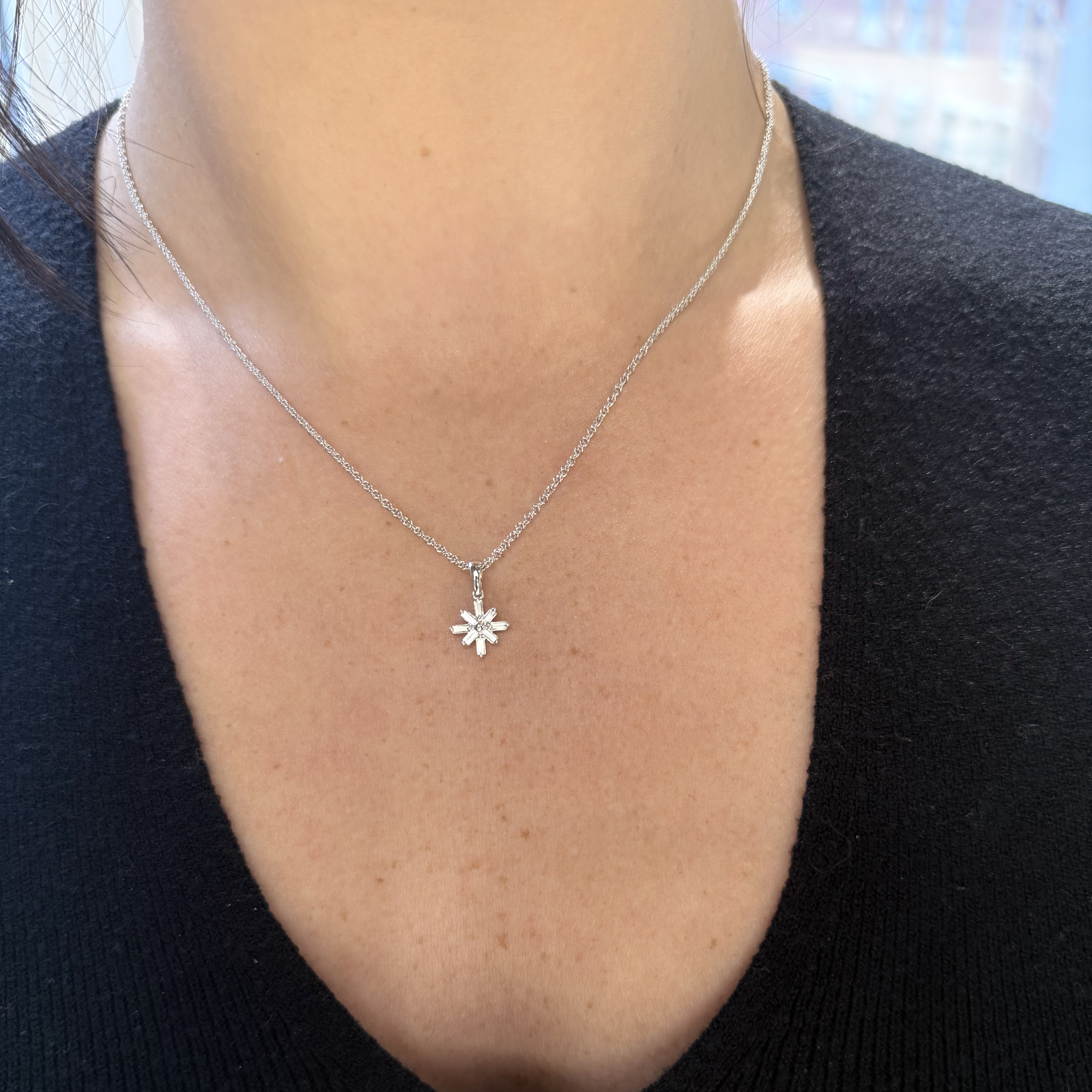 Description 14KW GOLD BAGUETTE DIAMOND "STARBURST" PENDANT ON 18" ROPE CHAIN 14KT WHITE GOLD- 585, HIGH POLISH8=.14CTTW BAGUETTE CUT DIAMONDS G COLOR, SI3 CLARITY, PRONG SET18" 14KT WHITE GOLD POLISHED ROPE CHAIN WITH LOBSTER CLASP