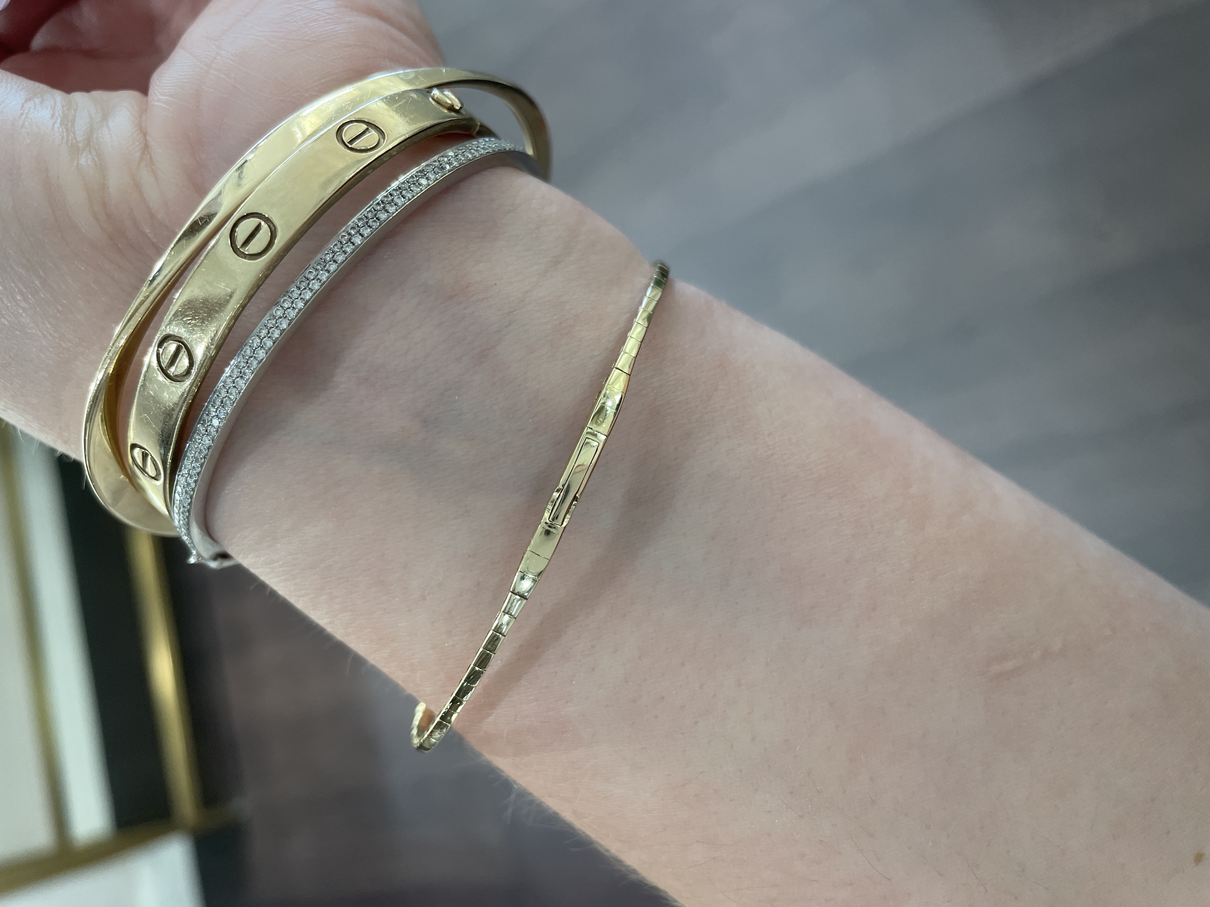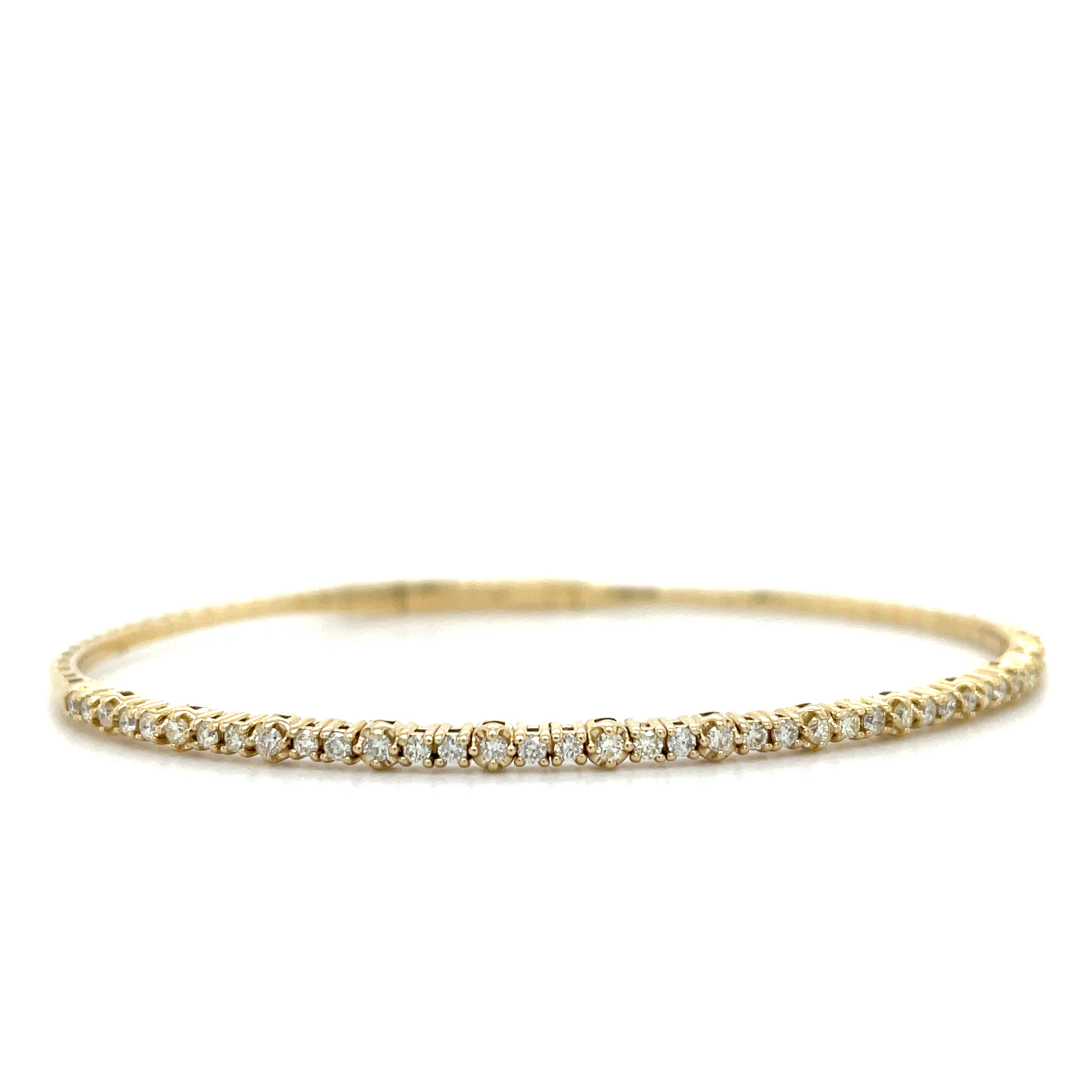 The bracelet features a secure locking clasp that requires a push-in mechanism to release, ensuring that the bracelet stays firmly in place while worn. This practical yet stylish clasp blends seamlessly with the design, allowing the diamonds and gold to take center stage. The flexibility of the bangle allows it to comfortably conform to the wrist, making it as comfortable as it is beautiful. This exquisite piece is a perfect blend of luxury and functionality, suitable for both special occasions and everyday elegance.