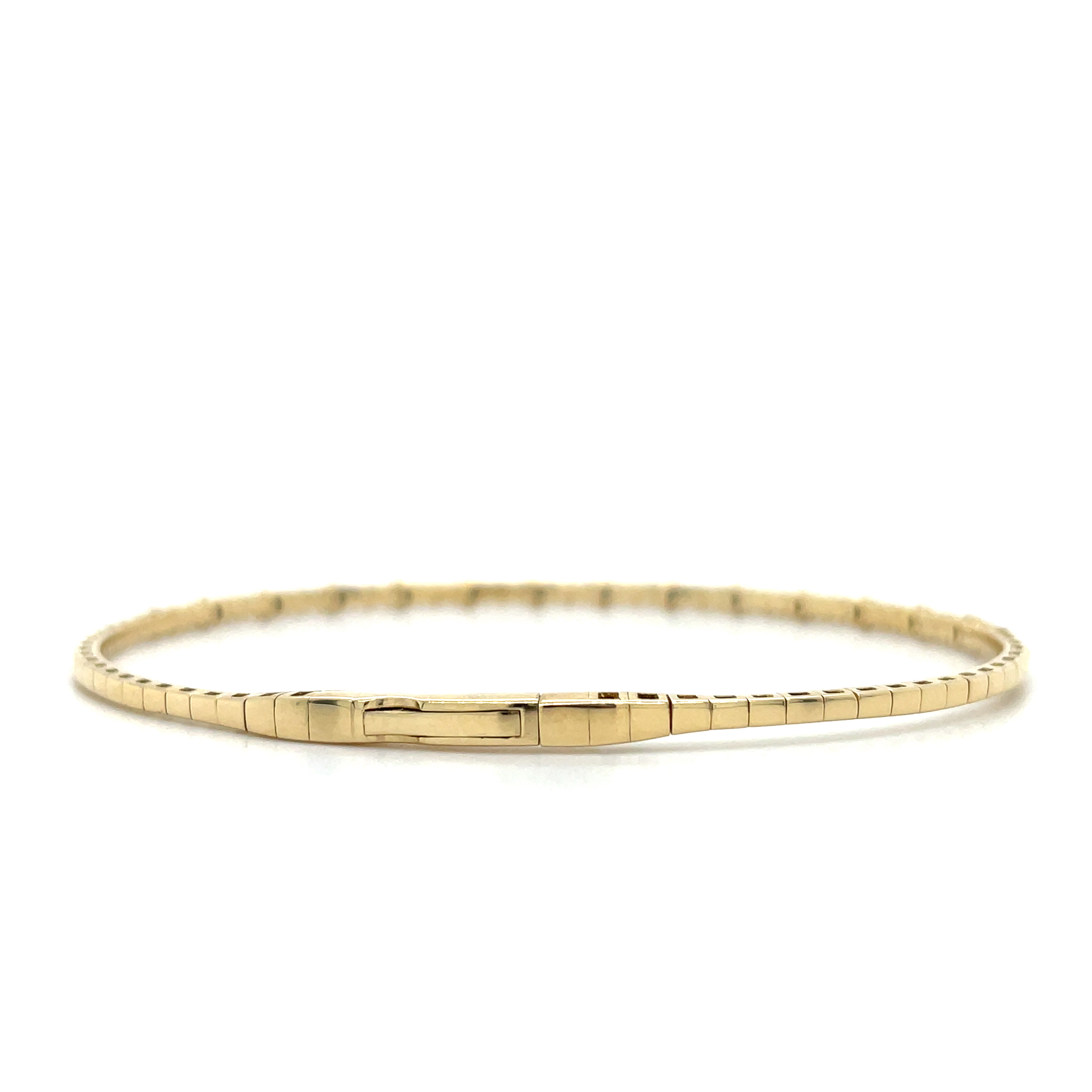 The 14KY Gold Flexible Diamond Bangle Bracelet is a striking piece of jewelry that exudes both elegance and sophistication. Crafted from 14 karat yellow gold, this bracelet boasts a high-polish finish that gleams with a warm, radiant glow, making it a timeless accessory for any occasion. The gold composition is marked as 585, indicating its purity and quality.