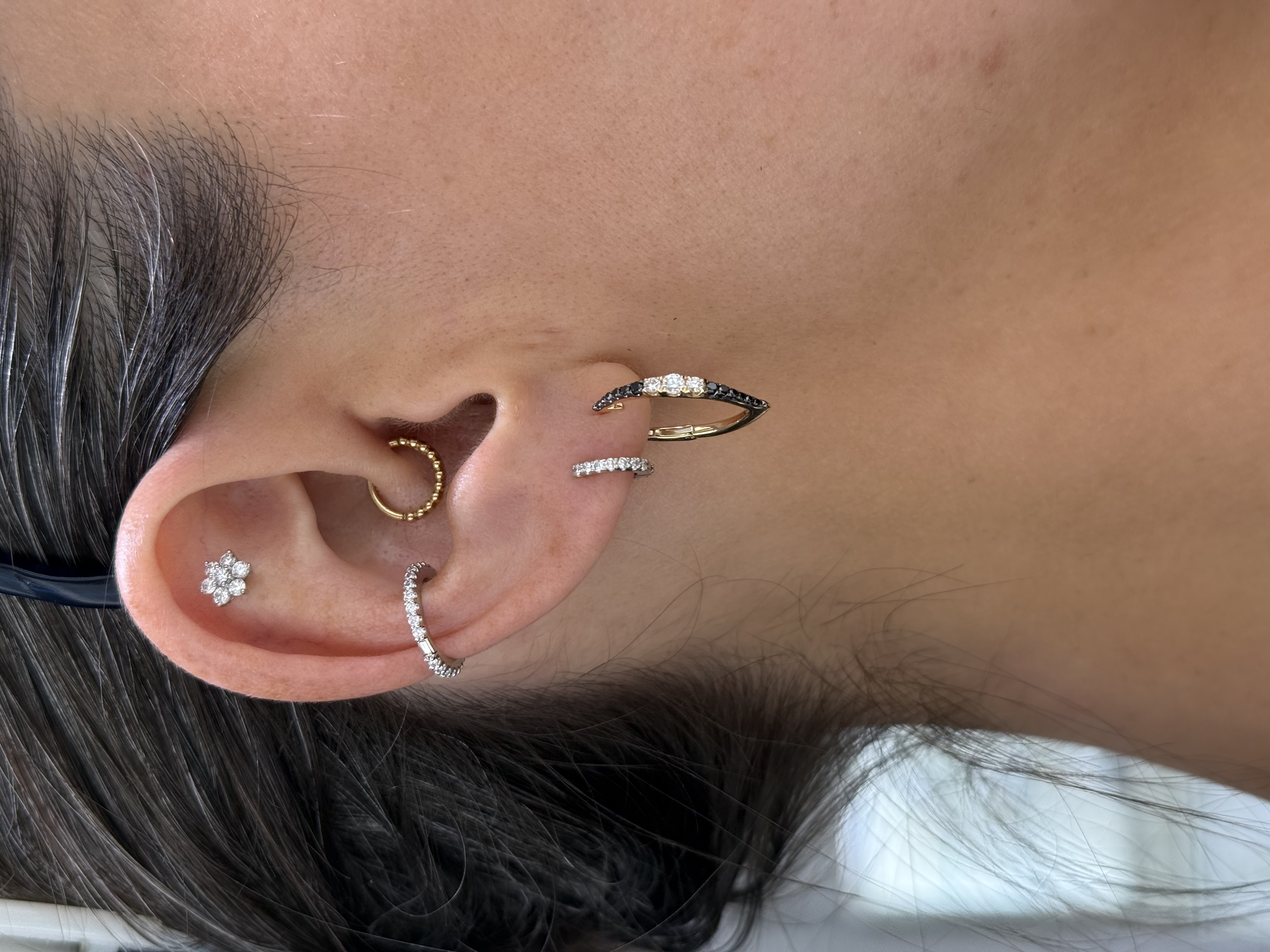 14KY GOLD GRADUATING HALF BLACK & HALF WHITE DIAMOND MARQUISE SHAPED HOOP EARRINGS