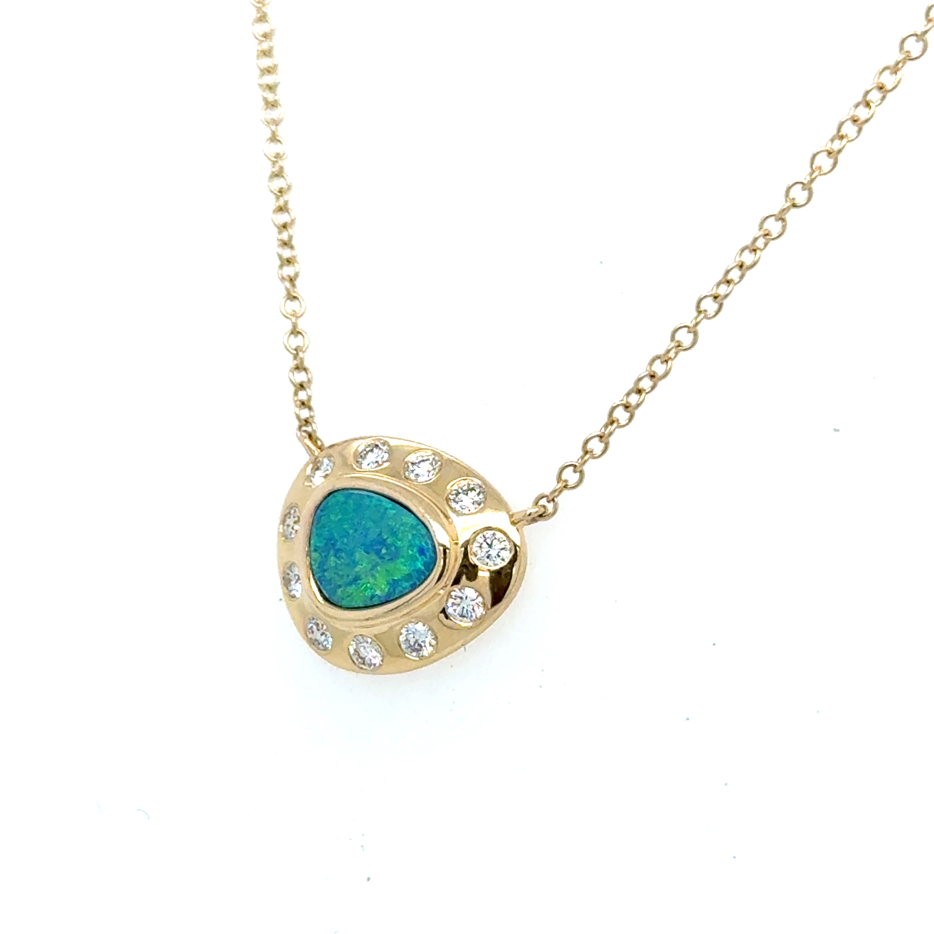 14KY GOLD BLACK OPAL DOUBLET "BEAN" PENDANT WITH SCATTERED FLUSH SET DIAMOND HALO