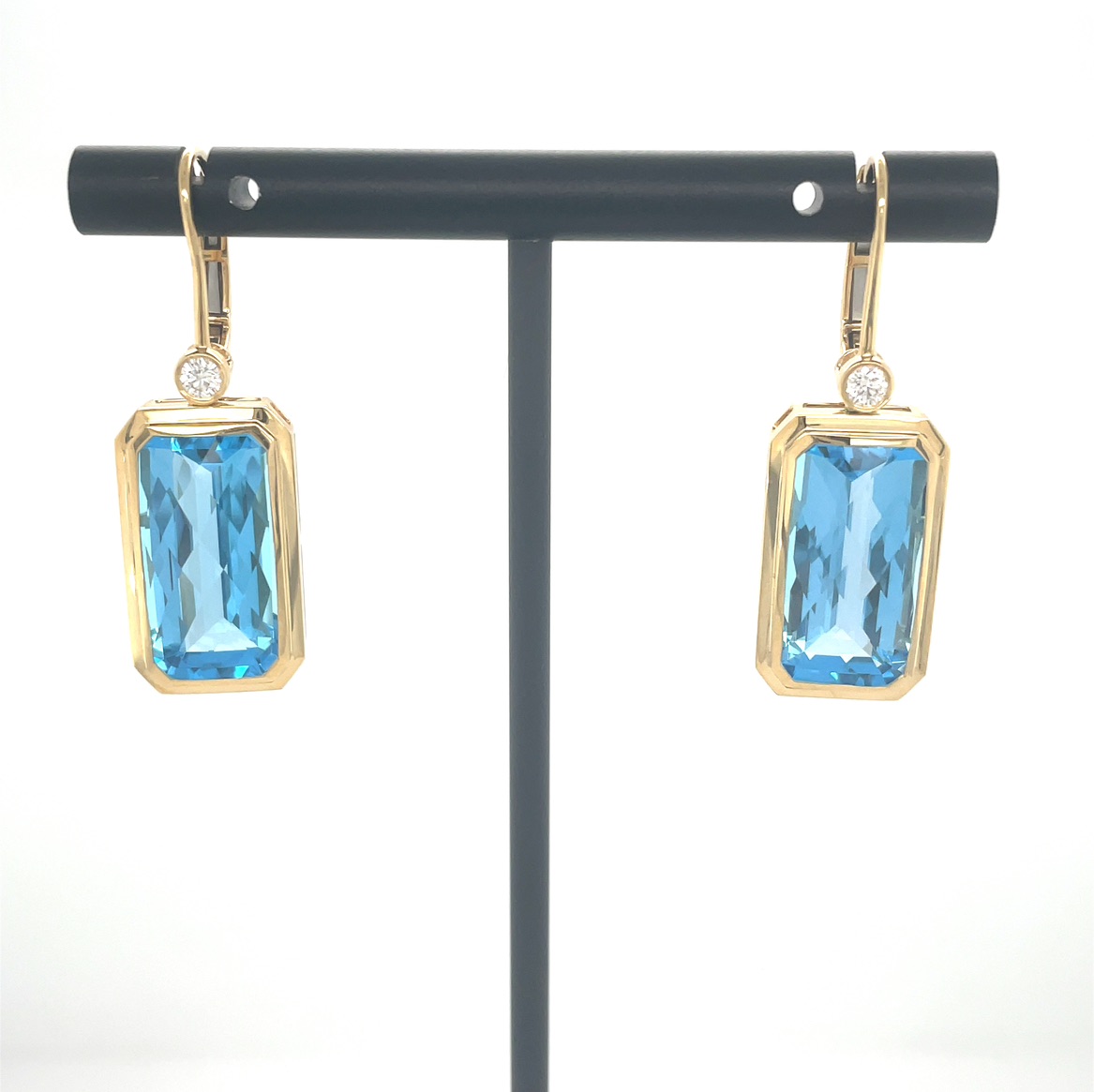 18KY GOLD 19.85CTTW BEZEL SET SWISS BLUE TOPAZ DANGLE EARRINGS WITH .16CTTW DIAMOND ACCENTS