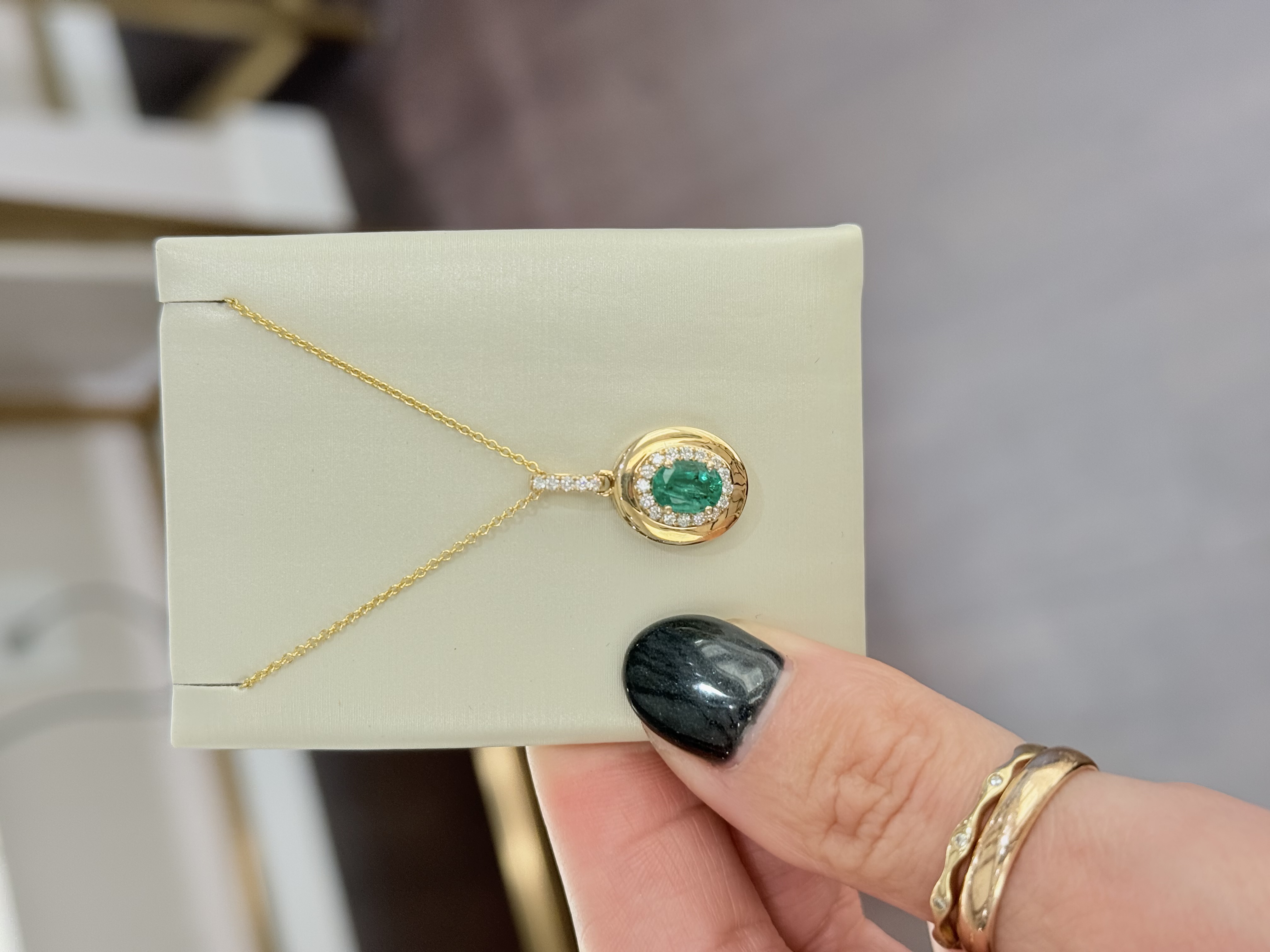 14KY GOLD OVAL EMERALD & DIAMOND HALO PENDANT WITH GOLD RIM ON 18" CHAIN