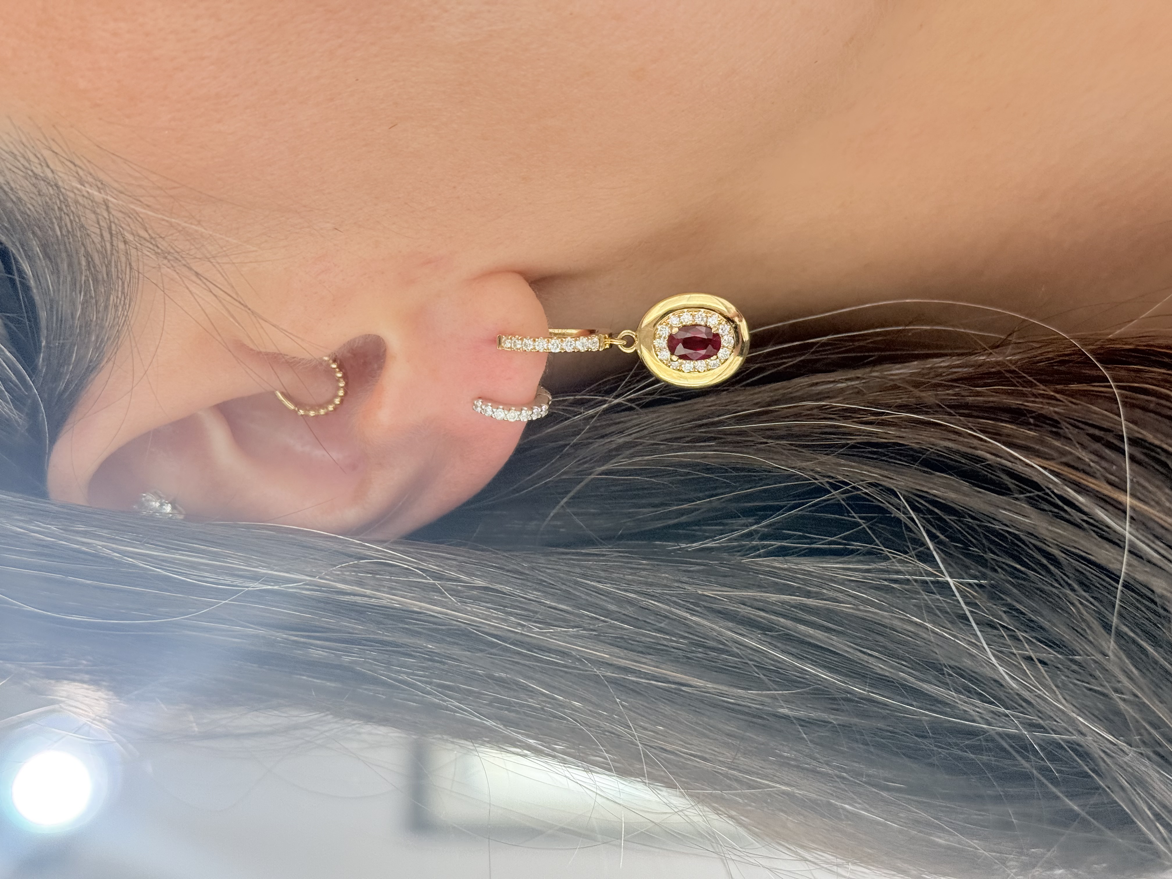 18KY GOLD OVAL RUBY & DIAMOND HALO DANGLE EARRINGS WITH GOLD RIMS