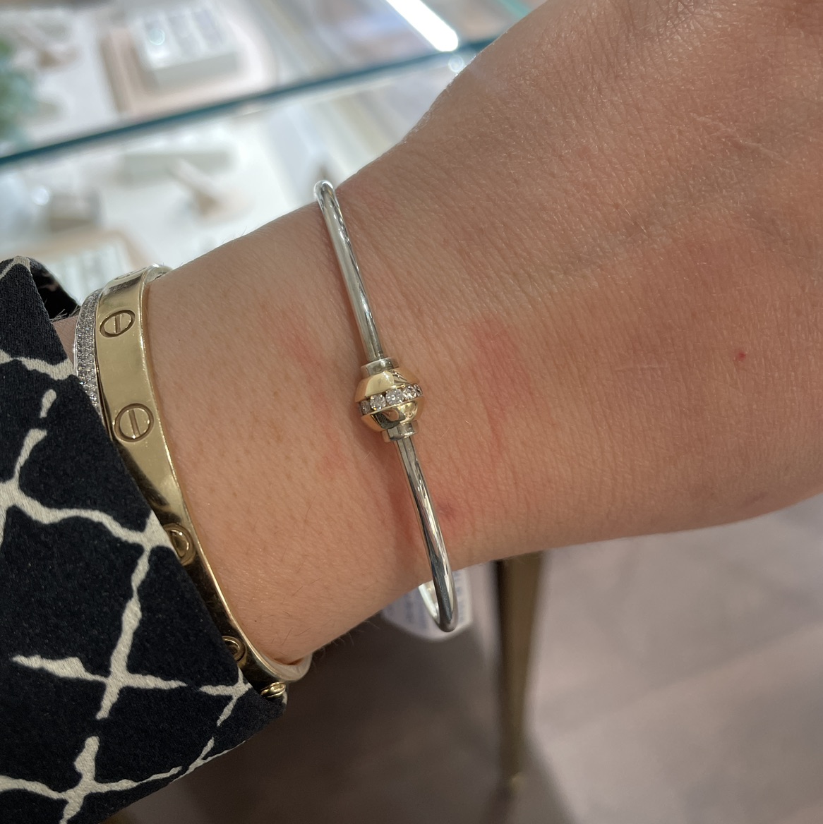 Cape Cod bangle bracelet in sterling silver with choice of silver ball, 14k rose gold ball, or 14k yellow gold ball. Ball screws open allowing the bracelet to slip on the wrist and fit snugly. Oval design allows it to fit comfortably.