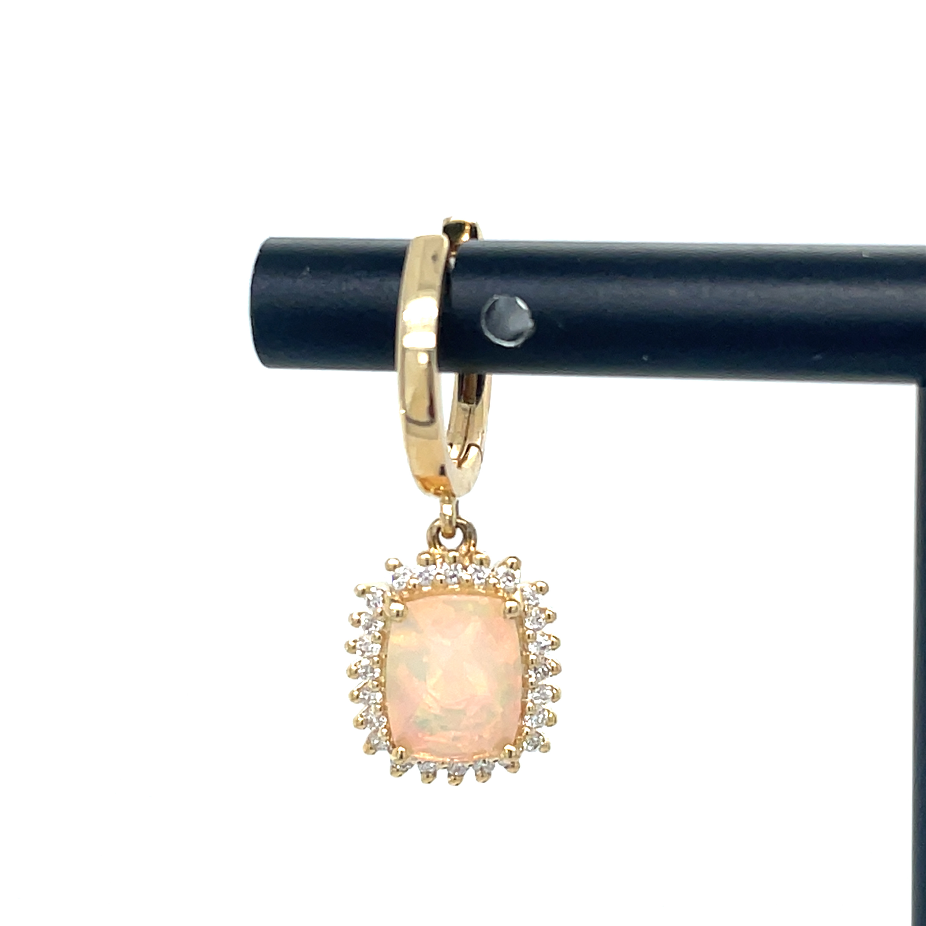 14KY GOLD '"FOREVER YOUNG COLLECTION" BY BELLARRI™ FACETED WHITE OPAL AND DIAMOND HALO EARRINGS WITH HUGGIE EARRING TOPS