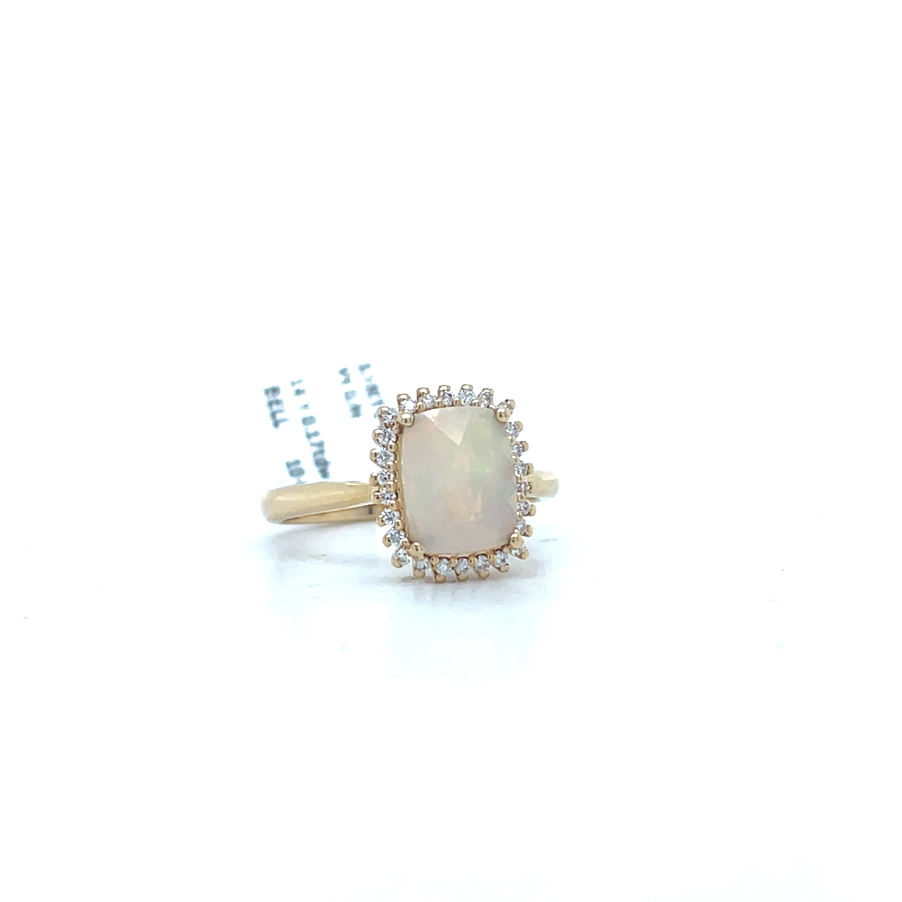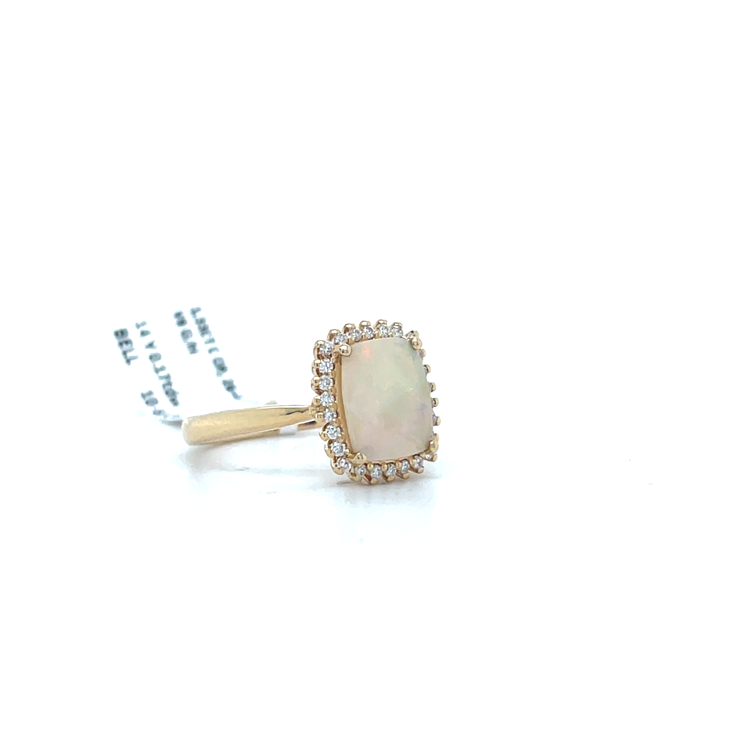 14ky gold 'forever young collection' ring by bellarri™ featuring 1.33ct cushion-shaped faceted white opal surrounded by .17cttw g-h, vs diamond halo in a finger size 7