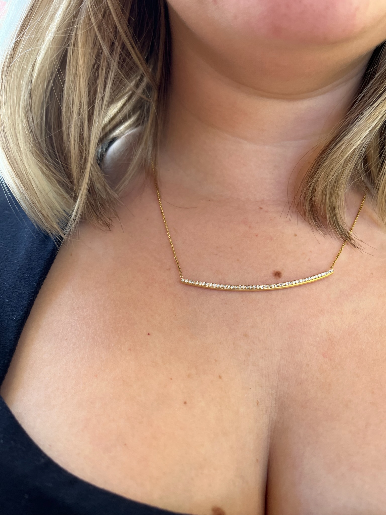 16" 14KY GOLD 1/2CTTW CURVED ELONGATED DIAMOND BAR NECKLACE ON DIAMOND CUT CABLE CHAIN
