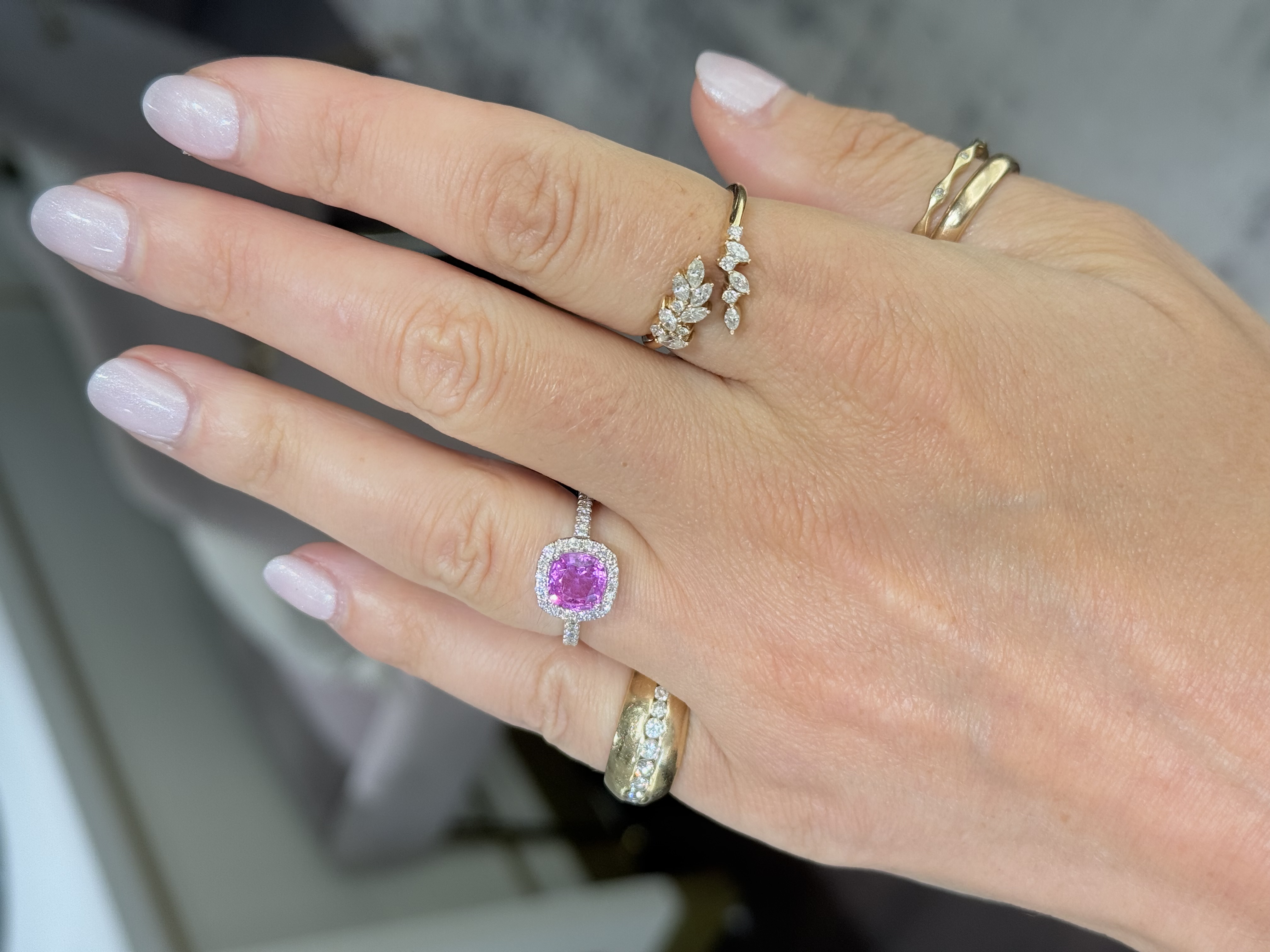 18KW GOLD PINK SAPPHIRE & DIAMOND HALO RING