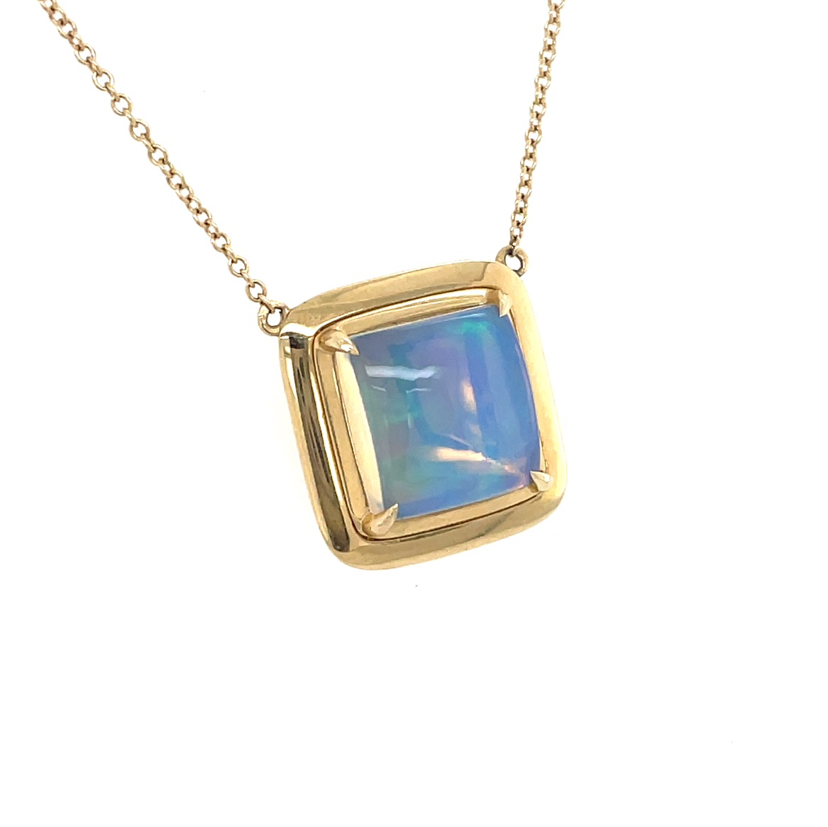 14ky gold cushion shape crystal opal pendant with gold bezel frame on 18" 14ky gold chain