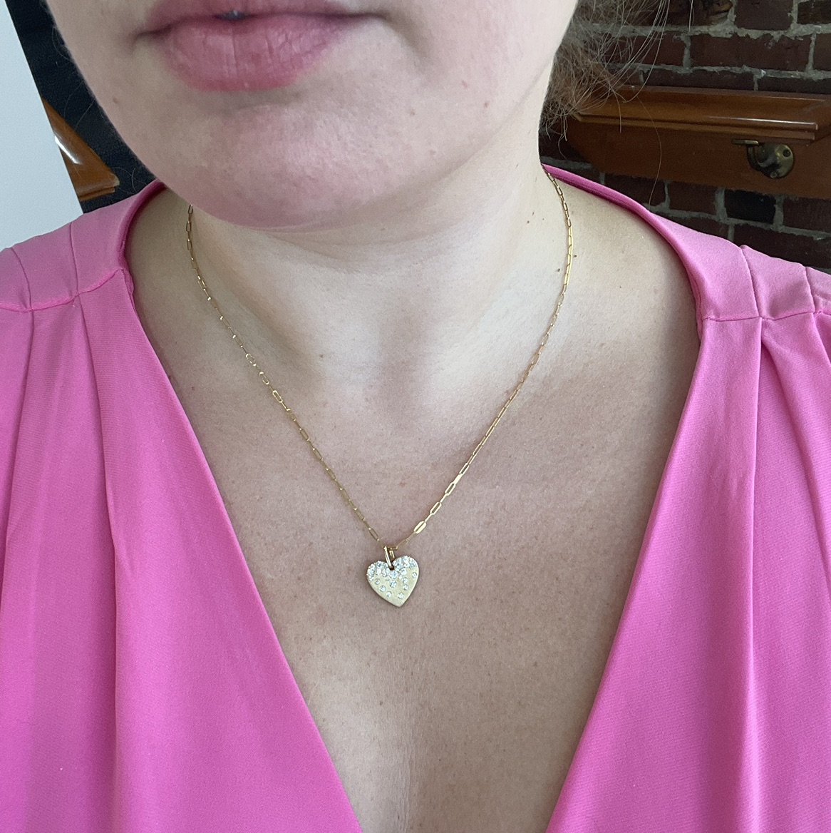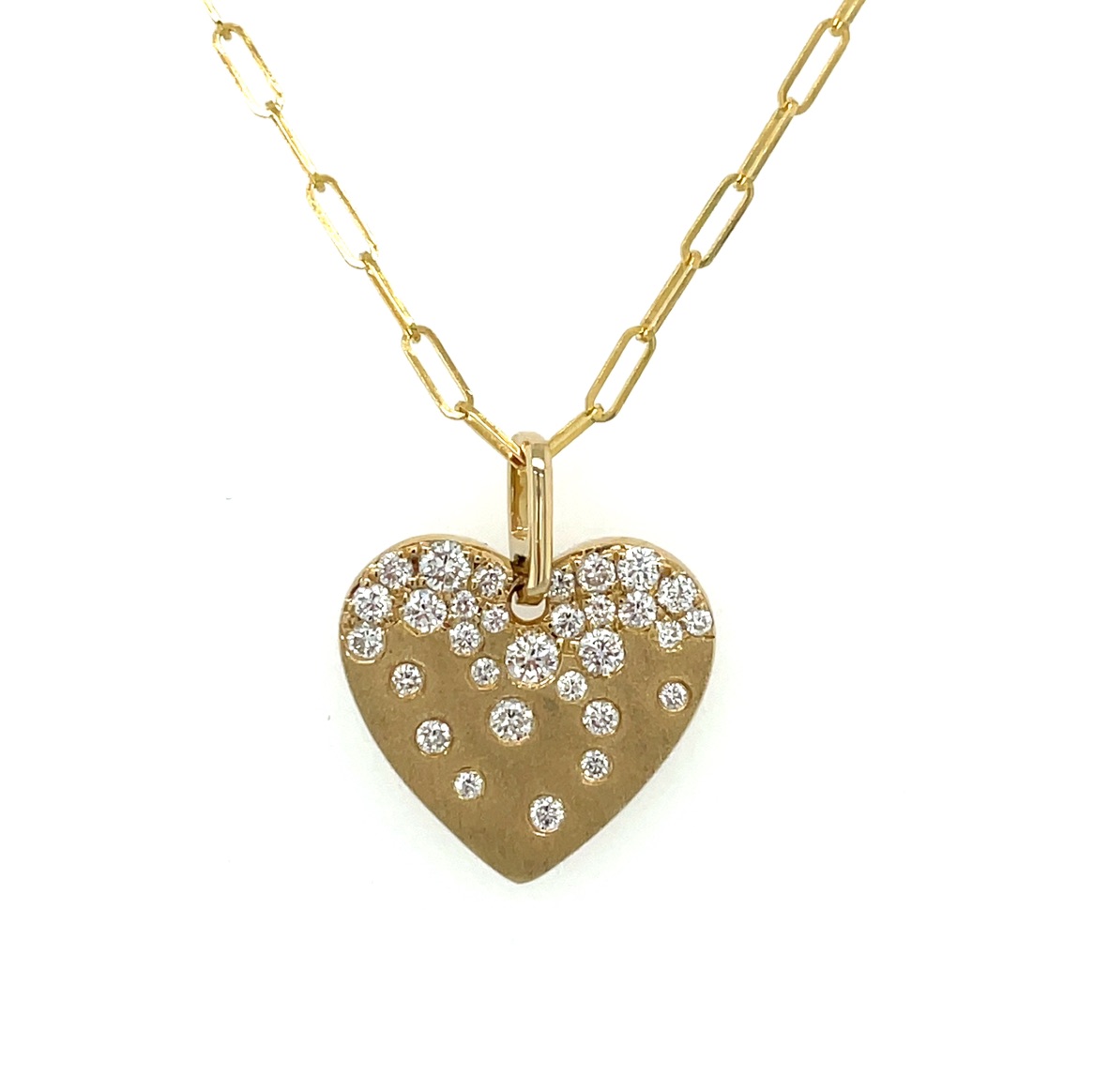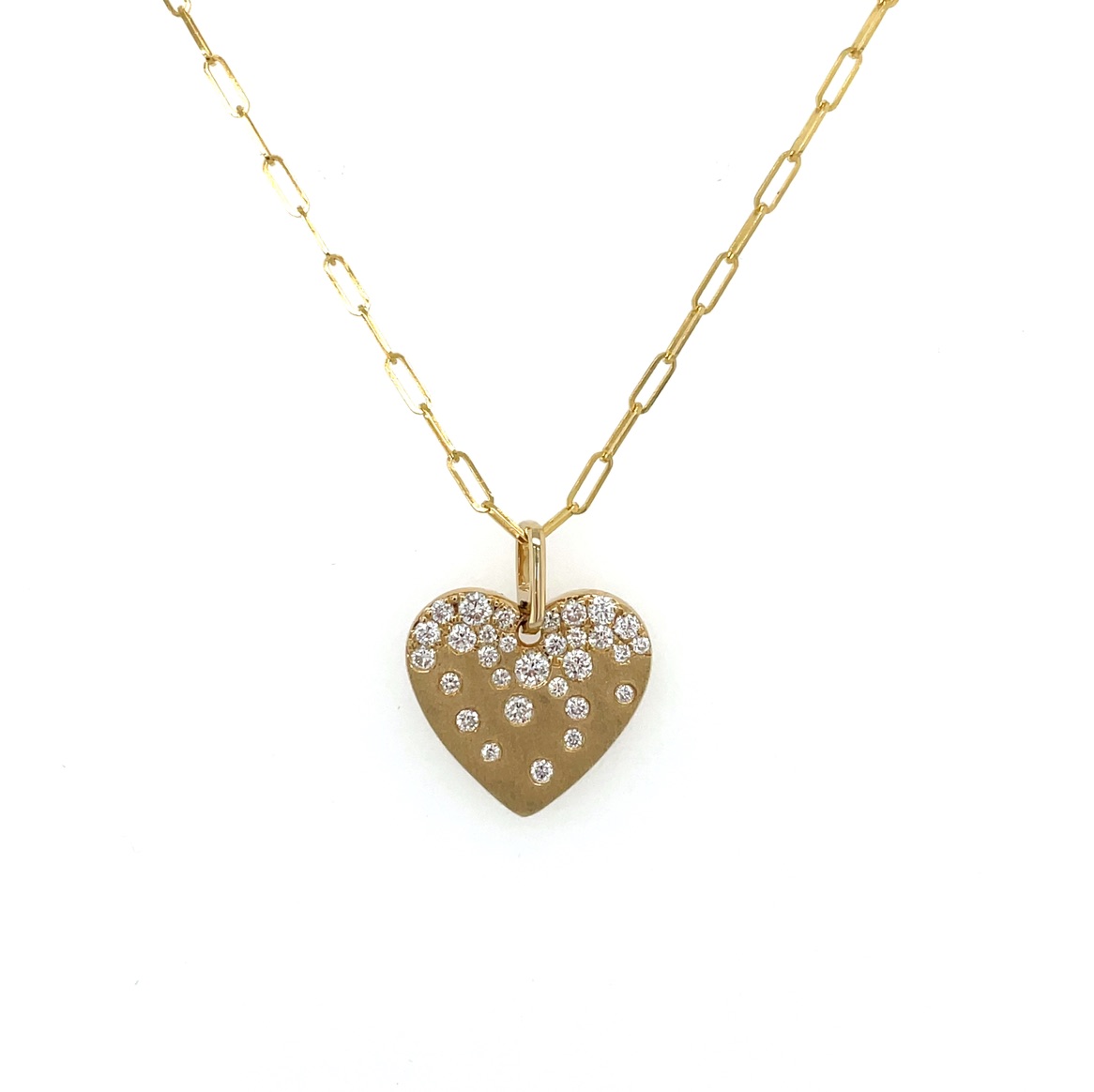 This alluring pendant is suspended from an 18" 14KT yellow gold mini paperclip chain that complements the pendant perfectly. Together, they create a jewelry piece that is both elegant and timeless. The "Confetti Collection" by Dilamani Flush Set Diamond Heart Pendant is a piece that will add a touch of sophistication and glamour to any outfit, making it the perfect gift for that special someone in your life.