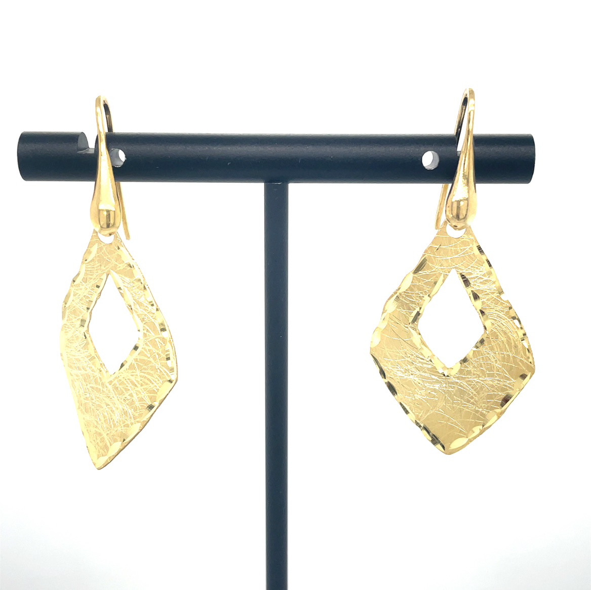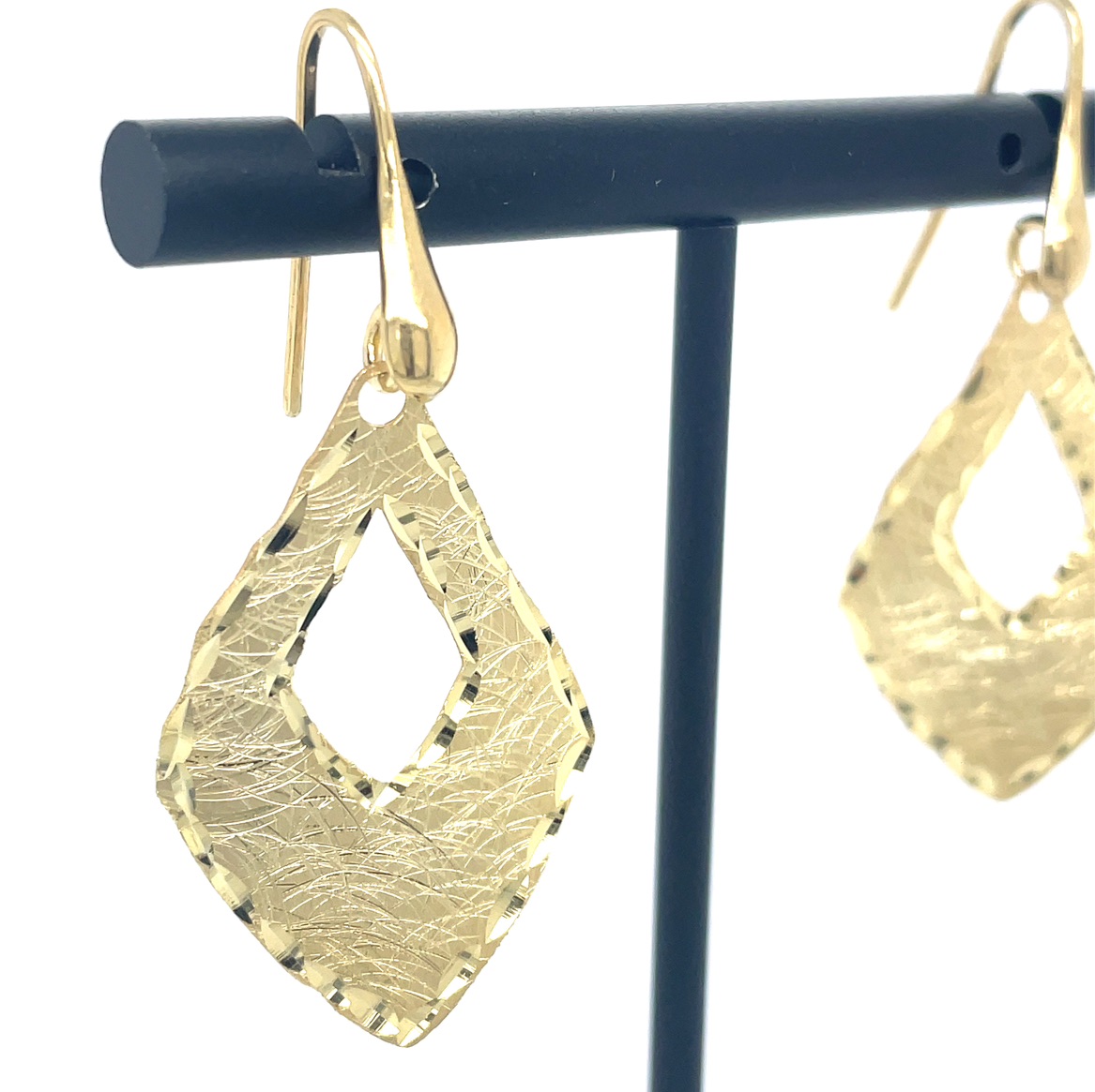 GOLD PLATED STERLING SILVER DIAMOND SHAPE DANGLE EARRINGS WITH SATIN AND DIAMOND CUT FINISH, FRENCH EAR WIRE