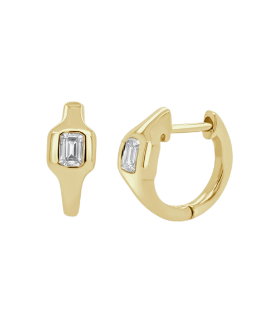 Description 14KY GOLD FLUSH SET EMERALD DIAMOND HUGGIE HOOP EARRINGS 14KT YELLOW GOLD- 585, HIGH POLISH2=.33CTTW EMERALD CUT DIAMONDS G-H COLOR, SI CLARITY, FLUSH SETFIXED POST WITH LOCKING HINGE CLOSURE