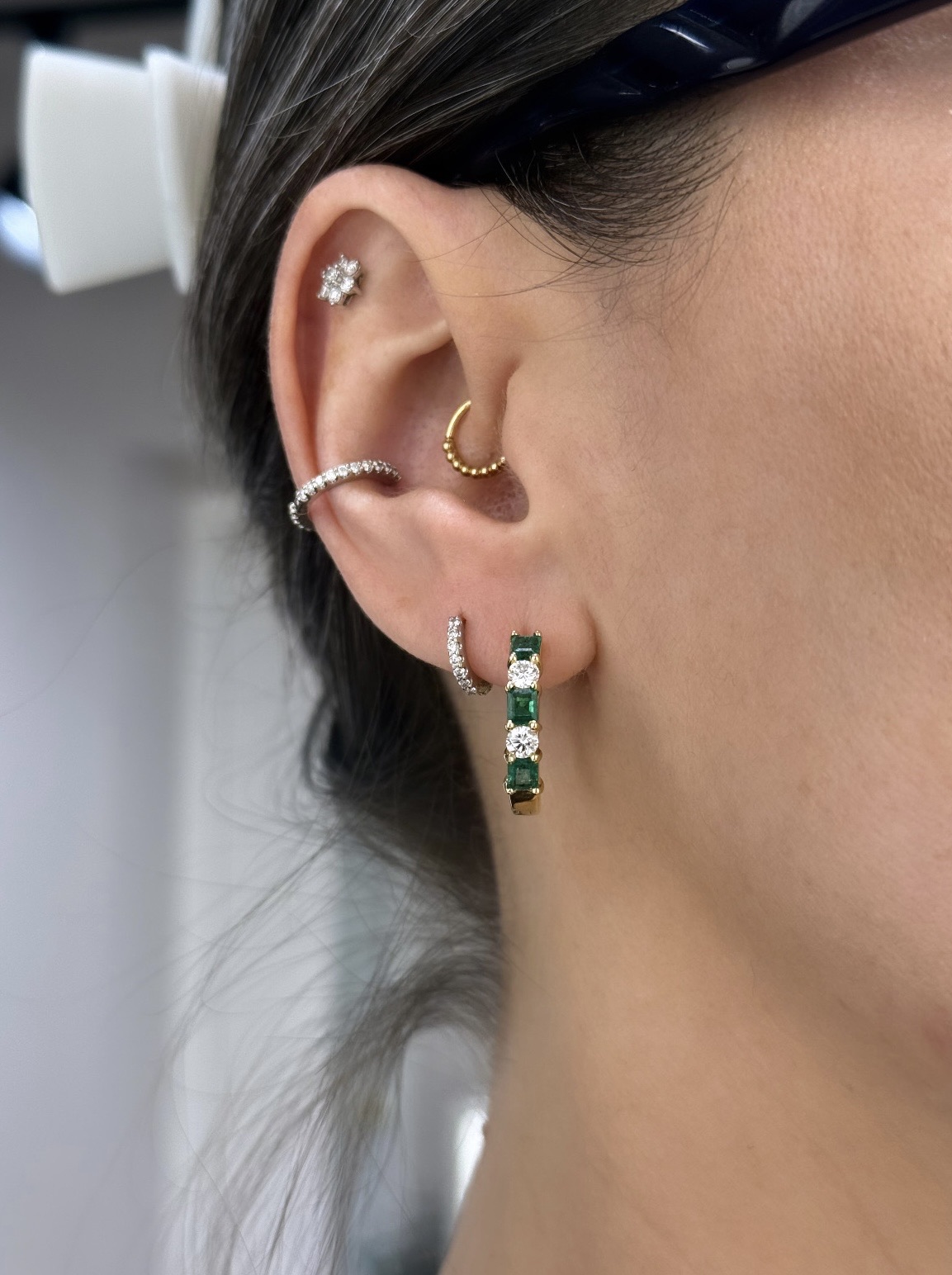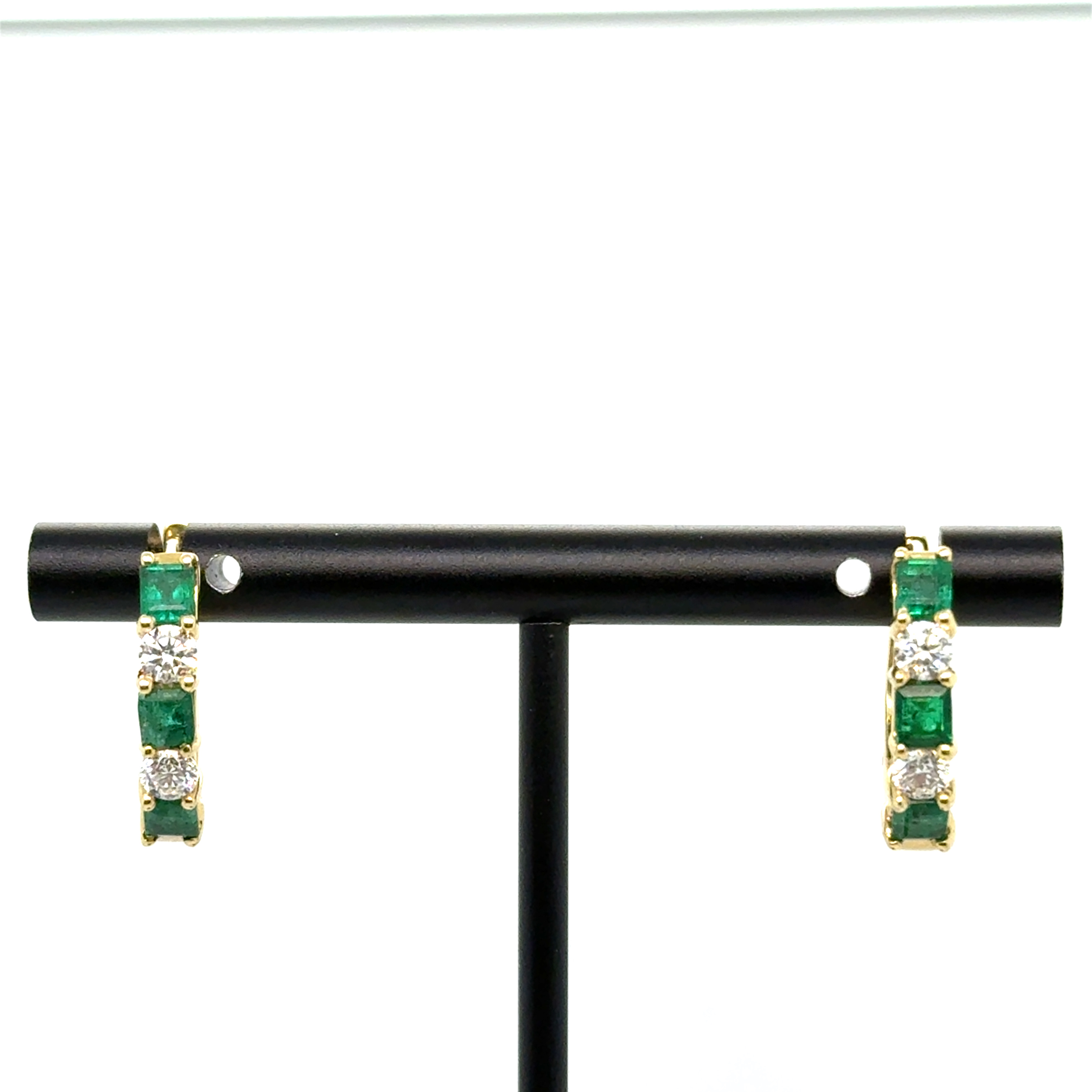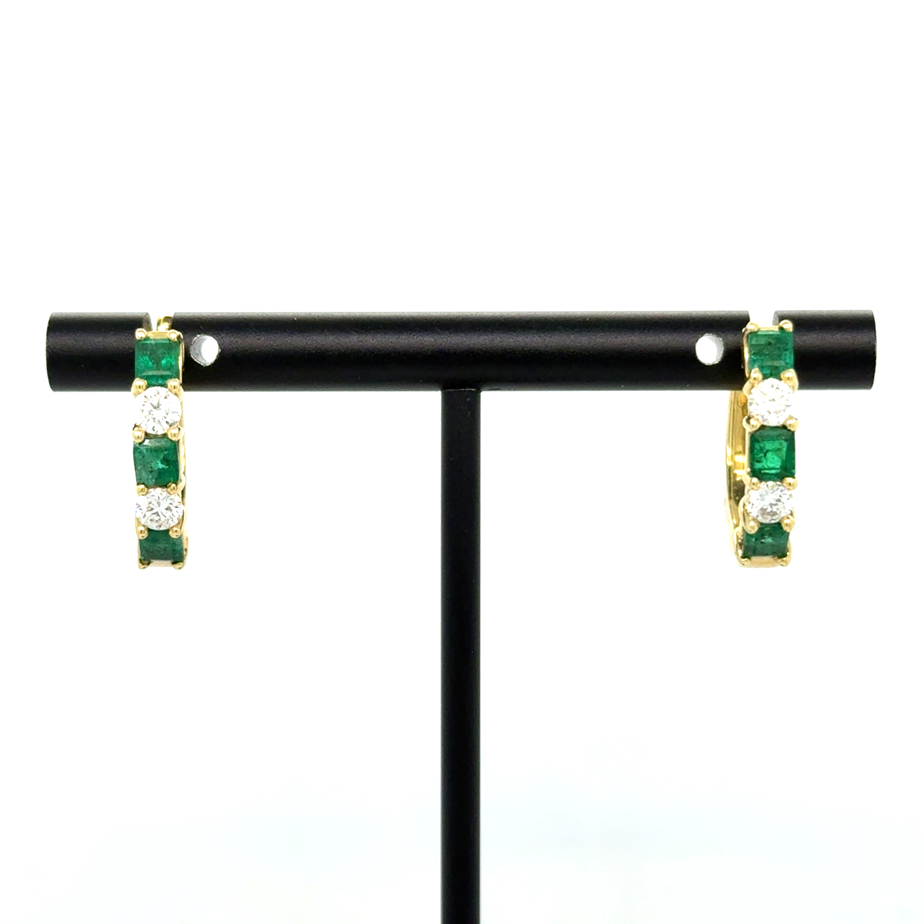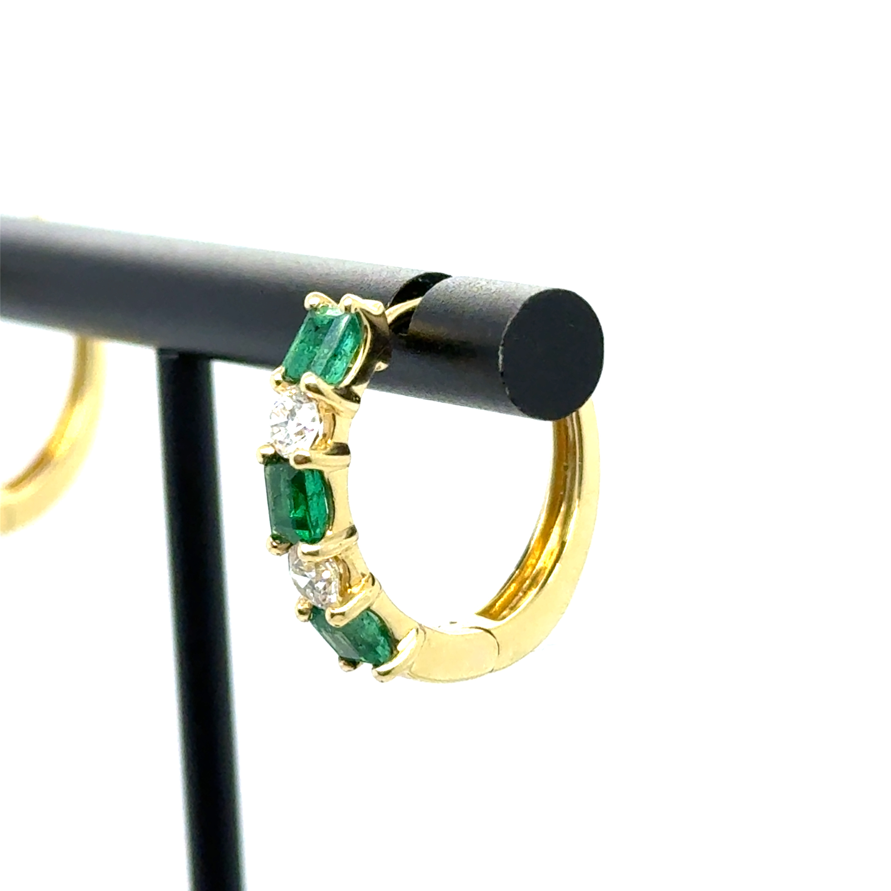 18KY GOLD ALTERNATING STEP-CUT EMERALD & DIAMOND SMALL HOOP EARRINGS