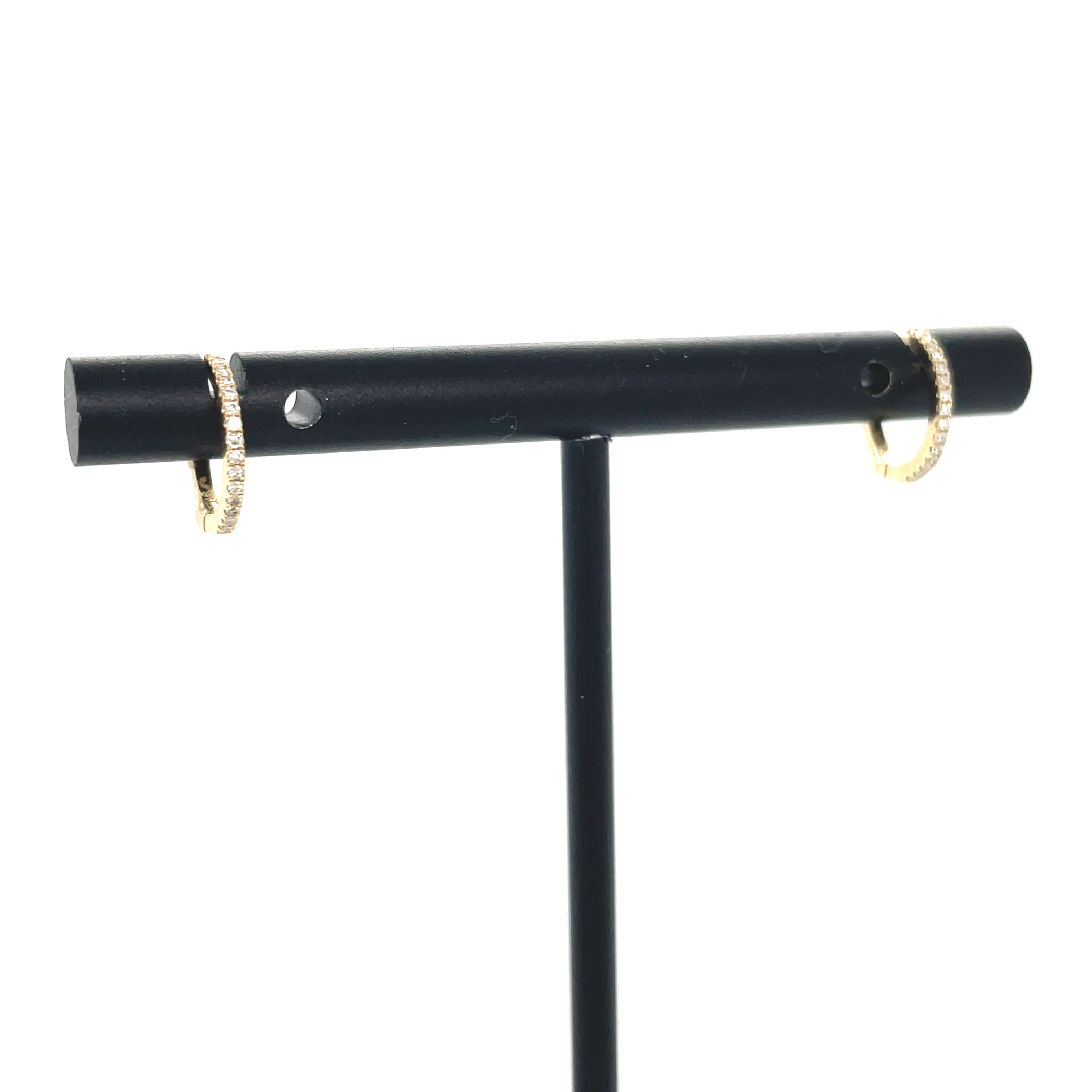 The 14KY Gold 10mm Single Row Diamond Pave Huggie Hoop Earrings are a stunning example of elegant craftsmanship and timeless design. These earrings are meticulously crafted from 14-karat yellow gold, denoted by the 585 hallmark, indicating the gold's purity. The high polish finish enhances the luxurious appearance of the gold, giving it a brilliant shine that complements the sparkle of the diamonds.