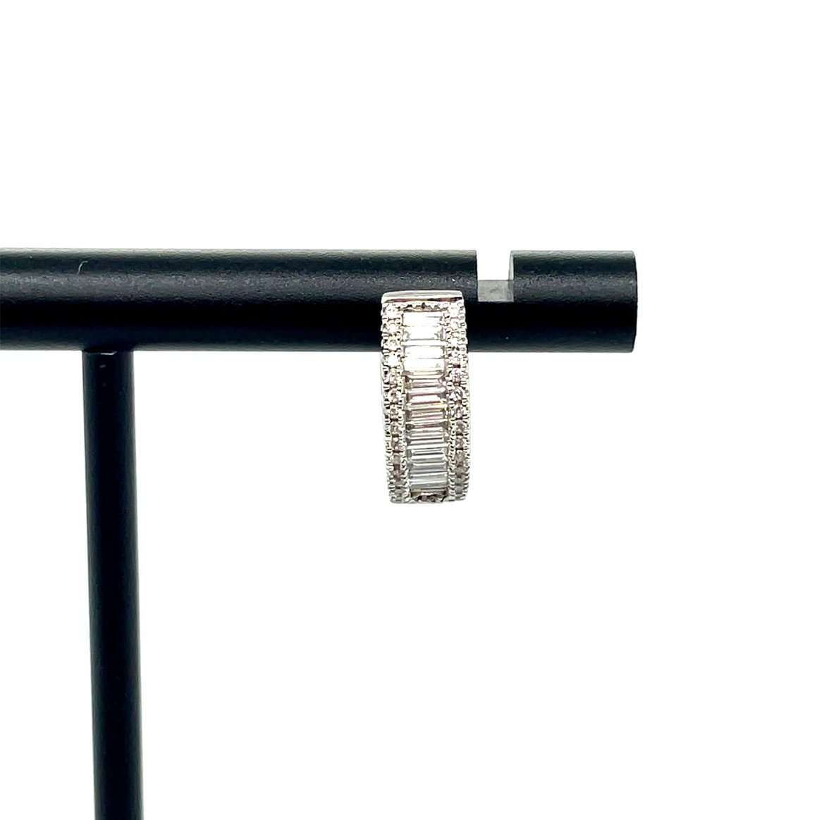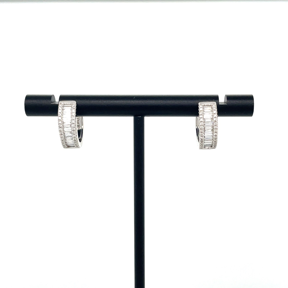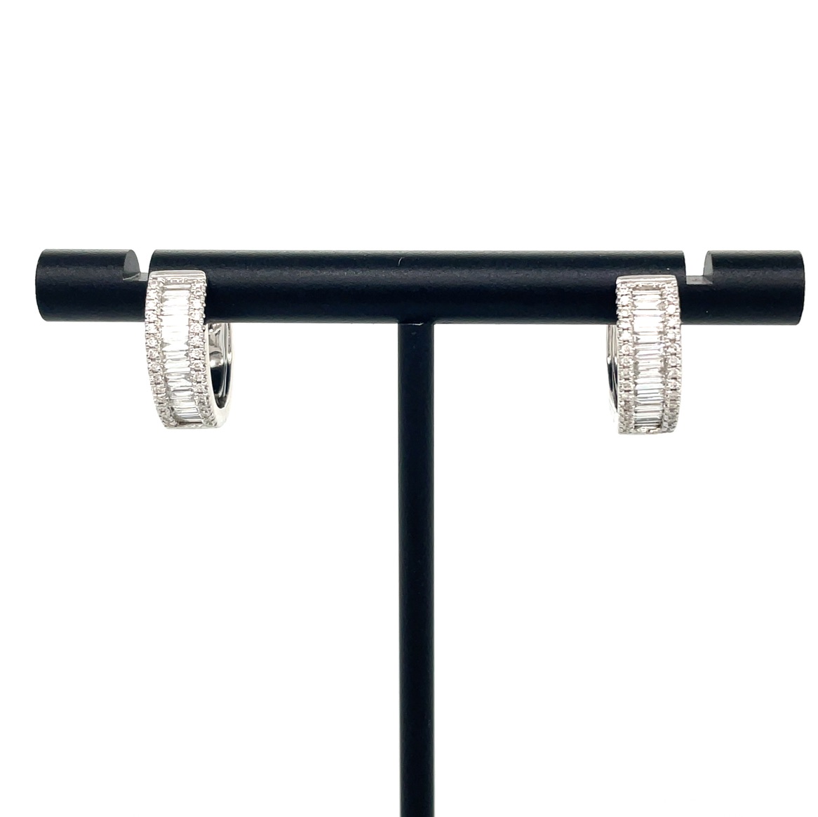 18KW GOLD THREE-ROW DIAMOND HUGGIE-HOOP STYLE EARRINGS FEATURING BAGUETTE DIAMOND CENTER WITH PRONG-SET ROUND DIAMOND RIMS