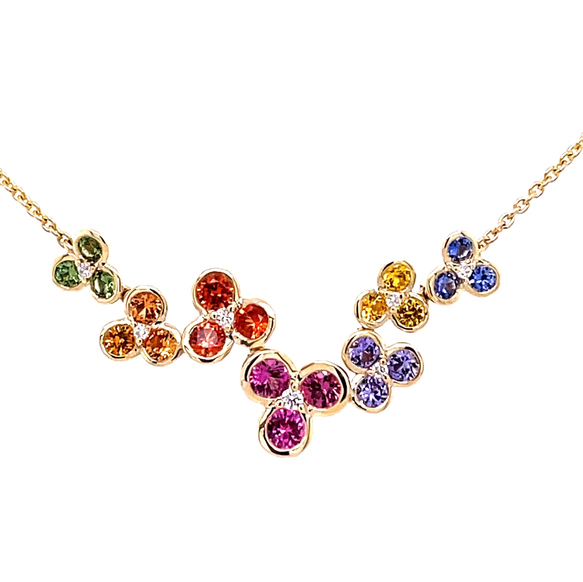 18" 14ky gold multi-color sapphire & diamond flower cluster necklace