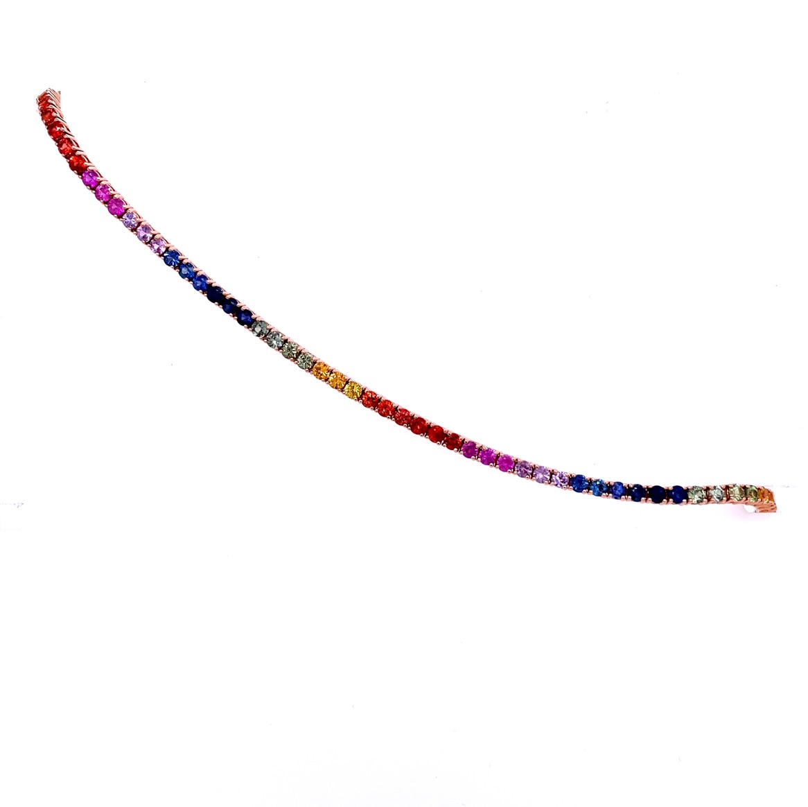 7" 14kr gold rainbow sapphire tennis bracelet featuring 4.33cttw round sapphires with double figure eight safety clasp