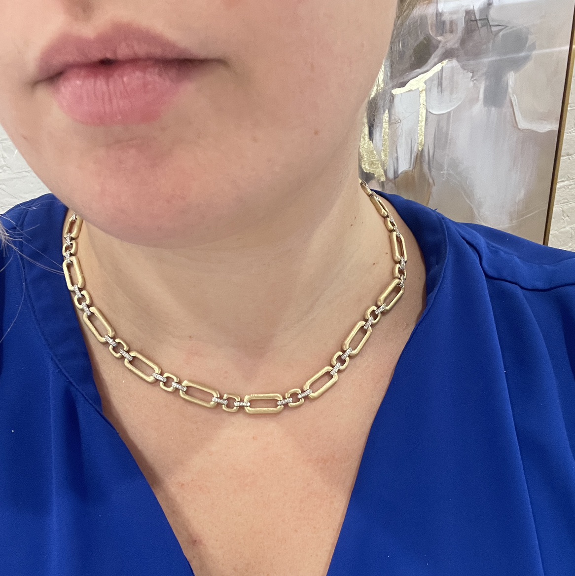 17 1/2" 14KY GOLD GEOMETRIC NECKLACE WITH SATIN FINISH AND DIAMOND ACCENTED LINKS