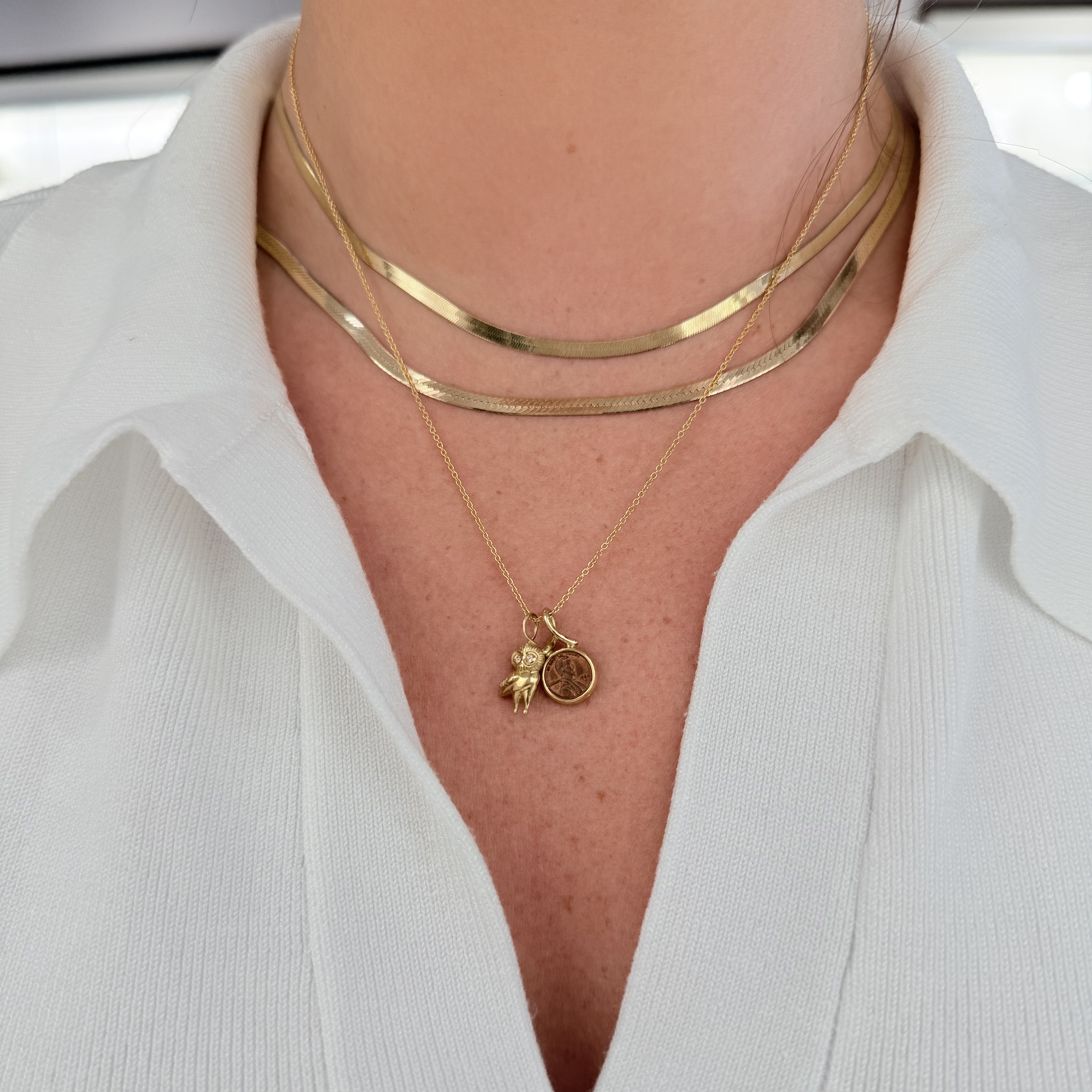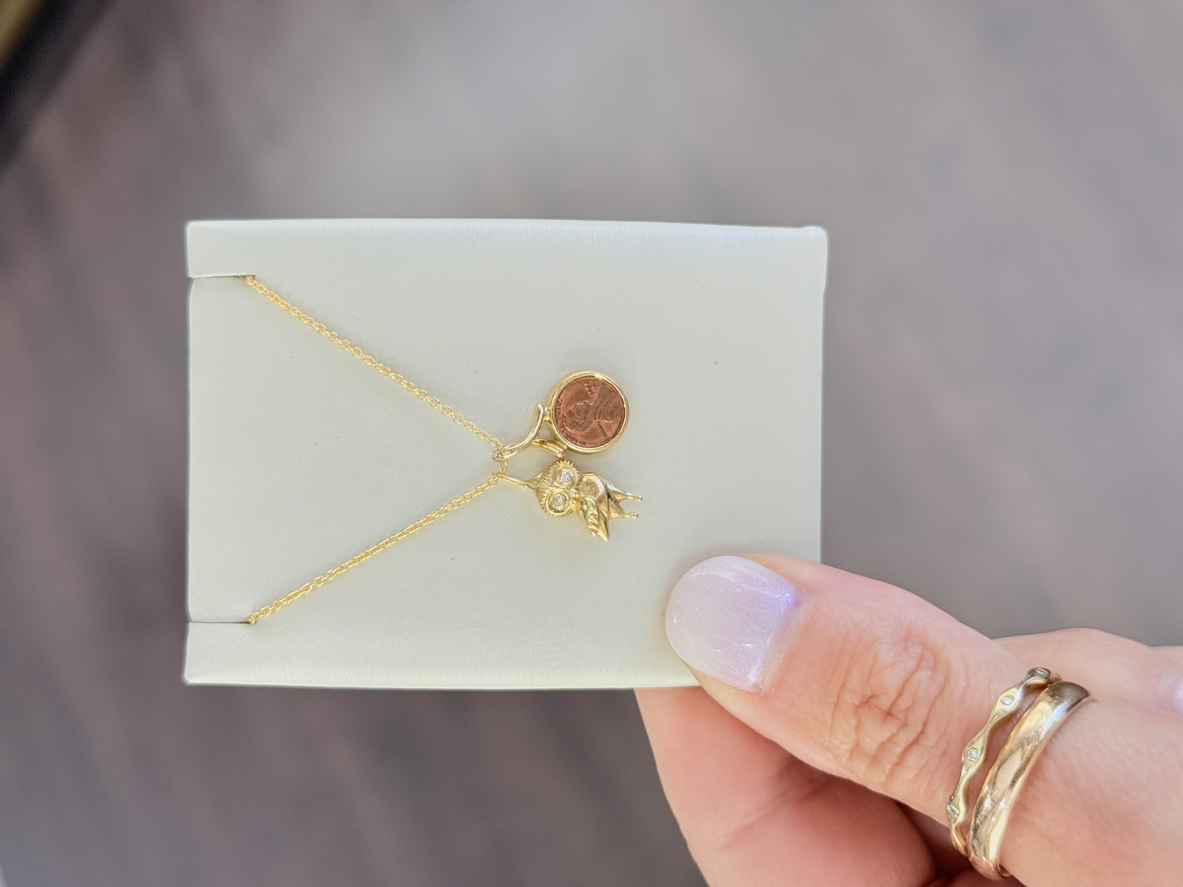 A charming gold owl pendant with diamond eyes, designed in glowing 18kt yellow gold. Owls are symbols of protection, knowledge, and guidance, making this pendant a perfect gift for nature lovers or anyone who appreciates symbolic fine jewelry. Beautifully detailed and set with sparkling diamonds, this piece adds both character and luxury to any collection.