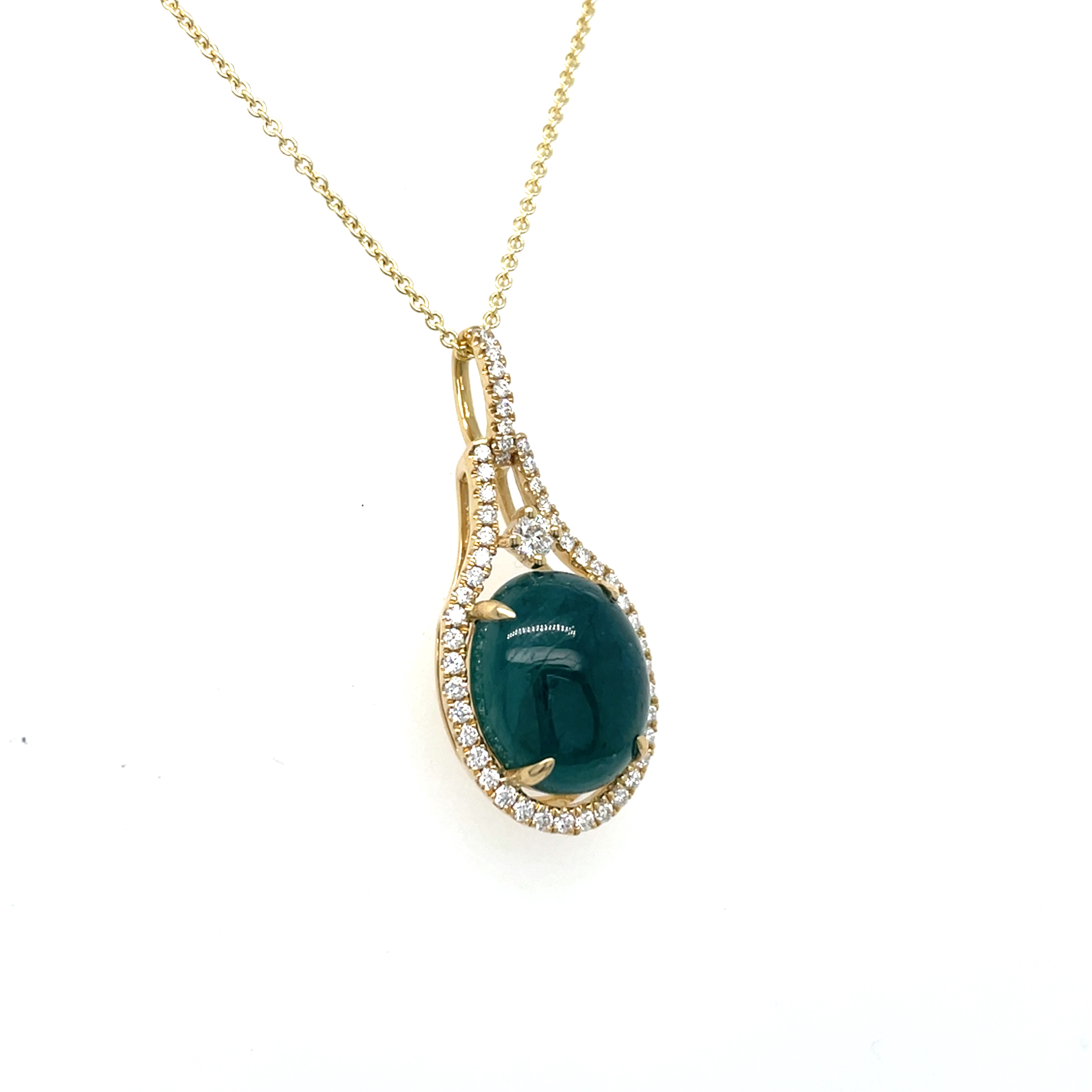 14KY GOLD OVAL CABACHON GRANDIDIERITE PENDANT WITH DIAMOND HALO AND BAIL