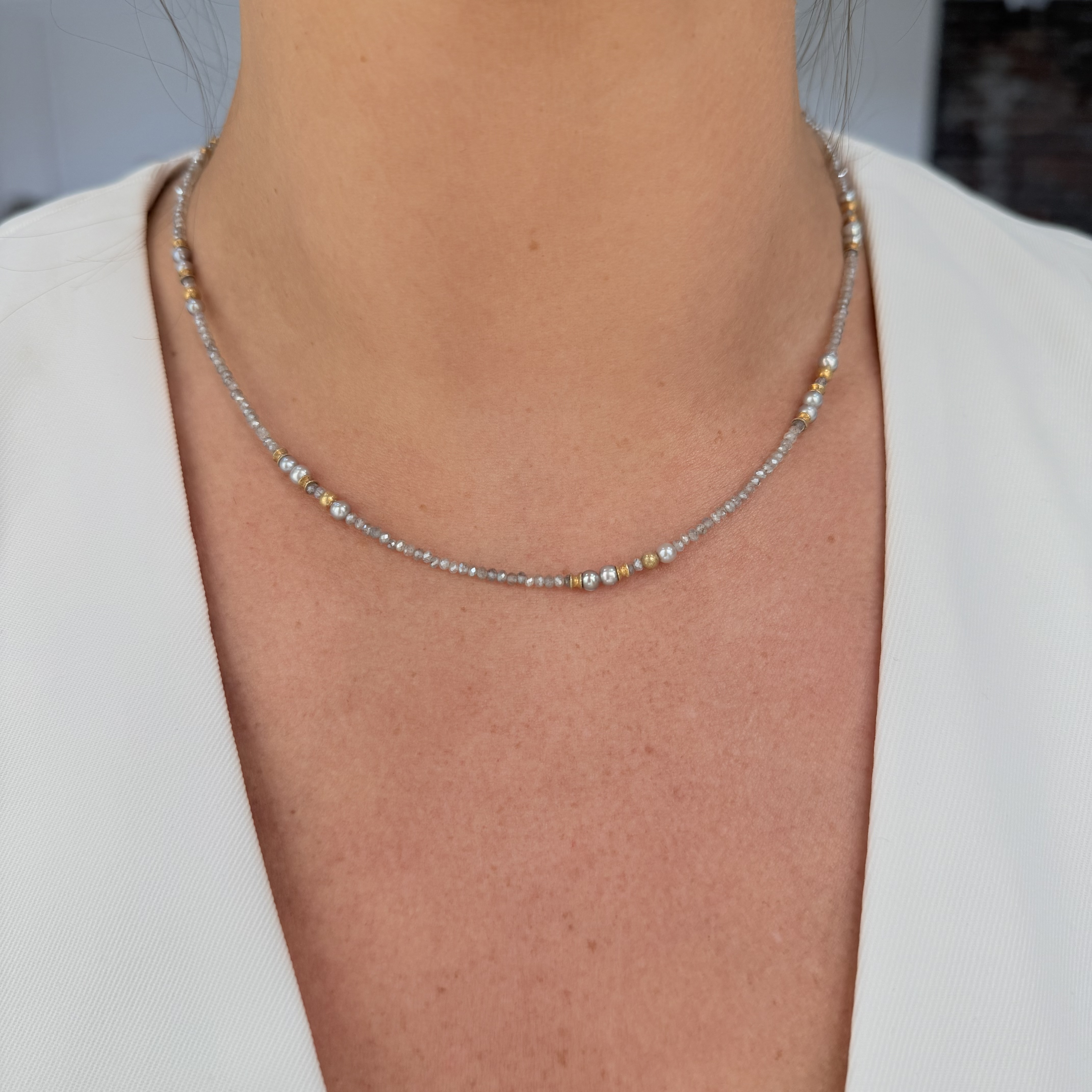 - Gemstones: The necklace features captivating 2mm beads of labradorite and grey pearls.