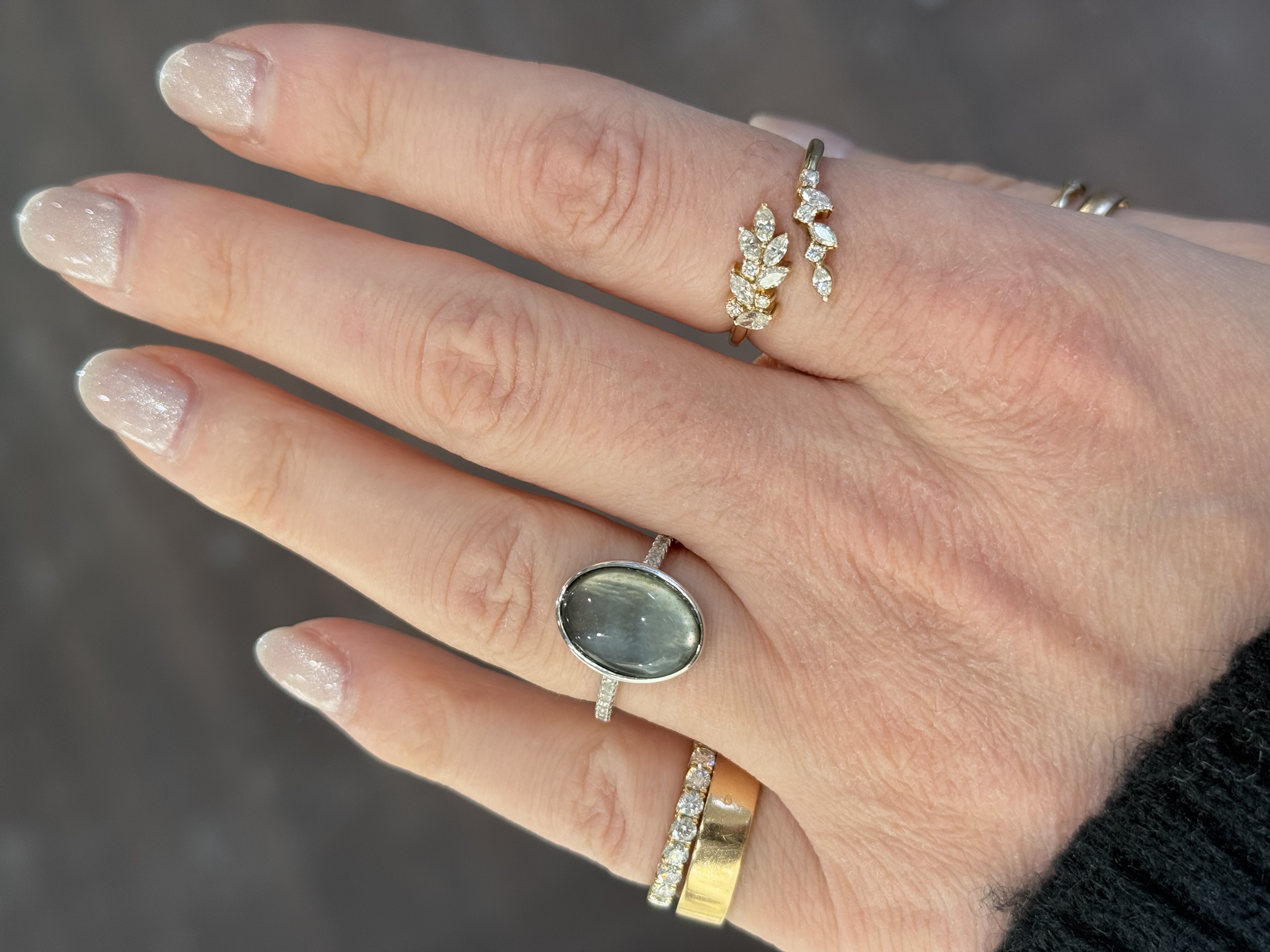 Description STERLING SILVER GRAY MOTHER OF PEARL & WHITE TOPAZ "IZAH" RING STERLING SILVER- 925, HIGH POLISHQTY (1) OVAL GRAY MOTHER OR PEARL, BEZEL SETQTY (14) ROUND WHITE TOPAZ, PRONG SETFINGER SIZE 7