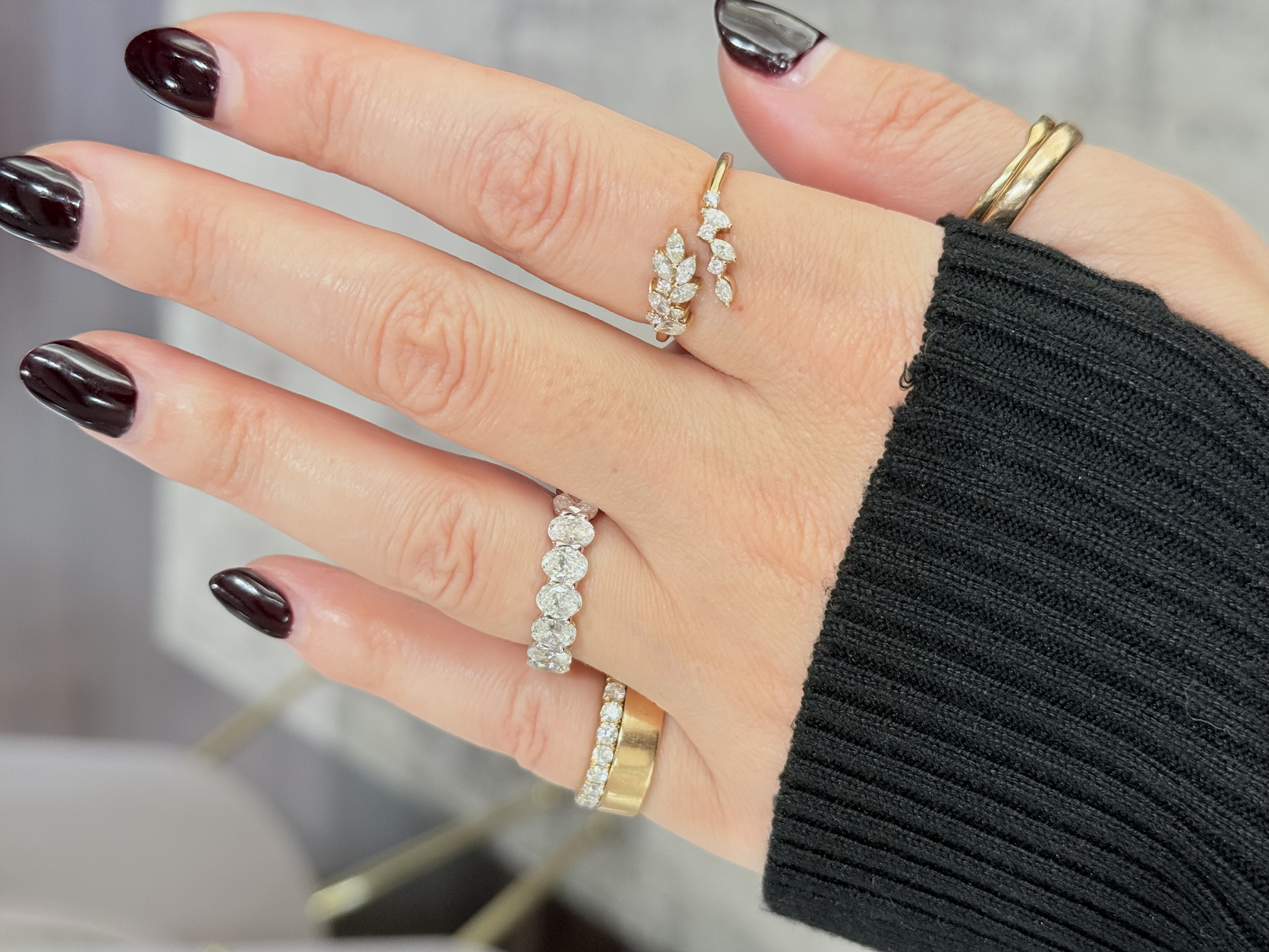 If you’re searching for the perfect oval diamond eternity ring that blends bold sparkle with all-day comfort, this is it. Our newest eternity band sits low on the finger, making it an incredibly comfortable choice for everyday wear. The sleek claw prongs offer a delicate look while securing brilliant diamonds.