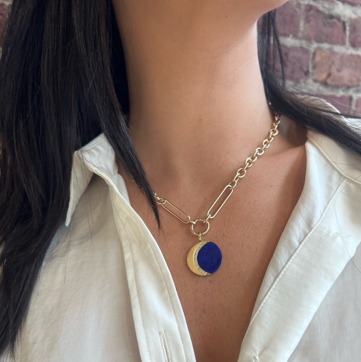 18KY GOLD LAPIS AND DIAMOND MOON PENDANT WITH SATIN FINISH