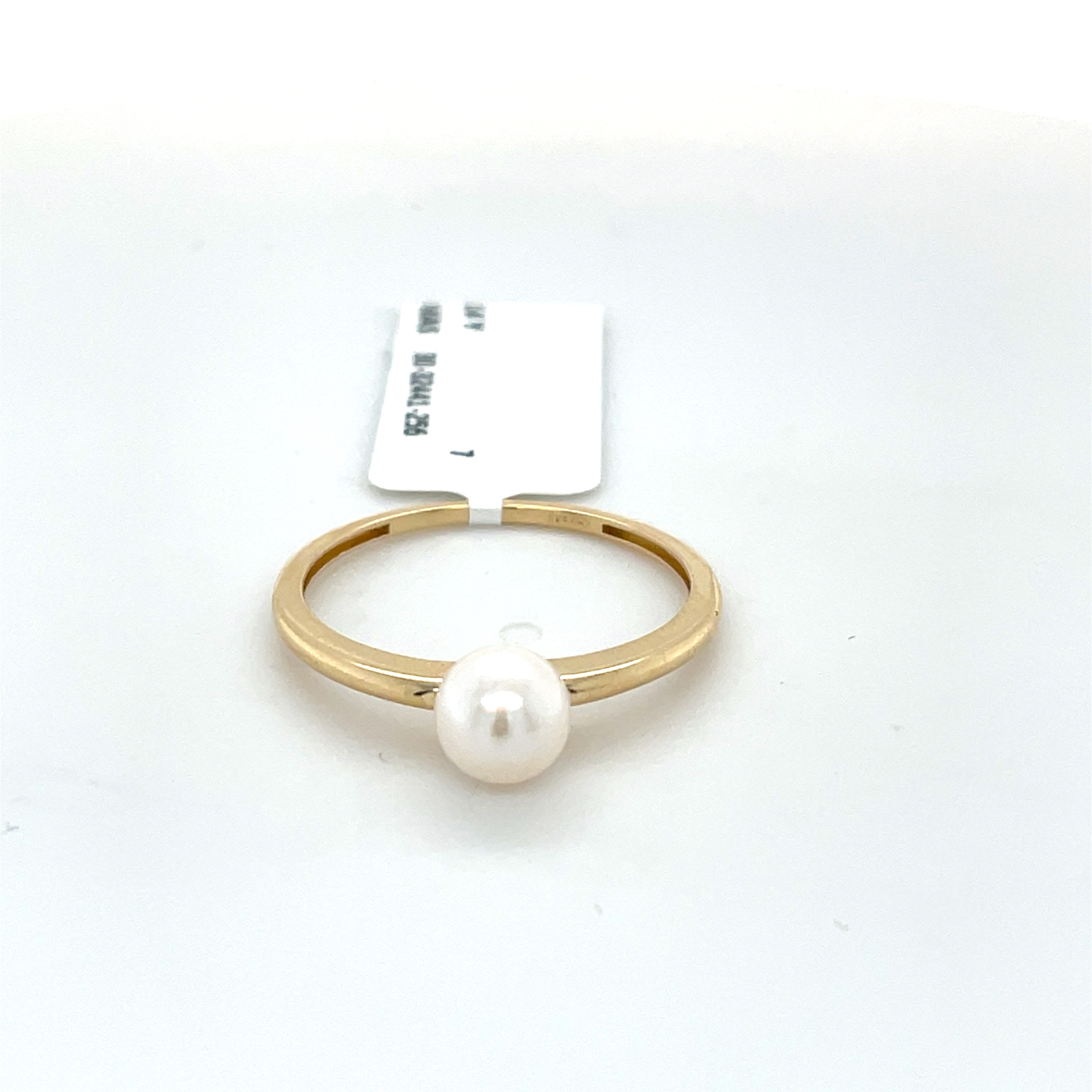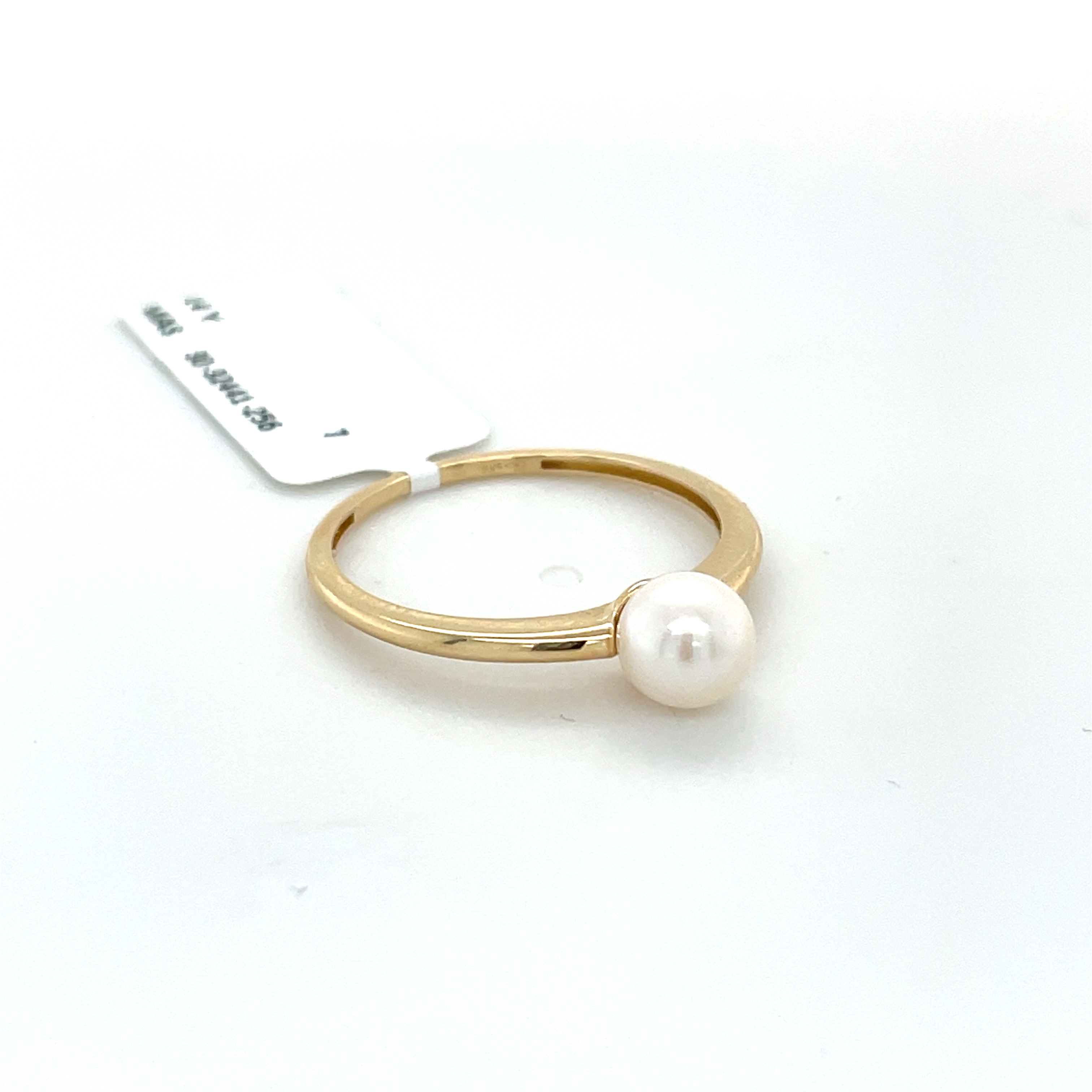 At the heart of this exquisite piece is a single freshwater pearl, sized between 5.5 to 6mm, which has been cultured in warm freshwater environments to ensure its quality and beauty. The pearl's cultivation process is meticulous, allowing for the development of a lustrous nacre that captures the light beautifully, creating a subtle yet captivating glow. Positioned elegantly on the gold band, the pearl serves as the centerpiece of this ring, offering a touch of sophistication and grace.