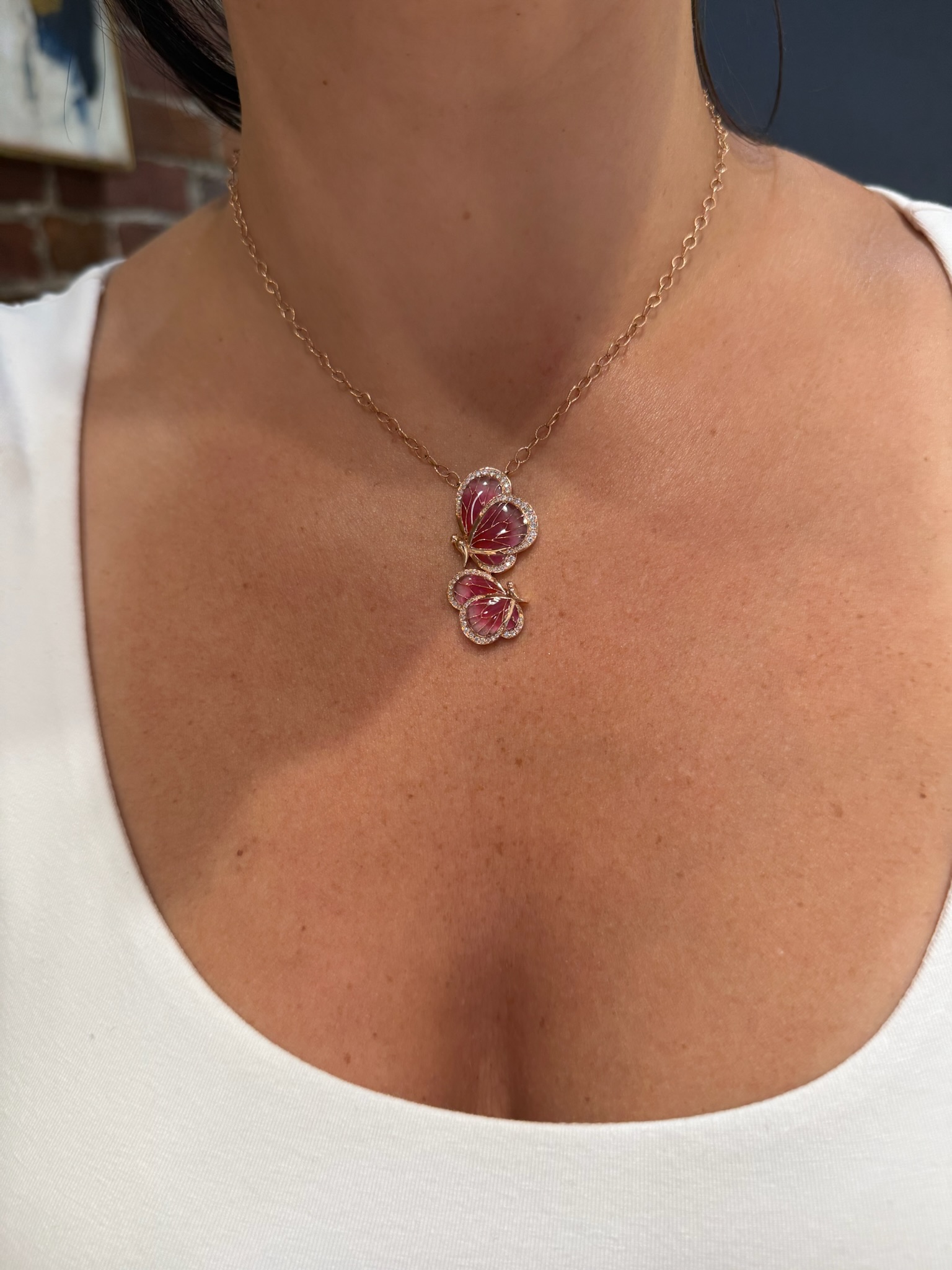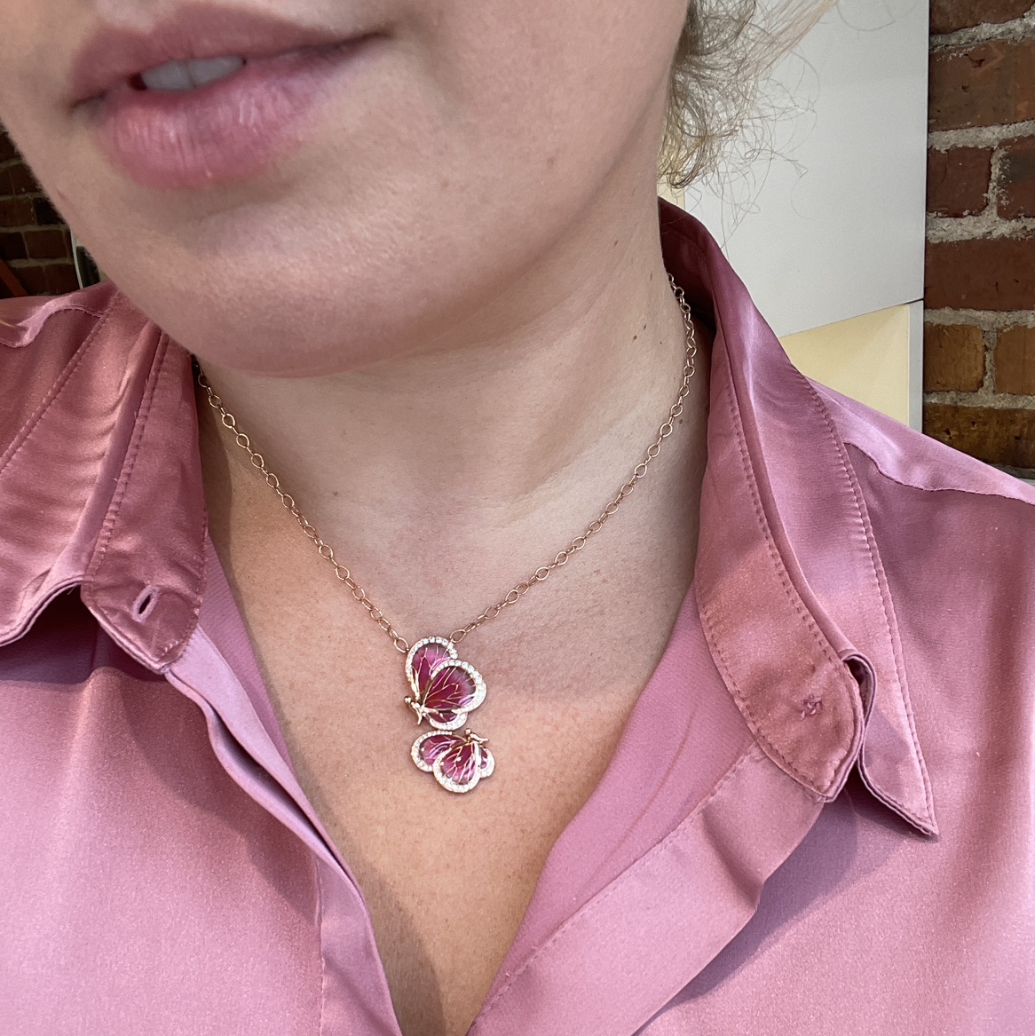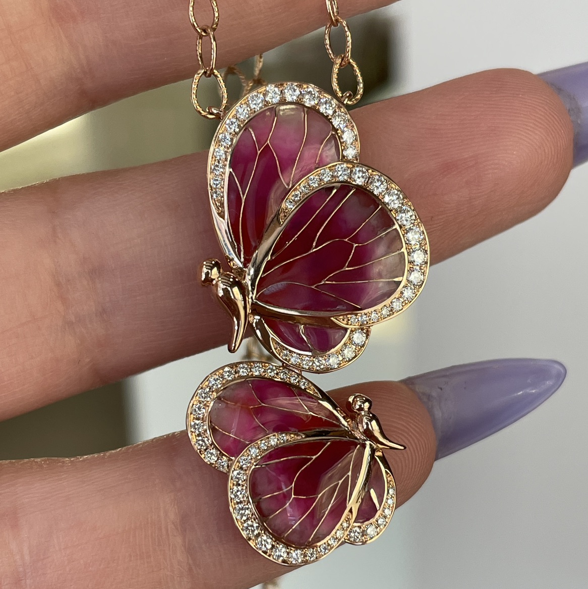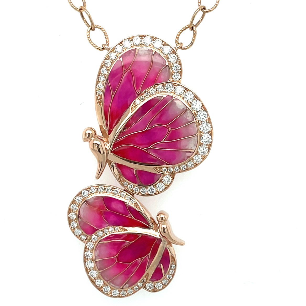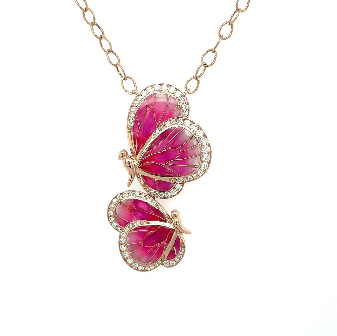 16" 14KR GOLD "LE JARDIN COLLECTION" BY BELLARI™ DOUBLE PINK ENAMEL BUTTERFLY PENDANT WITH DIAMOND ACCENTS