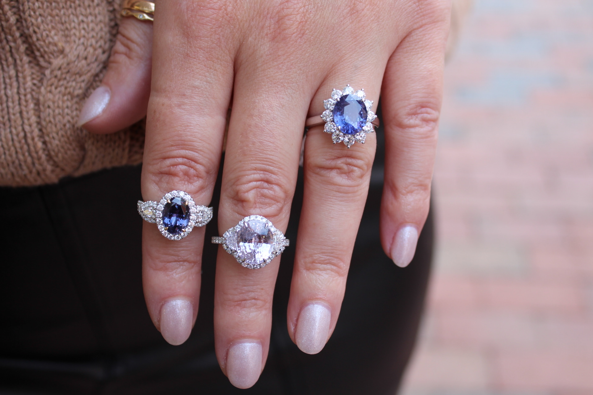 PLATINUM THREE-STONE OVAL LIGHT PURPLE SAPPHIRE & DIAMOND RING
