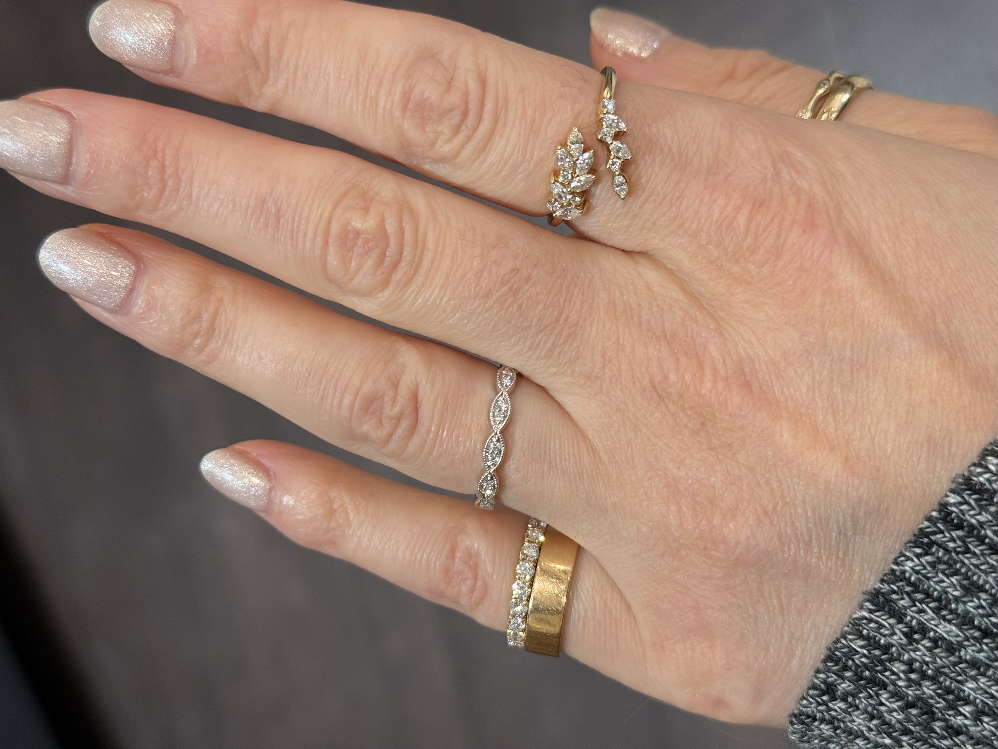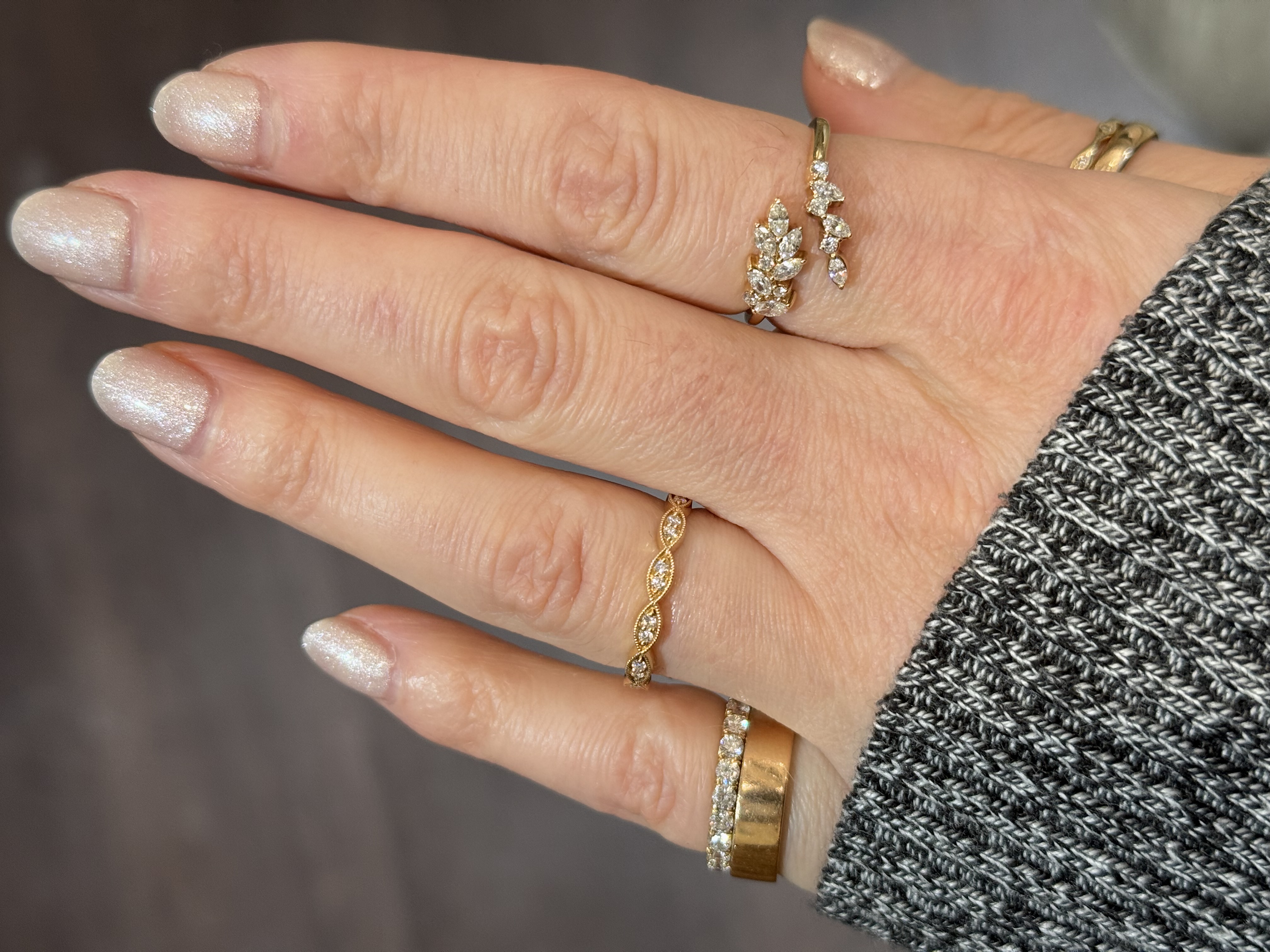- Diamonds: 12 round brilliant cut diamonds, totaling .14 carats