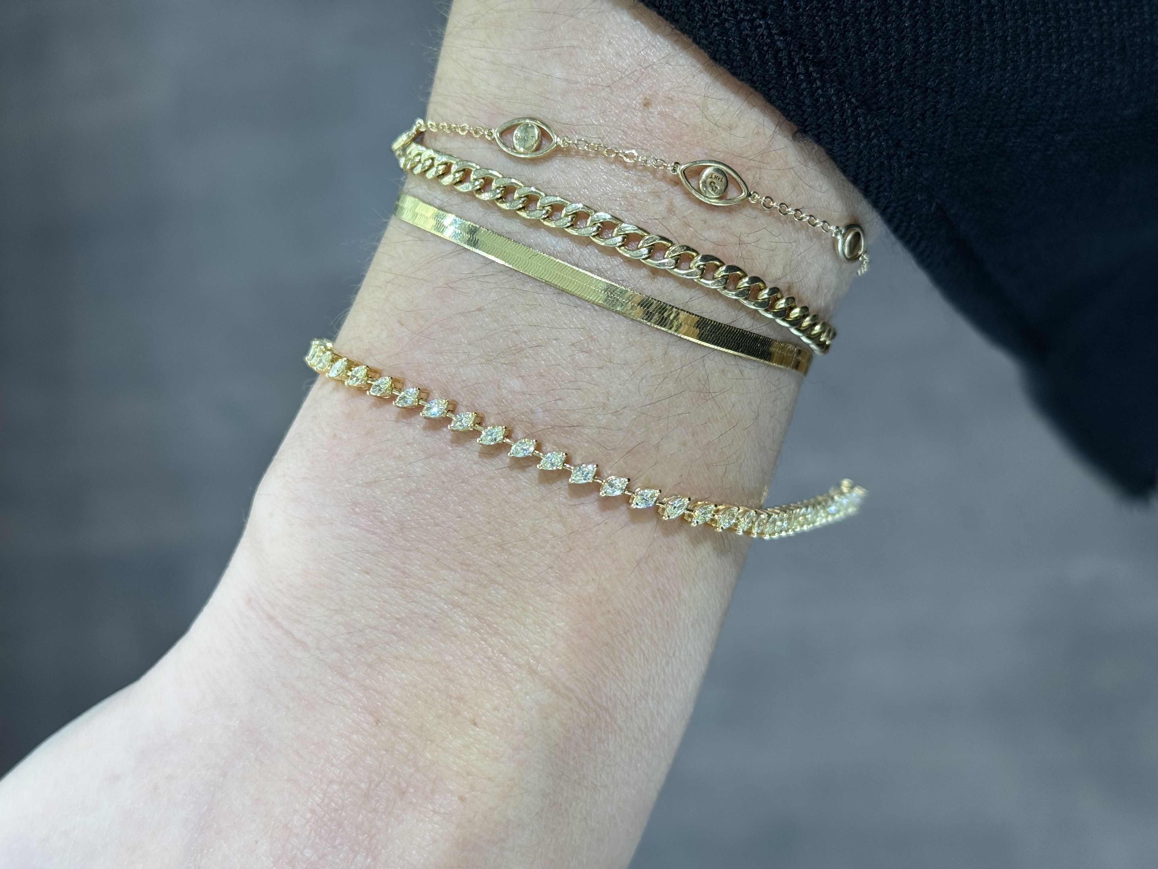 Description 7.25" 18KY GOLD MARQUISE YELLOW DIAMOND TENNIS BRACELET 18KT YELLOW GOLD- 750, HIGH POLISH50=2.03CTTW MARQUISE SHAPE YELLOW DIAMONDS, PRONG SET AT AN ANGLETOTAL LENGTH: 7.25 INCHESHIDDEN BOX CLASP WITH DOUBLE SAFETY LATCH CLOSURE