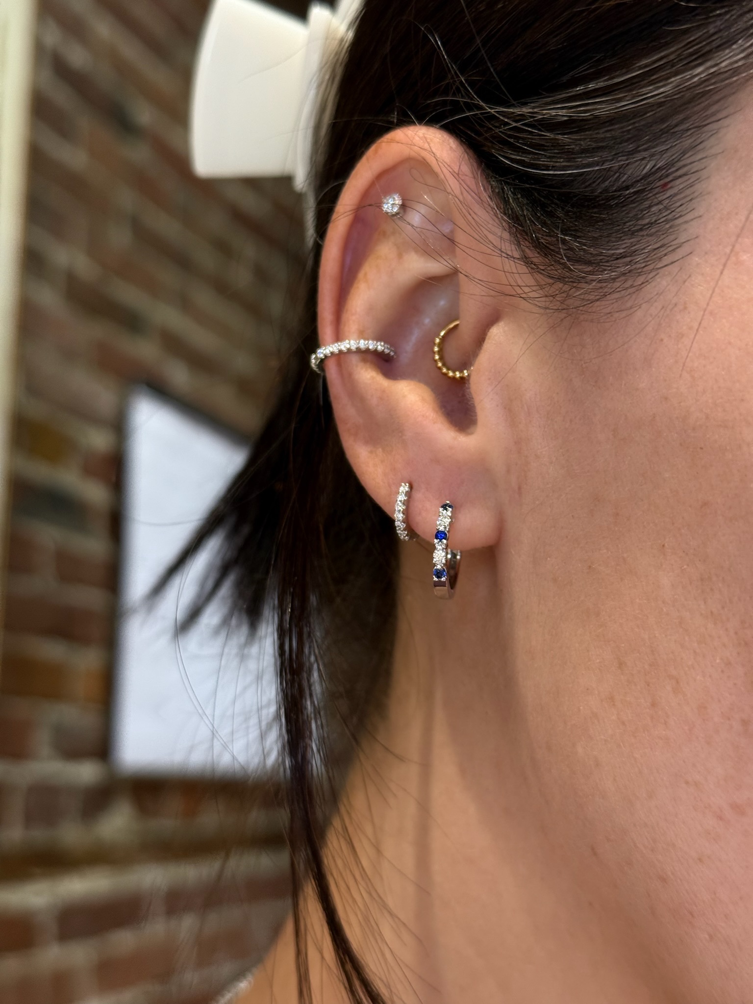 14KW GOLD ALTERNATING BLUE SAPPHIRE & DIAMOND HUGGIE HOOP EARRINGS
