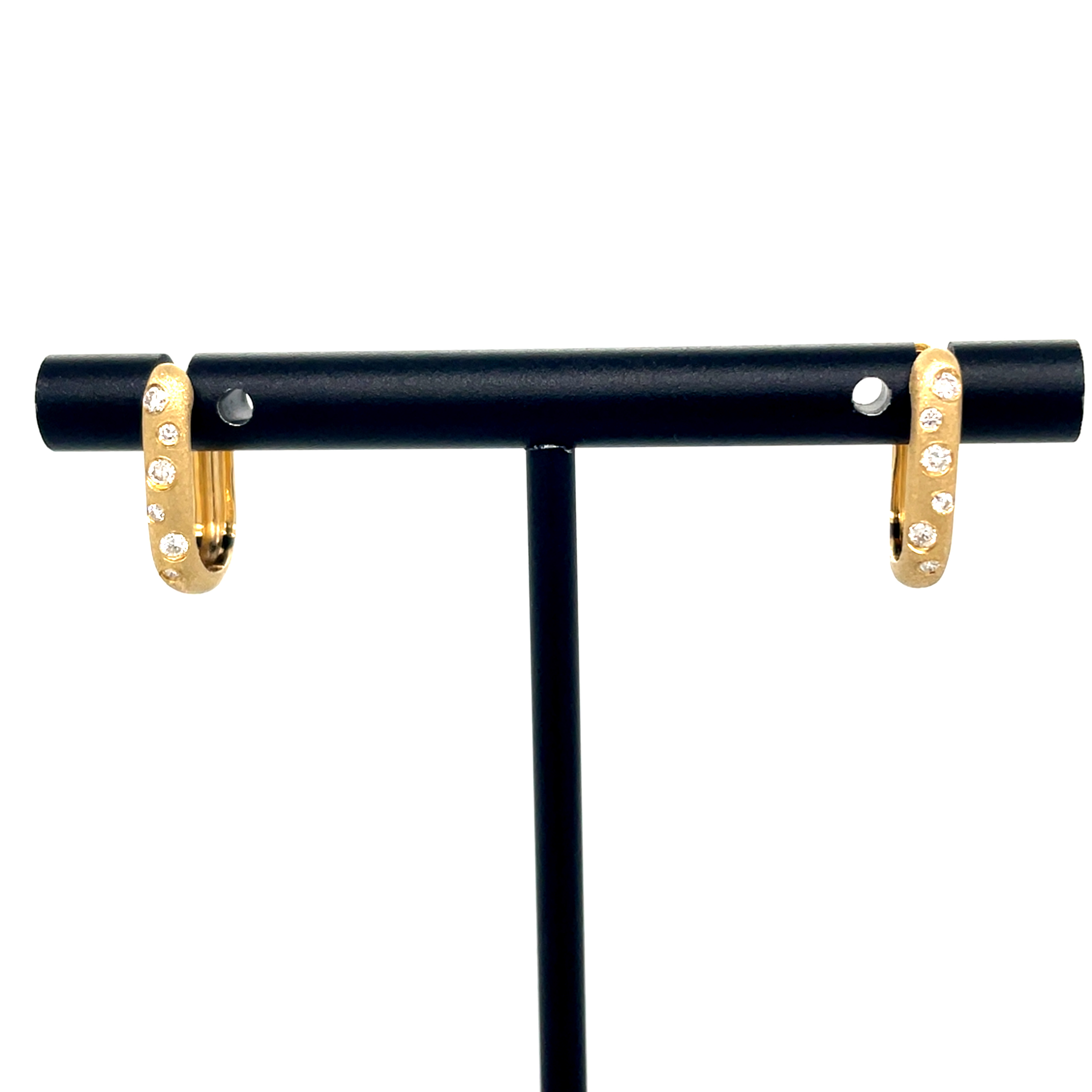 14KY GOLD FLUSH SET SCATTERED DIAMOND ELONGATED HUGGIE EARRINGS WITH SATIN FINISH